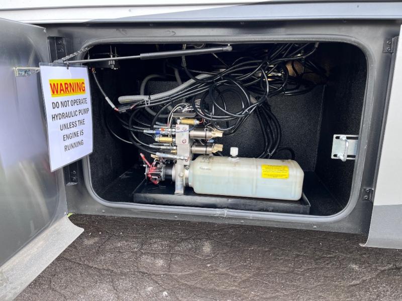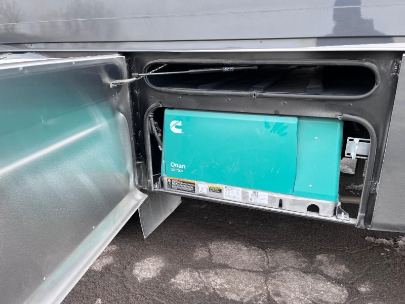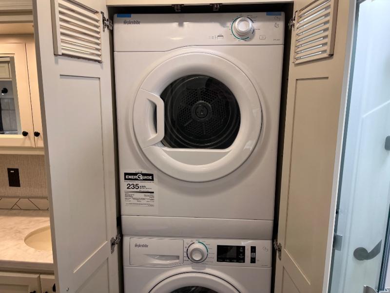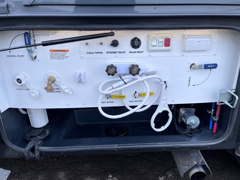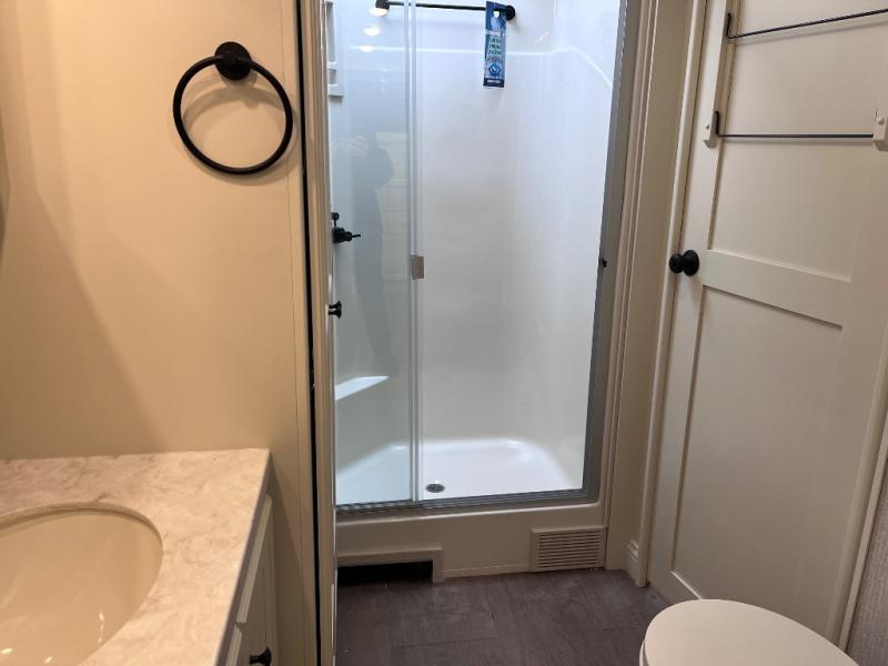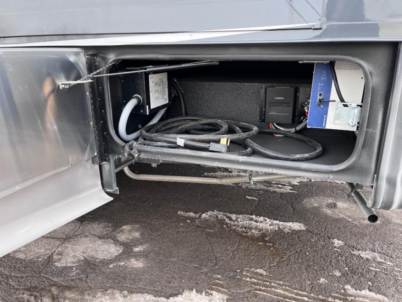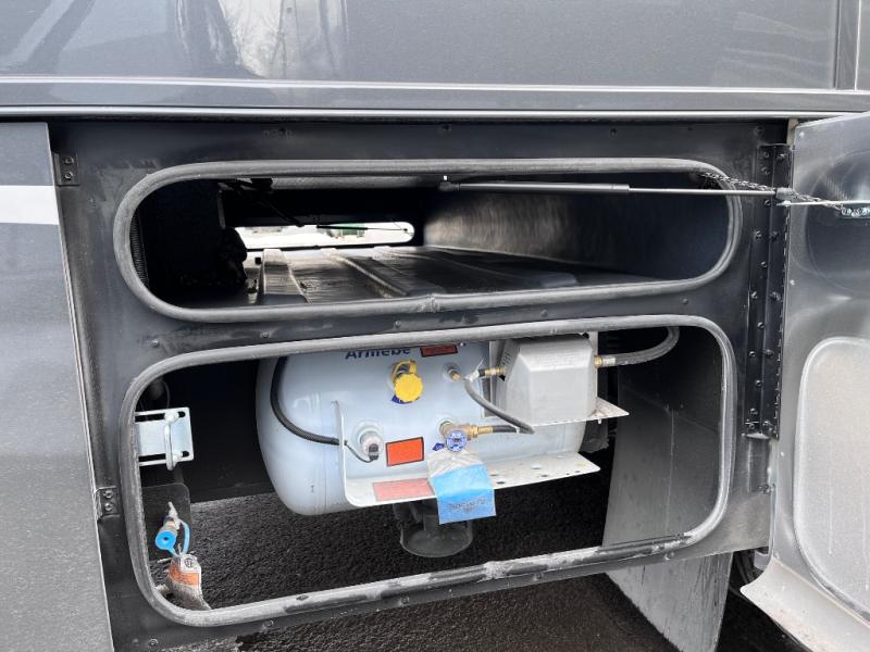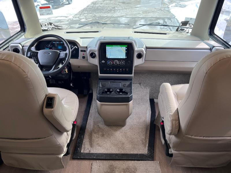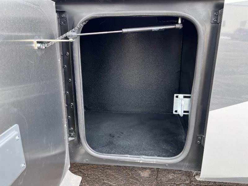 There are many standard luxurious features you will love about this motorhome! It also has many optional features you can add like the optional drop-down front bunk, the optional super sofa and the optional theater seating. The queen bed slide in the rear private bedroom offers a comfortable place to sleep, as well as the flip and fold sofa bed in the living area. You will love the dinette bar with a lift TV, a flip-up countertop, and two chairs that will make this the perfect place to get some work done while you're on the road. The kitchen includes everything you need to prepare meals each day, including a 1.7 cu. ft. smart convection microwave with an air fryer, a three burner liquid propane cooktop, and a 23 cu. ft. stainless steel residential refrigerator with French doors and a bottom freezer. Head to the rear master bedroom with a queen bed slide out, a large wardrobe, a cabinet with a TV and drawers below, plus a private entrance into the dual entry bath!