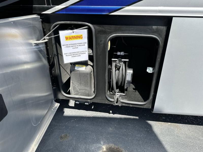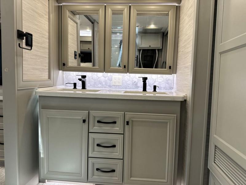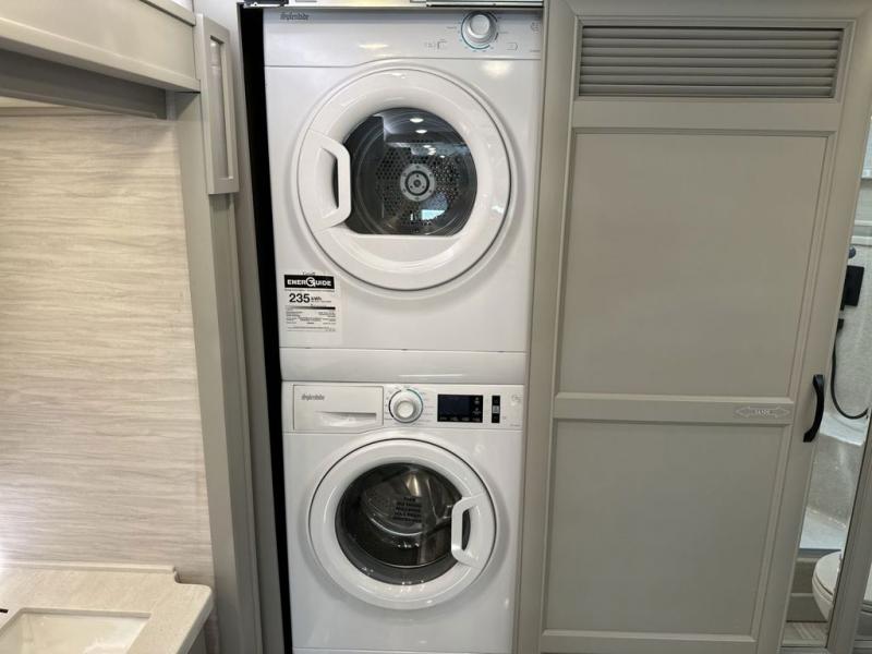 Travel the country with this comfortable motorhome! The full rear bathroom will have you feeling right at home with the dual sink vanity that has a tri-view mirror, a shower with a seat, and a closet with has an area prepped to add an optional stacked washer and dryer. Get a good night's rest on the 72" x 80" king bed slide with nightstands on either side across from stacked drawers and a mounted bedroom TV. You will have everything you need to prepare delicious home cooked meals including a smart convection microwave with an air fryer, storage drawers for ingredients, and you can even add an optional drawer-type dishwasher to make clean up easier. The air coil sofa bed offers another comfortable sleeping space for a guest or two, plus you can add an optional drop-down front bunk for even more sleeping space. This model also includes a dinette with chairs and an optional fireplace if you want to make your space even more cozy!
