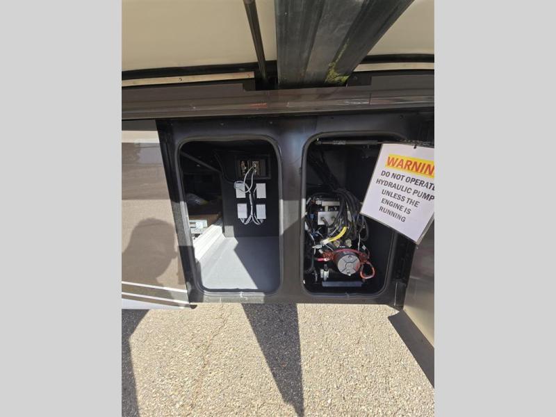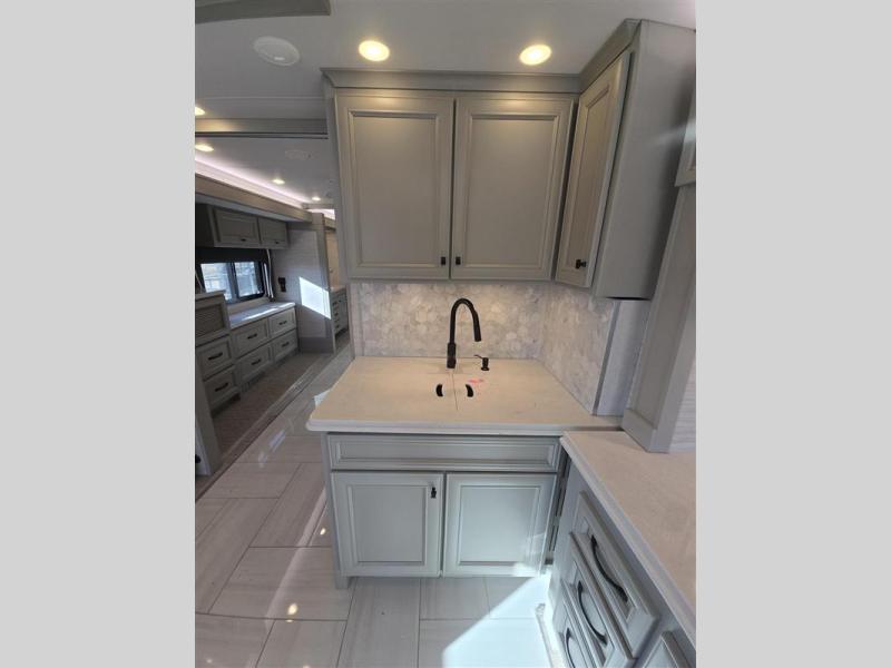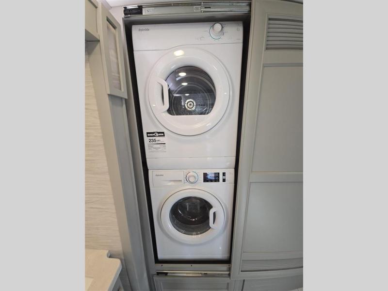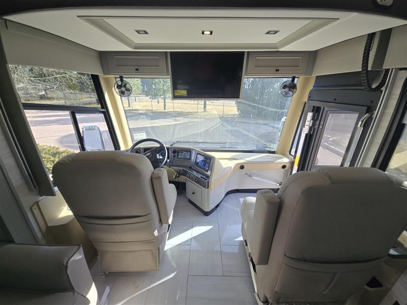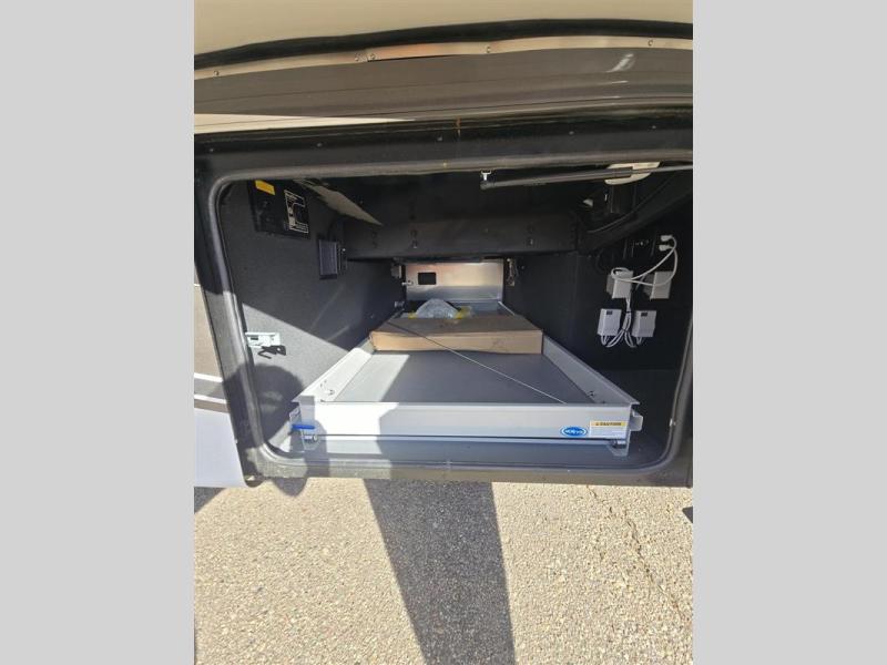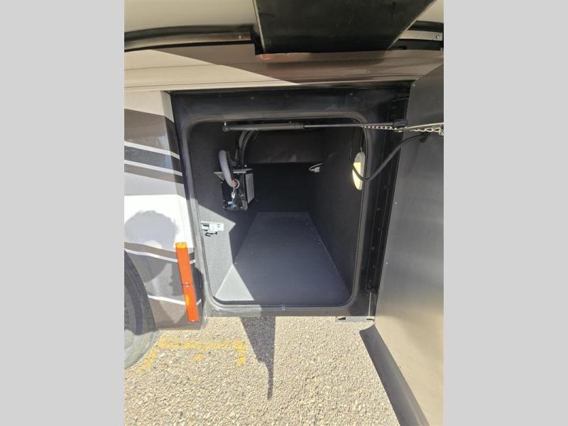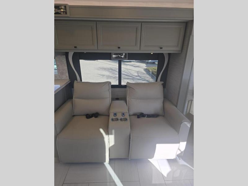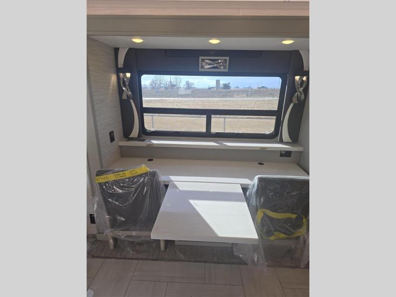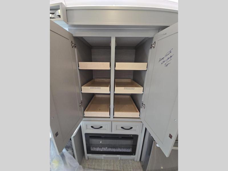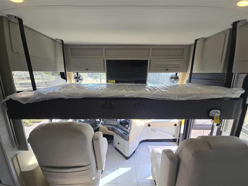 Travel the country with this comfortable motorhome! The full rear bathroom will have you feeling right at home with the dual sink vanity that has a tri-view mirror, a shower with a seat, and a closet with has an area prepped to add an optional stacked washer and dryer. Get a good night's rest on the 72" x 80" king bed slide with nightstands on either side across from stacked drawers and a mounted bedroom TV. You will have everything you need to prepare delicious home cooked meals including a smart convection microwave with an air fryer, storage drawers for ingredients, and you can even add an optional drawer-type dishwasher to make clean up easier. The air coil sofa bed offers another comfortable sleeping space for a guest or two, plus you can add an optional drop-down front bunk for even more sleeping space. This model also includes a dinette with chairs and an optional fireplace if you want to make your space even more cozy!