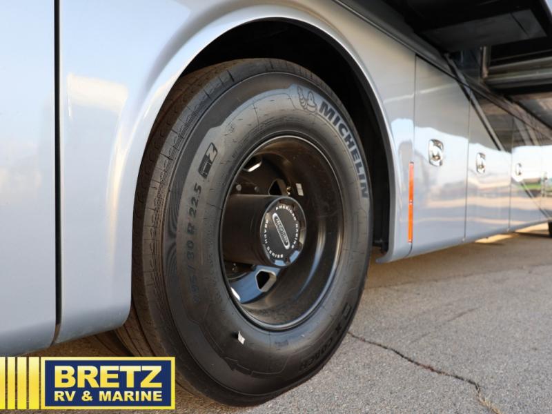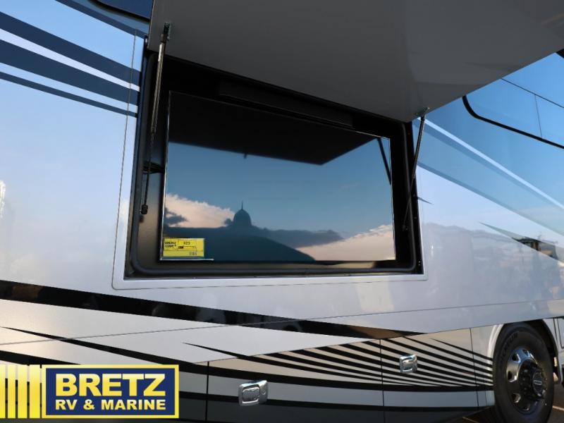 You will feel right at home in this coach with a master suite and king bed slide, mounted TV, laundry hamper, and stacked drawers. You all have quick access to the full rear bathroom. The bathroom not only has a dual sink vanity with a tri-view mirror for two to get ready at once, but also a shower with a seat and a large closet with an area next to it prepped to add an optional washer and dryer. The chef can prepare their best meals either indoors with the countertop extension and cooktop with convection microwave or outside if you add the optional outdoor grill. You can even watch the big game outside with the exterior TV with a sound bar!