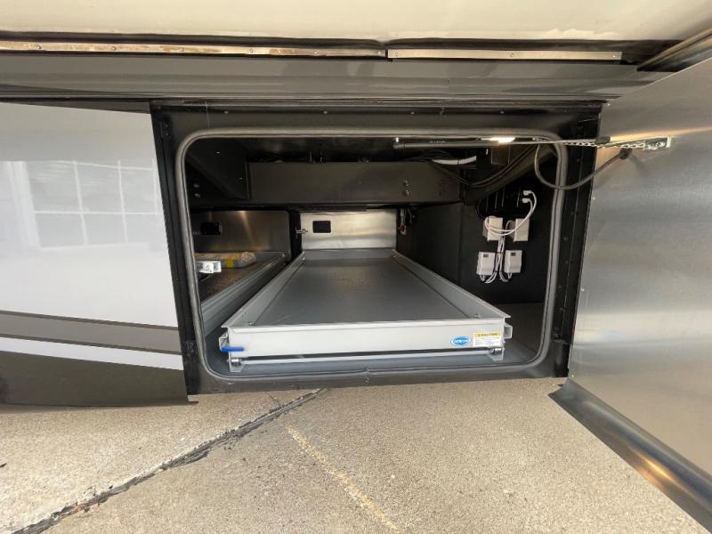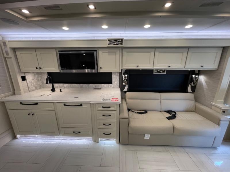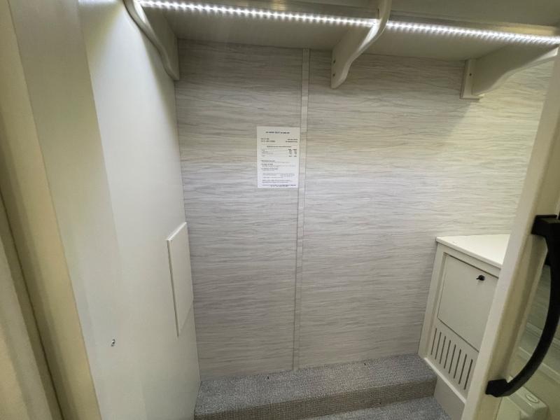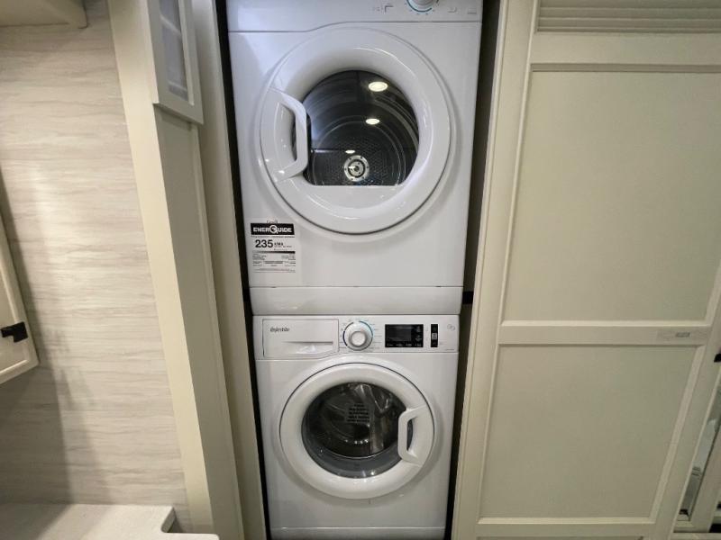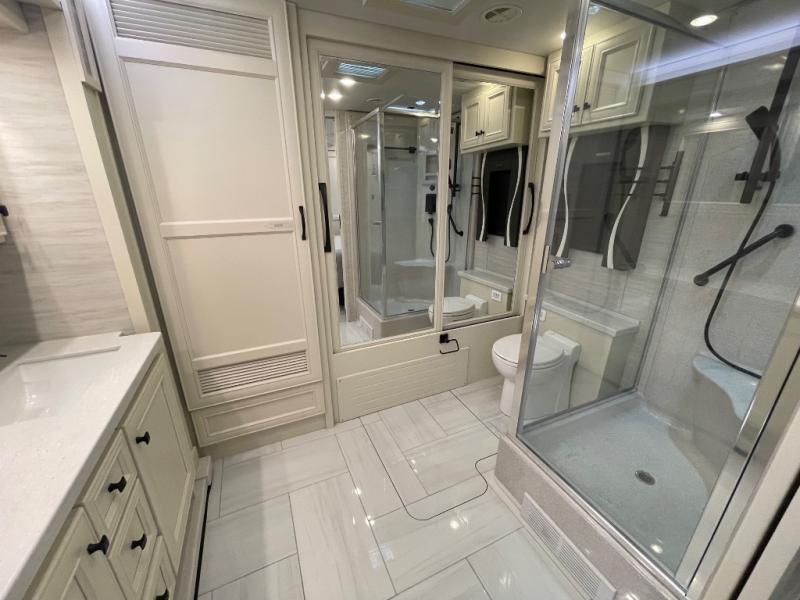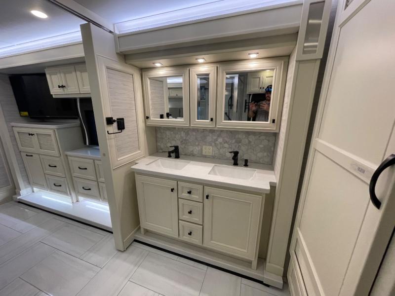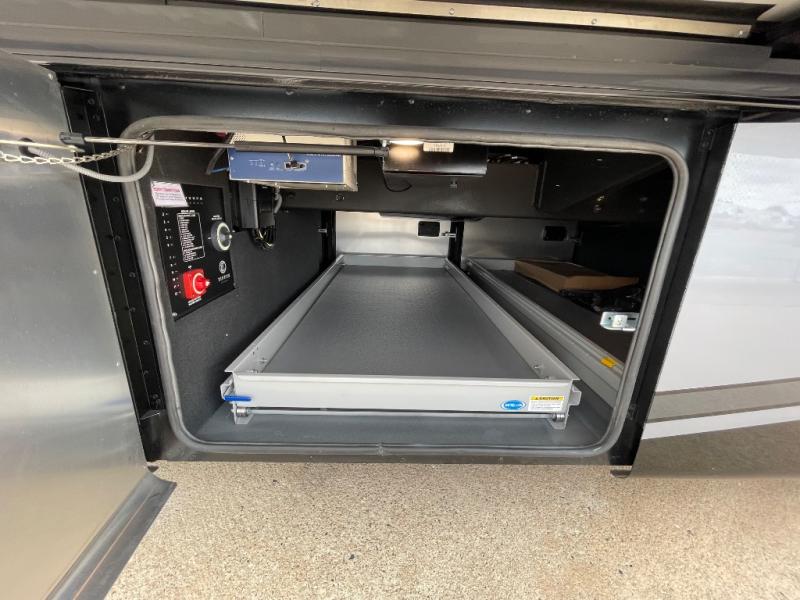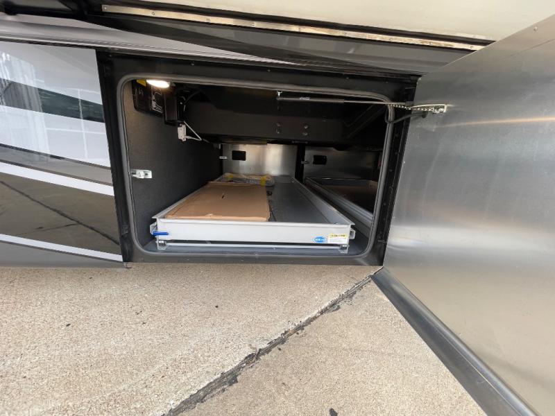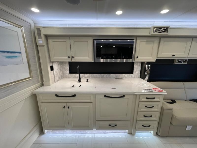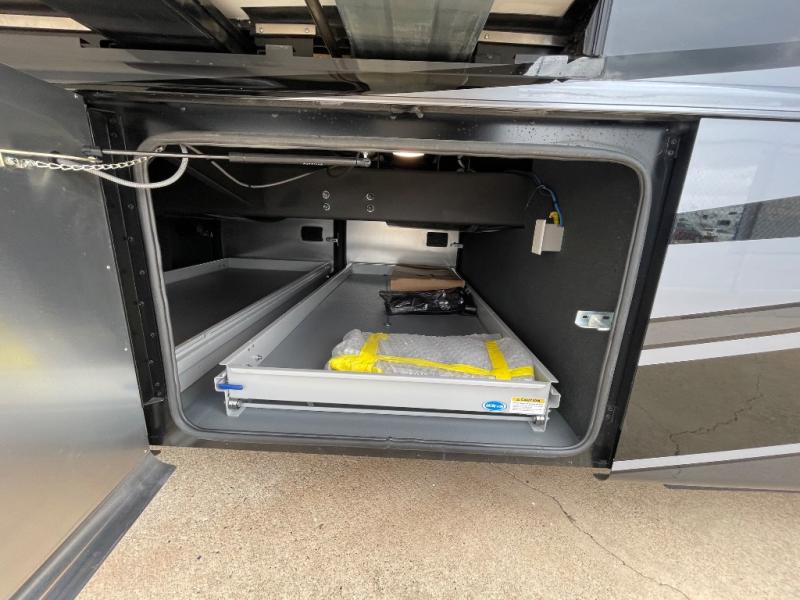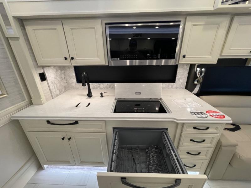 You will feel right at home in this coach with a master suite and king bed slide, mounted TV, laundry hamper, and stacked drawers. You all have quick access to the full rear bathroom. The bathroom not only has a dual sink vanity with a tri-view mirror for two to get ready at once, but also a shower with a seat and a large closet with an area next to it prepped to add an optional washer and dryer. The chef can prepare their best meals either indoors with the countertop extension and cooktop with convection microwave or outside if you add the optional outdoor grill. You can even watch the big game outside with the exterior TV with a sound bar!