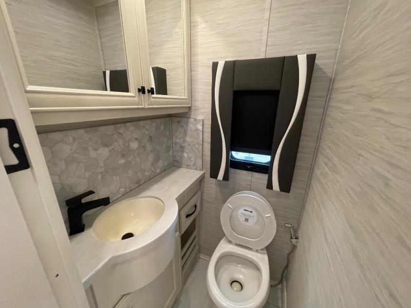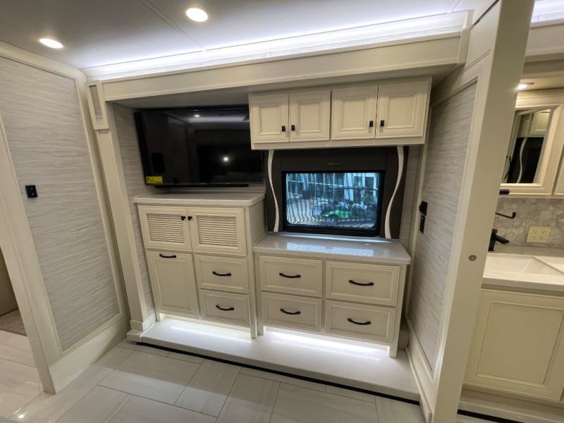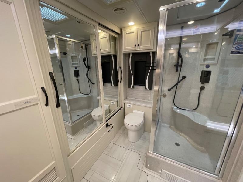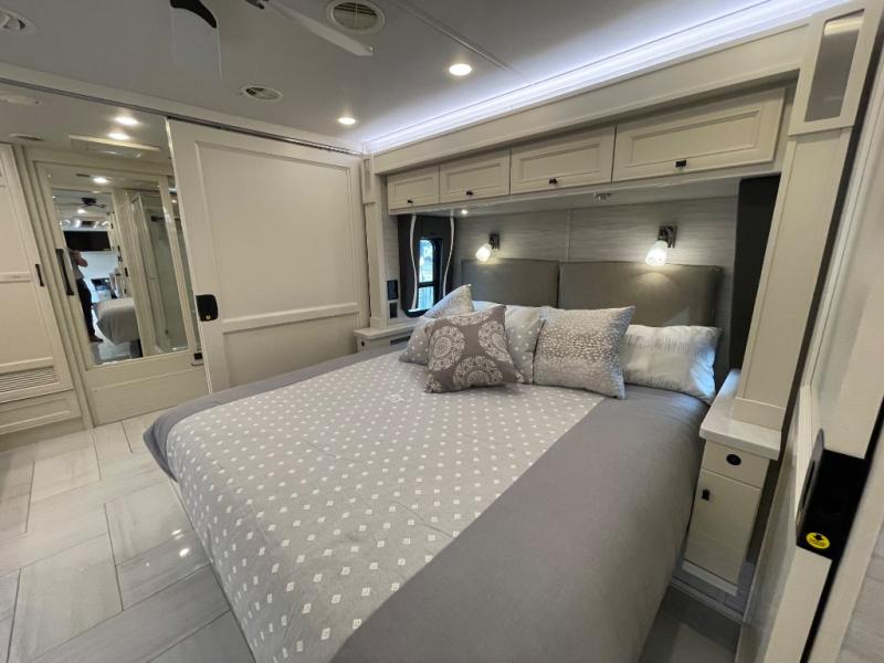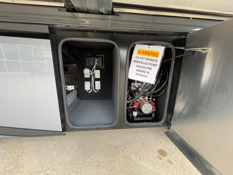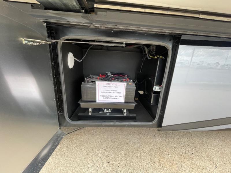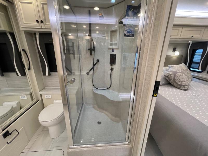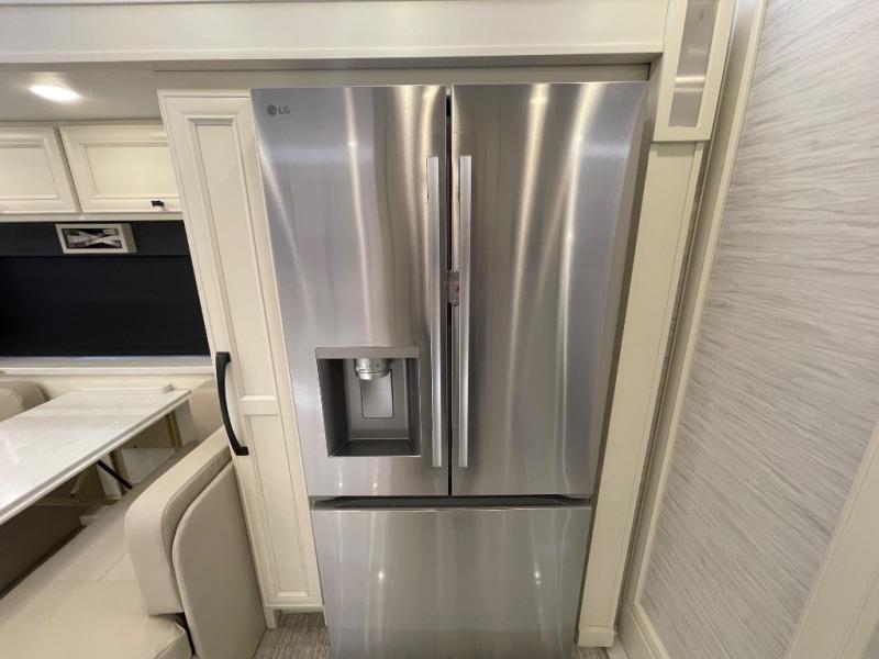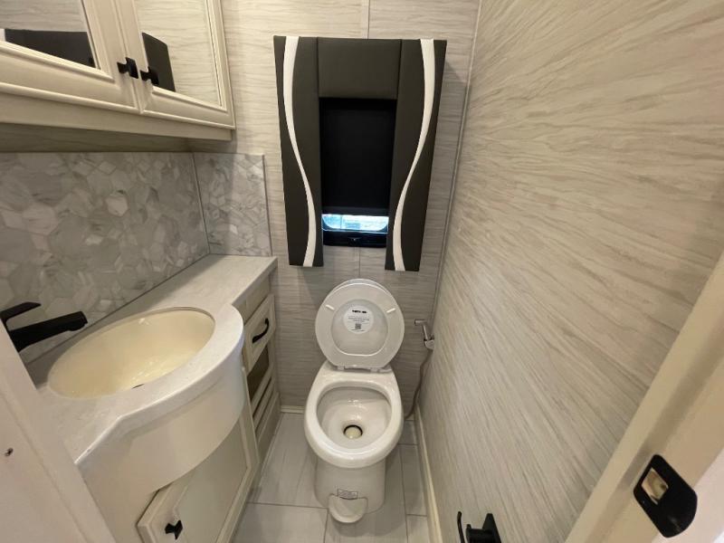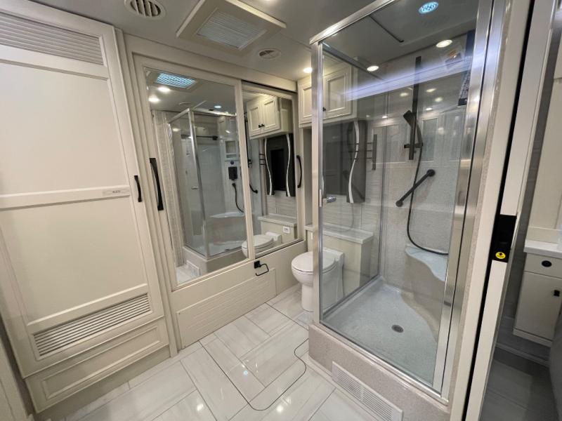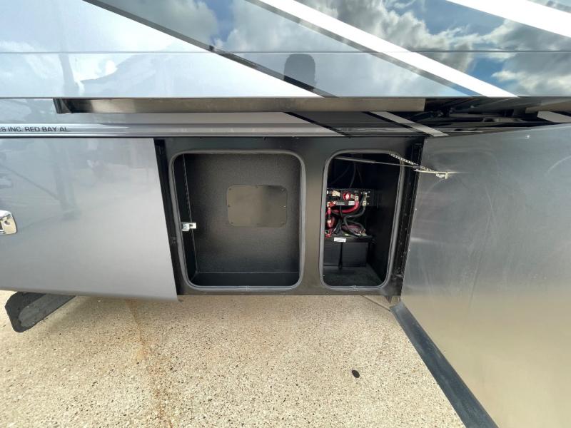 You will feel right at home in this coach with a master suite and king bed slide, mounted TV, laundry hamper, and stacked drawers. You all have quick access to the full rear bathroom. The bathroom not only has a dual sink vanity with a tri-view mirror for two to get ready at once, but also a shower with a seat and a large closet with an area next to it prepped to add an optional washer and dryer. The chef can prepare their best meals either indoors with the countertop extension and cooktop with convection microwave or outside if you add the optional outdoor grill. You can even watch the big game outside with the exterior TV with a sound bar!