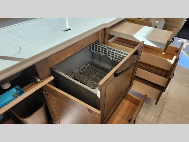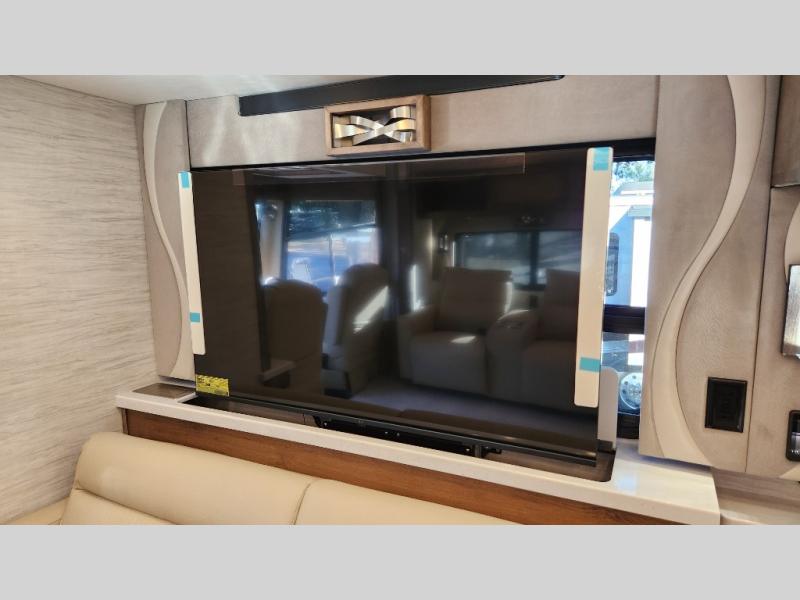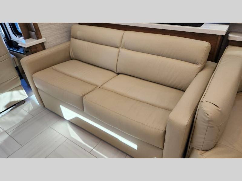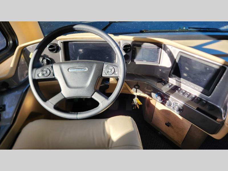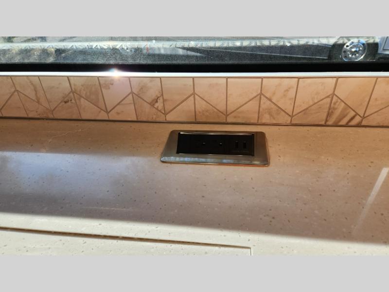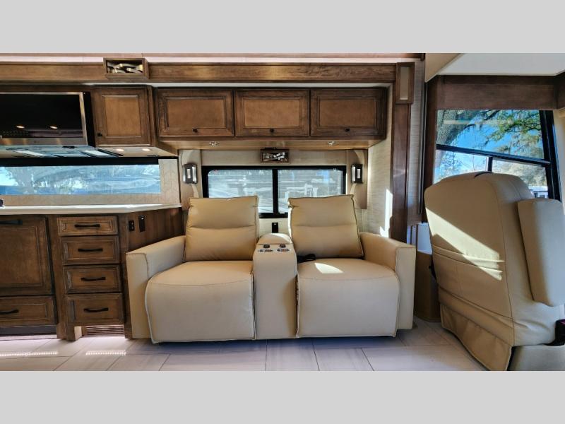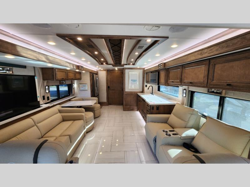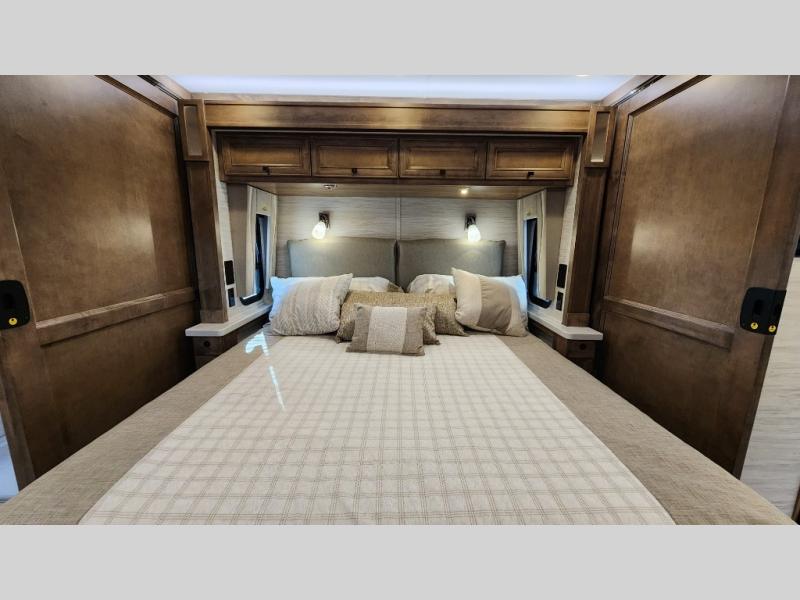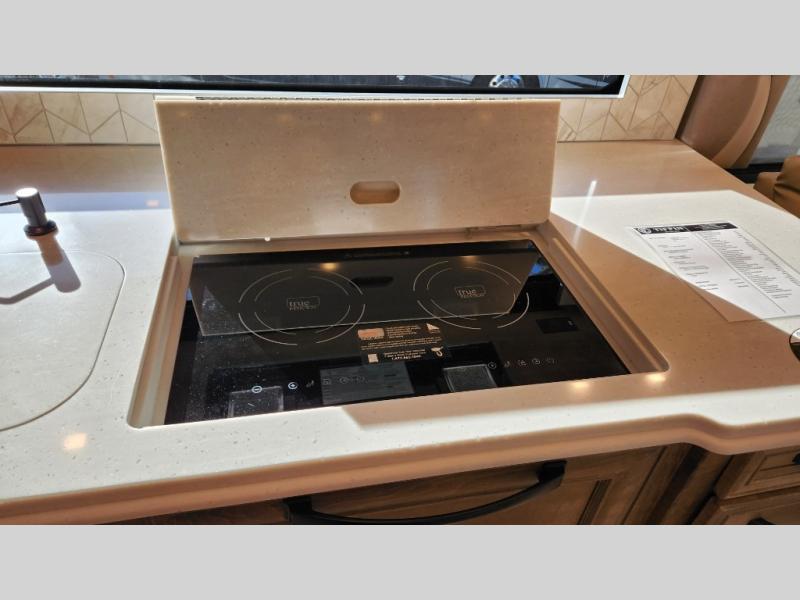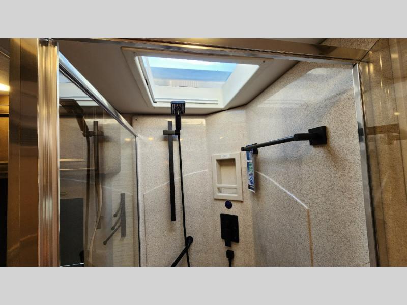 Frosted Granite Full Body Paint • FCCC Powerglide XC 450HP • Sandstone Cabinets • Gelato Interior • Air Coil Sofa PS • Aluminum Wheels • Articulo White Floor Tile • Bamboo Lifestyle Leather • Blind Spot Monitor • Power Drop Down Bunk • In-Dash Navigation • Dishwasher • Hydronic Heating w/Elec. Appl. • Residential Refrigerator • Electronic Stability/Traction Control • (2) Exterior Slide Trays • Generation 12 Ext Paint Scheme • TRC Hi/Lo Voltage Protection • Heated Tile Floor • Induction Cooktop • Memory Foam Mattress – King • Telescoping Ladder • Exterior LCD TV w/Soundbar • Front OH TV • Extended Cycle Batteries • Lift TS PS • Pet Perks Basic • Prep for Satellite Internet • (2) Roof-Mount Patio Awnings • Safe (Bedroom) • 3 Solar Panels • Starlink Pro • Stacked Washer/Dryer • Theatre Seating DS • Tire Pressure Sensing • U-Shaped Din (Non Sleep) PS