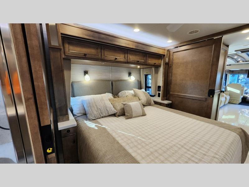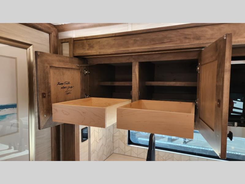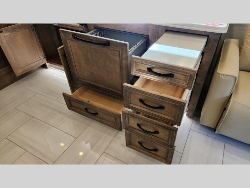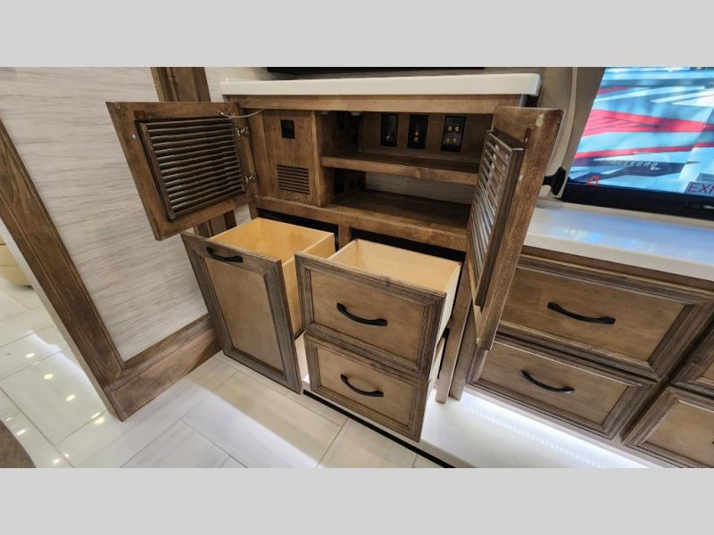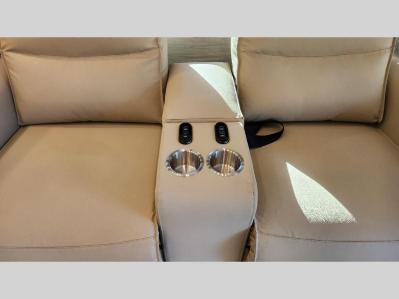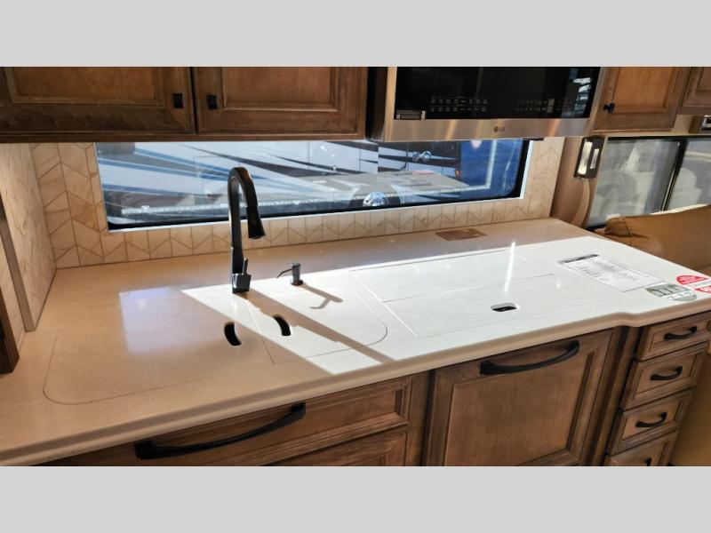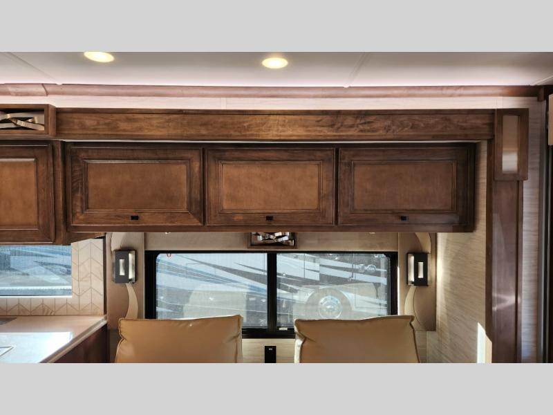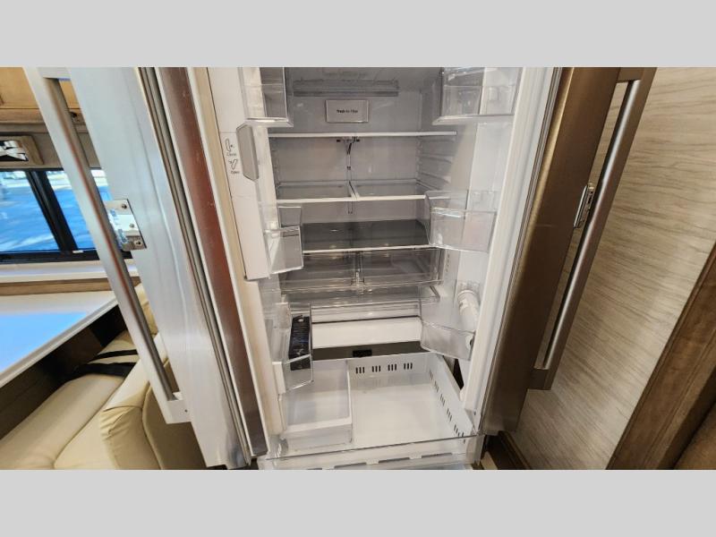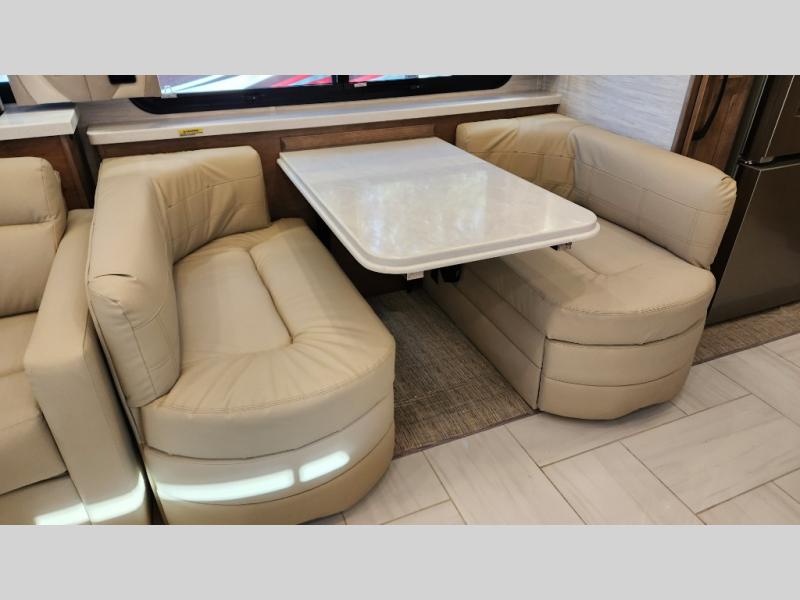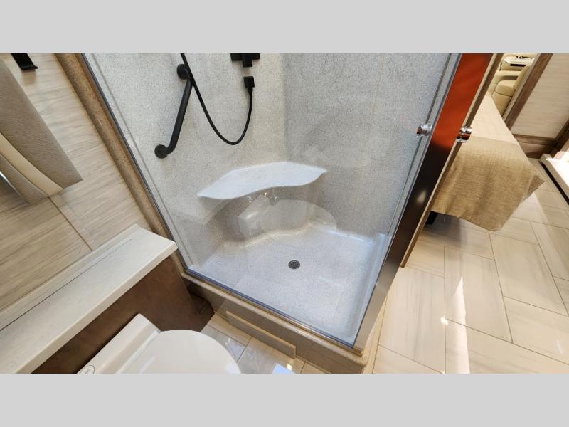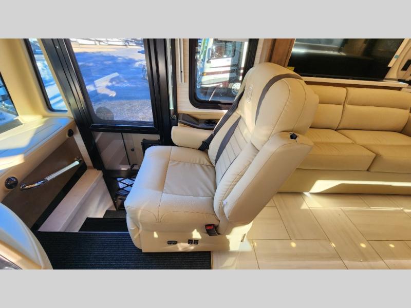 Frosted Granite Full Body Paint • FCCC Powerglide XC 450HP • Sandstone Cabinets • Gelato Interior • Air Coil Sofa PS • Aluminum Wheels • Articulo White Floor Tile • Bamboo Lifestyle Leather • Blind Spot Monitor • Power Drop Down Bunk • In-Dash Navigation • Dishwasher • Hydronic Heating w/Elec. Appl. • Residential Refrigerator • Electronic Stability/Traction Control • (2) Exterior Slide Trays • Generation 12 Ext Paint Scheme • TRC Hi/Lo Voltage Protection • Heated Tile Floor • Induction Cooktop • Memory Foam Mattress – King • Telescoping Ladder • Exterior LCD TV w/Soundbar • Front OH TV • Extended Cycle Batteries • Lift TS PS • Pet Perks Basic • Prep for Satellite Internet • (2) Roof-Mount Patio Awnings • Safe (Bedroom) • 3 Solar Panels • Starlink Pro • Stacked Washer/Dryer • Theatre Seating DS • Tire Pressure Sensing • U-Shaped Din (Non Sleep) PS