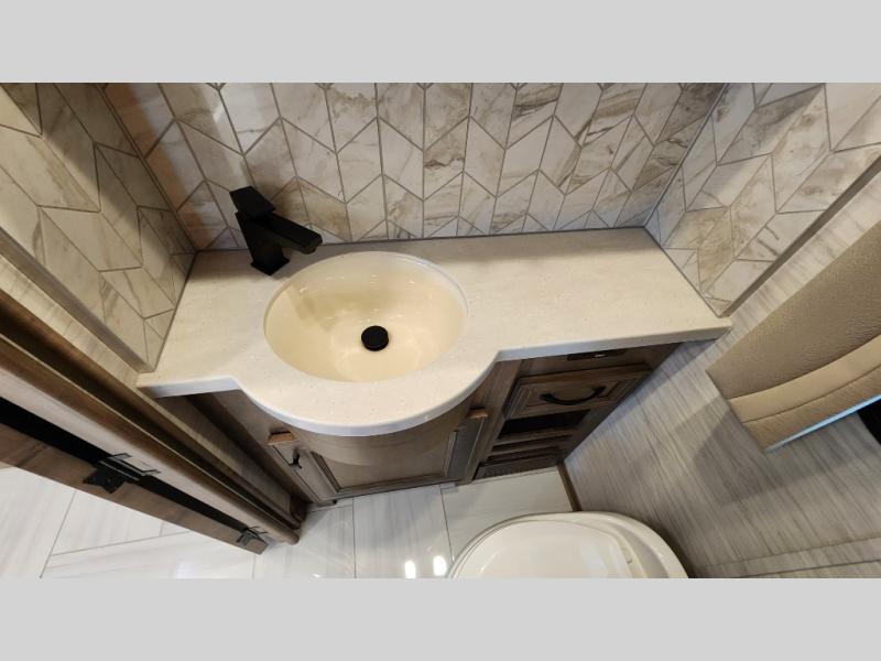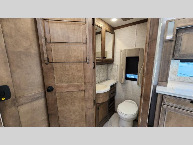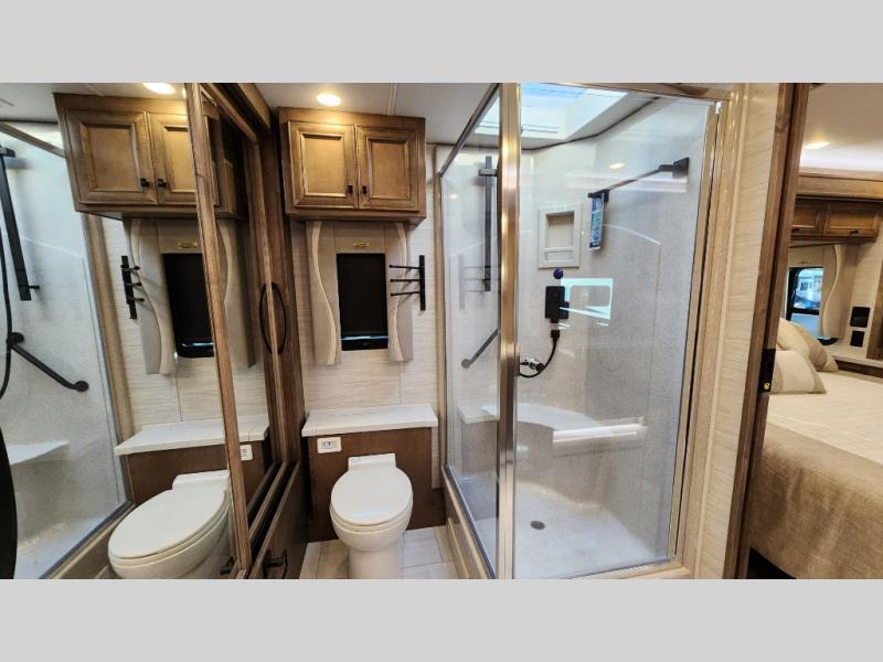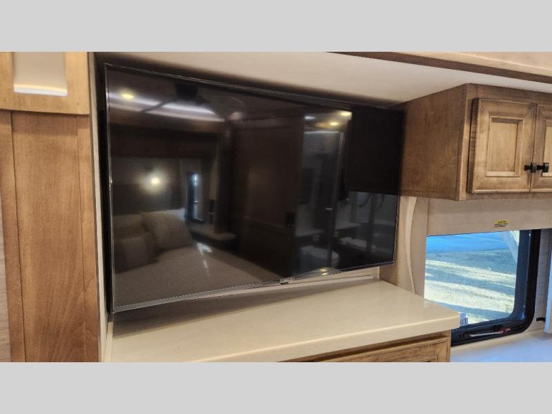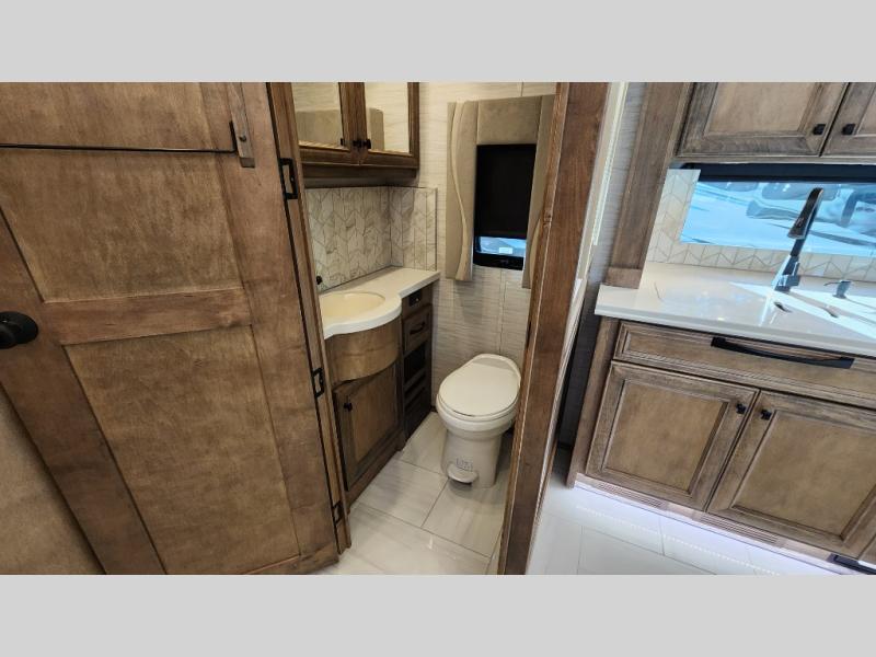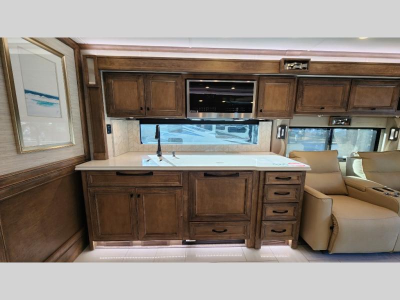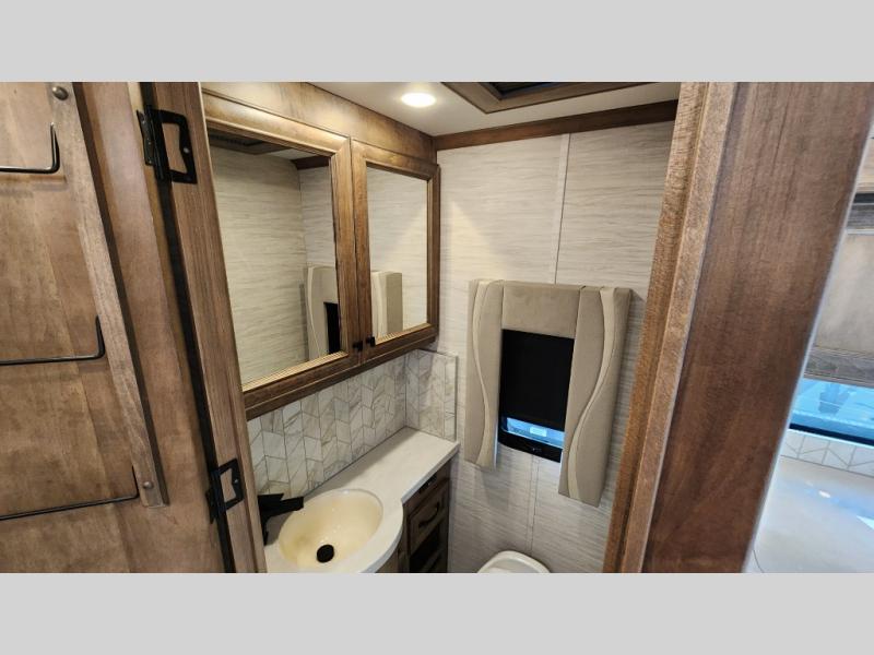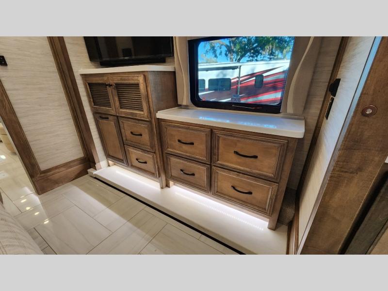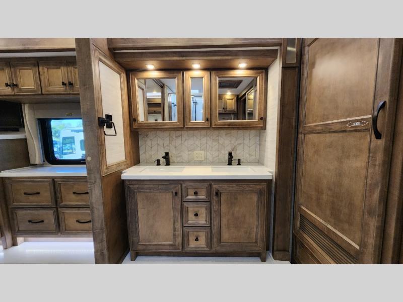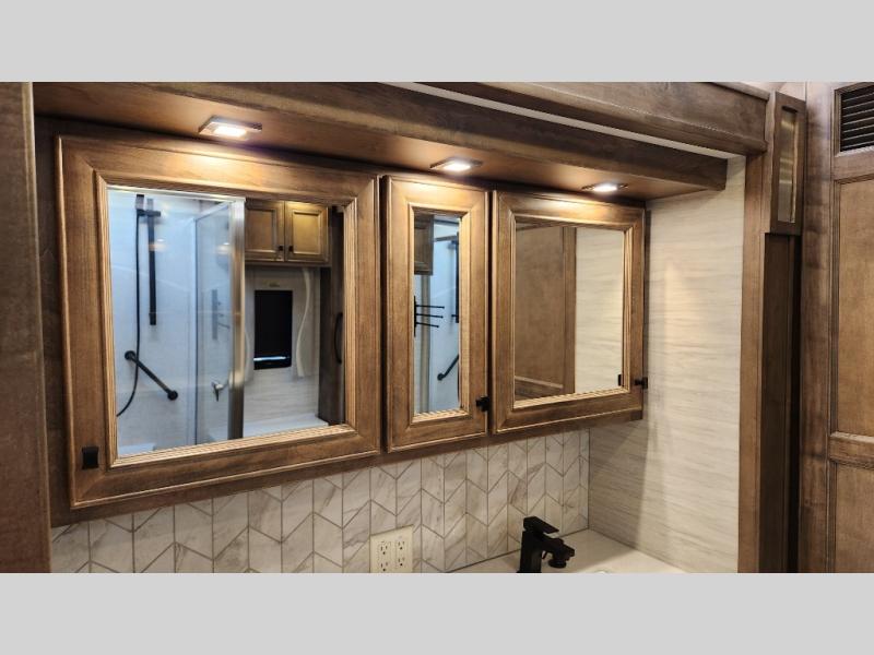 Frosted Granite Full Body Paint • FCCC Powerglide XC 450HP • Sandstone Cabinets • Gelato Interior • Air Coil Sofa PS • Aluminum Wheels • Articulo White Floor Tile • Bamboo Lifestyle Leather • Blind Spot Monitor • Power Drop Down Bunk • In-Dash Navigation • Dishwasher • Hydronic Heating w/Elec. Appl. • Residential Refrigerator • Electronic Stability/Traction Control • (2) Exterior Slide Trays • Generation 12 Ext Paint Scheme • TRC Hi/Lo Voltage Protection • Heated Tile Floor • Induction Cooktop • Memory Foam Mattress – King • Telescoping Ladder • Exterior LCD TV w/Soundbar • Front OH TV • Extended Cycle Batteries • Lift TS PS • Pet Perks Basic • Prep for Satellite Internet • (2) Roof-Mount Patio Awnings • Safe (Bedroom) • 3 Solar Panels • Starlink Pro • Stacked Washer/Dryer • Theatre Seating DS • Tire Pressure Sensing • U-Shaped Din (Non Sleep) PS
