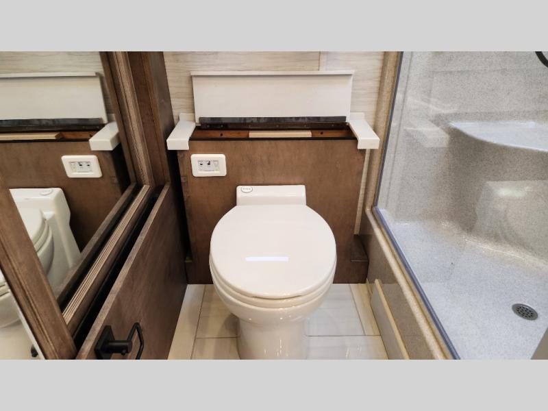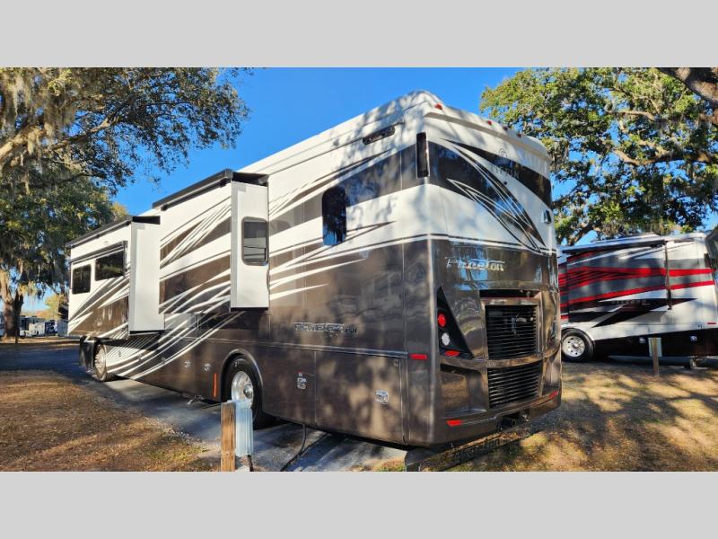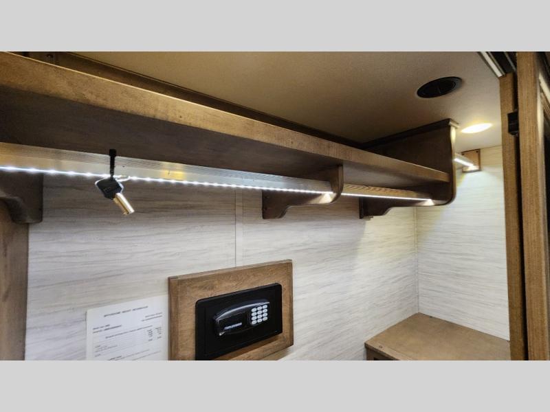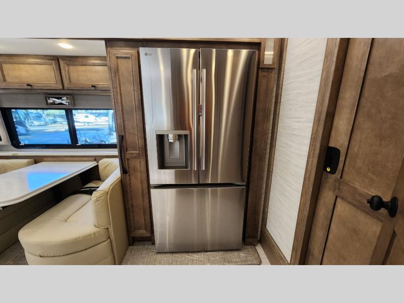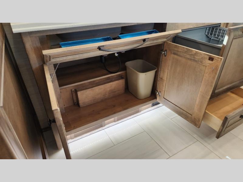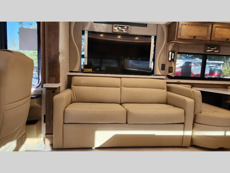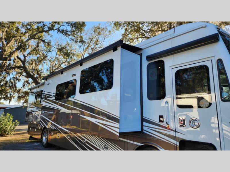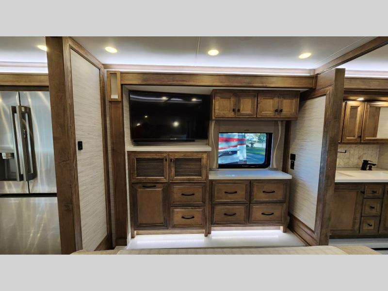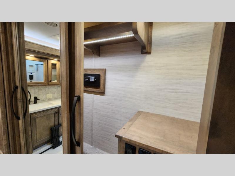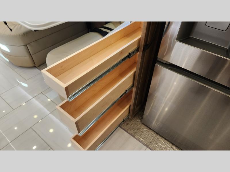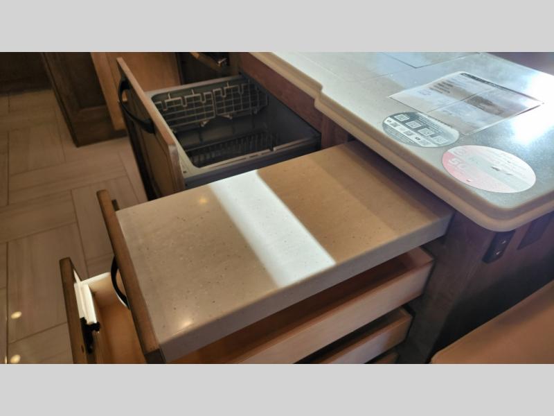 Frosted Granite Full Body Paint • FCCC Powerglide XC 450HP • Sandstone Cabinets • Gelato Interior • Air Coil Sofa PS • Aluminum Wheels • Articulo White Floor Tile • Bamboo Lifestyle Leather • Blind Spot Monitor • Power Drop Down Bunk • In-Dash Navigation • Dishwasher • Hydronic Heating w/Elec. Appl. • Residential Refrigerator • Electronic Stability/Traction Control • (2) Exterior Slide Trays • Generation 12 Ext Paint Scheme • TRC Hi/Lo Voltage Protection • Heated Tile Floor • Induction Cooktop • Memory Foam Mattress – King • Telescoping Ladder • Exterior LCD TV w/Soundbar • Front OH TV • Extended Cycle Batteries • Lift TS PS • Pet Perks Basic • Prep for Satellite Internet • (2) Roof-Mount Patio Awnings • Safe (Bedroom) • 3 Solar Panels • Starlink Pro • Stacked Washer/Dryer • Theatre Seating DS • Tire Pressure Sensing • U-Shaped Din (Non Sleep) PS