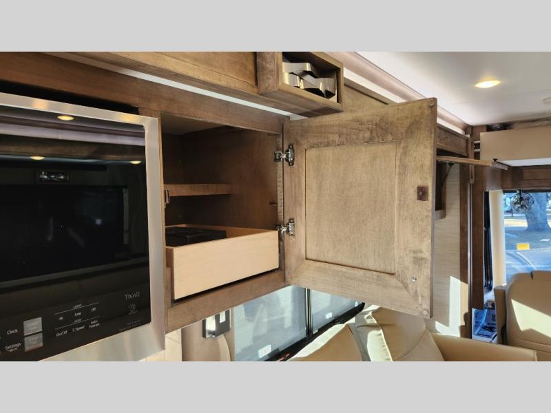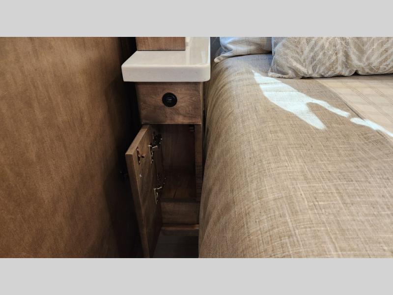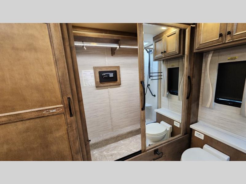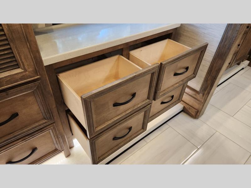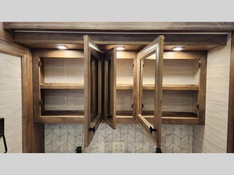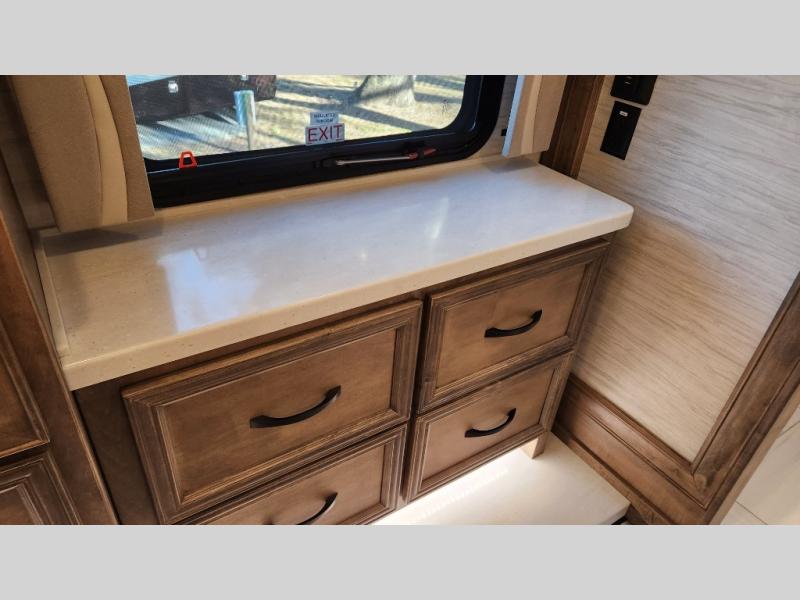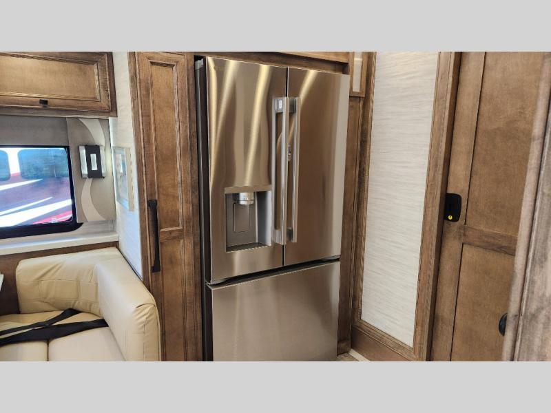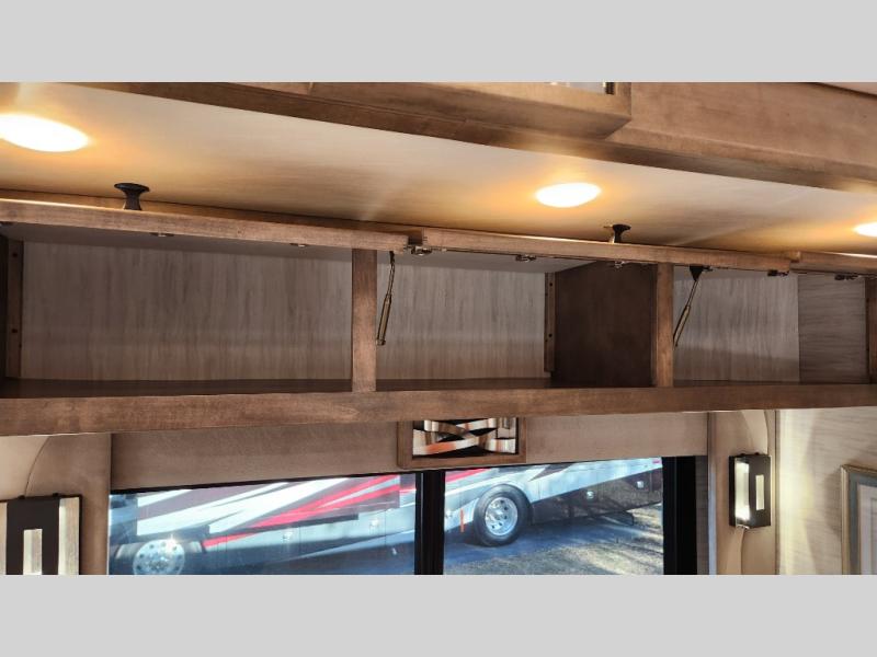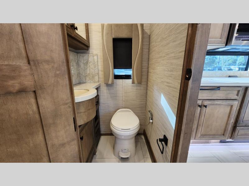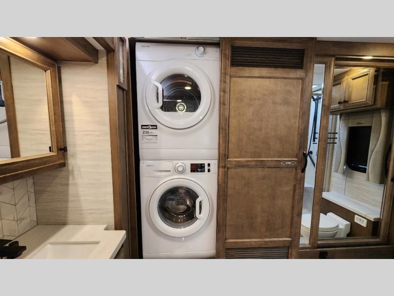 Frosted Granite Full Body Paint • FCCC Powerglide XC 450HP • Sandstone Cabinets • Gelato Interior • Air Coil Sofa PS • Aluminum Wheels • Articulo White Floor Tile • Bamboo Lifestyle Leather • Blind Spot Monitor • Power Drop Down Bunk • In-Dash Navigation • Dishwasher • Hydronic Heating w/Elec. Appl. • Residential Refrigerator • Electronic Stability/Traction Control • (2) Exterior Slide Trays • Generation 12 Ext Paint Scheme • TRC Hi/Lo Voltage Protection • Heated Tile Floor • Induction Cooktop • Memory Foam Mattress – King • Telescoping Ladder • Exterior LCD TV w/Soundbar • Front OH TV • Extended Cycle Batteries • Lift TS PS • Pet Perks Basic • Prep for Satellite Internet • (2) Roof-Mount Patio Awnings • Safe (Bedroom) • 3 Solar Panels • Starlink Pro • Stacked Washer/Dryer • Theatre Seating DS • Tire Pressure Sensing • U-Shaped Din (Non Sleep) PS