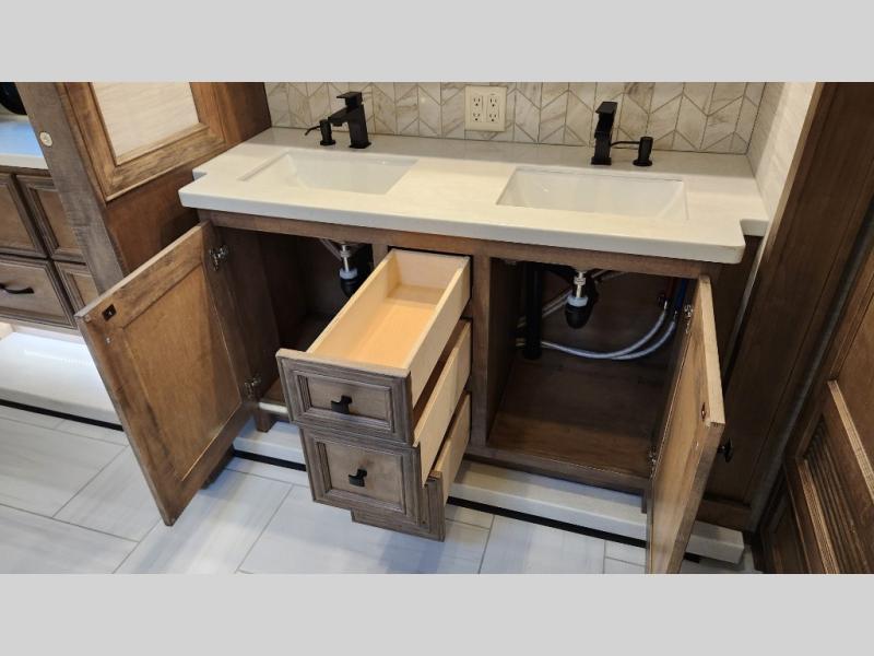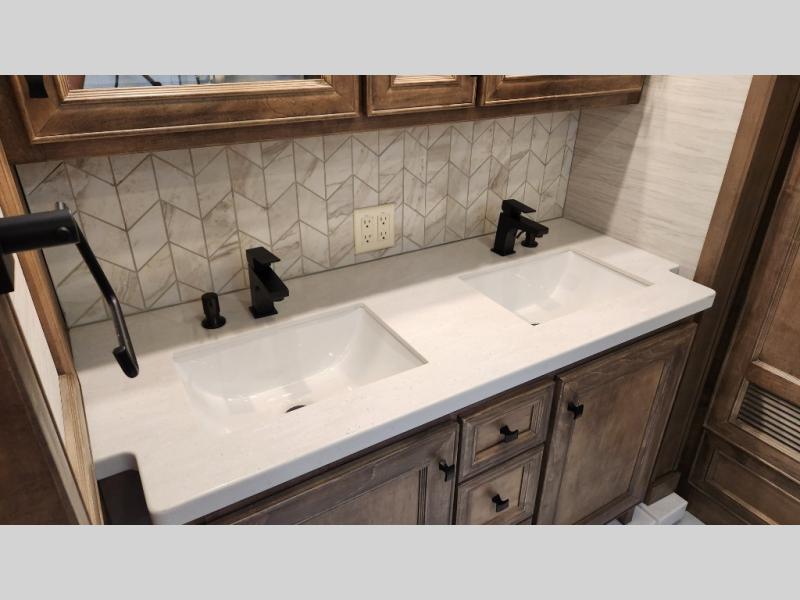 • Full rear bath with dual sink vanity and shower with seat