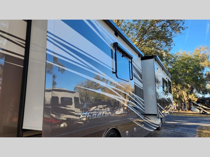Built for confident travel, this Phaeton rides on the FCCC PowerGlide XC 450HP chassis, enhanced by electronic stability/traction control, tire pressure sensing, blind spot monitoring, telescoping ladder, Starlink Pro, and prep for satellite internet for the connected traveler. Power and reliability come from extended cycle batteries, TRC hi/lo voltage protection, 3 solar panels, and the smooth operation of two exterior slide trays for easy storage access. Comfort continues outdoors with dual roof-mount patio awnings and the striking Frosted Granite full-body paint upgraded with the Generation 12 exterior paint scheme and bold aluminum wheels. Pet owners will appreciate Pet Perks Basic, and the bedroom safe adds peace of mind for valuables while traveling.