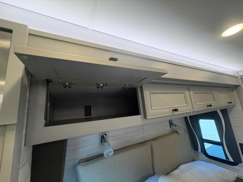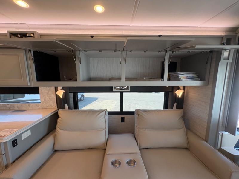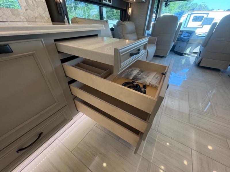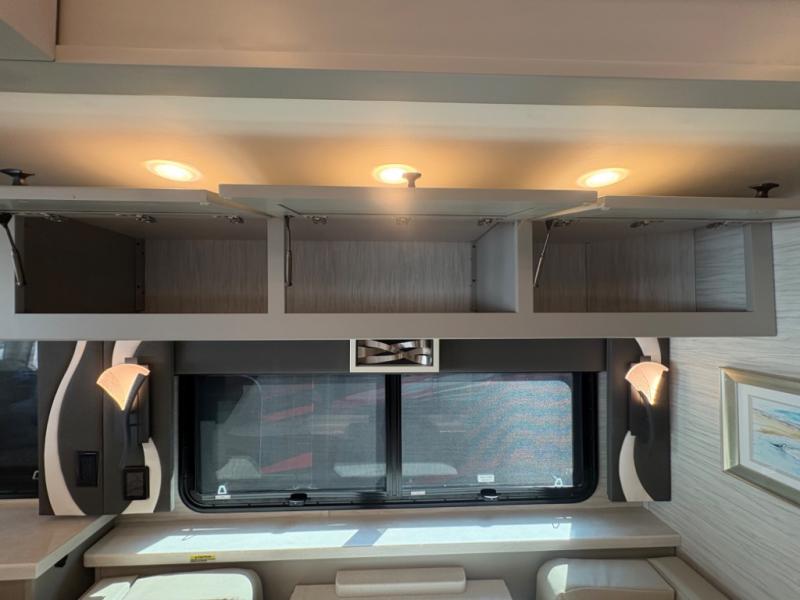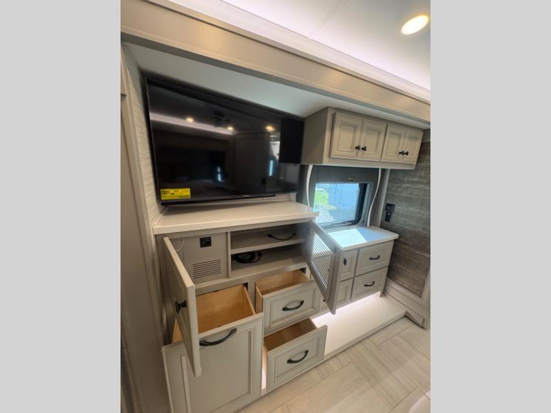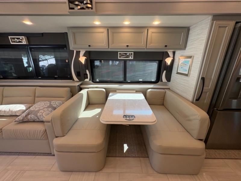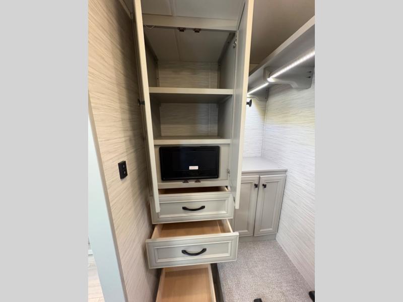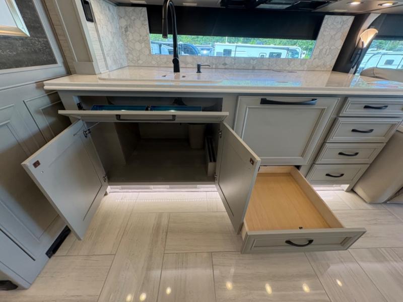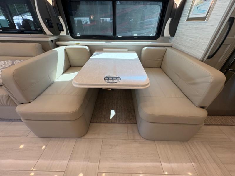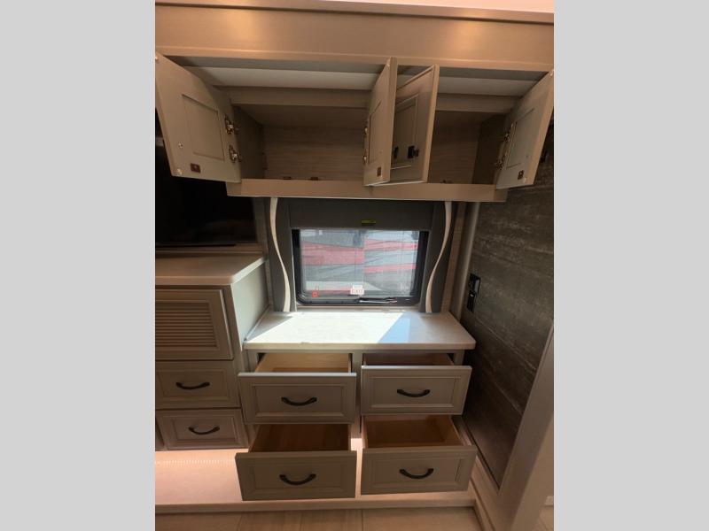 You won't want to travel any other way once you step inside this Phaeton motorhome! The full rear bathroom is decked out in convenient features like the large closet that has a cabinet with drawers below, an area prepped to add an optional washer and dryer, plus a shower with a seat and a dual sink vanity with a tri-view mirror. The kitchen has a stainless steel refrigerator to keep your perishables fresh, a countertop extension for more prepping and storage space, and the ability to add an optional drawer-type dishwasher for easy clean up. You can enjoy your meals at the booth dinette-sleeper then relax on either the air coil sofa bed or DE sofa bed with a lift TV above it. A few options you might want to add are the optional outdoor grill, the drop-down front bunk, the dinette with chairs, and more.