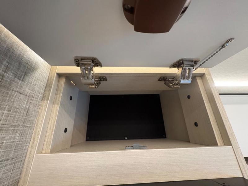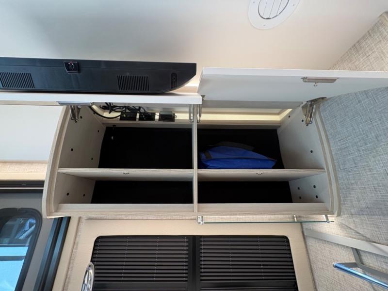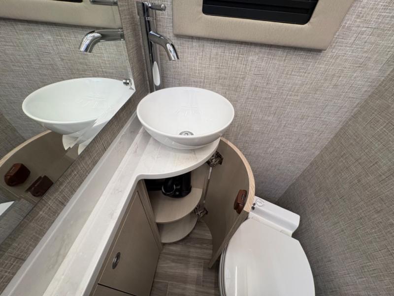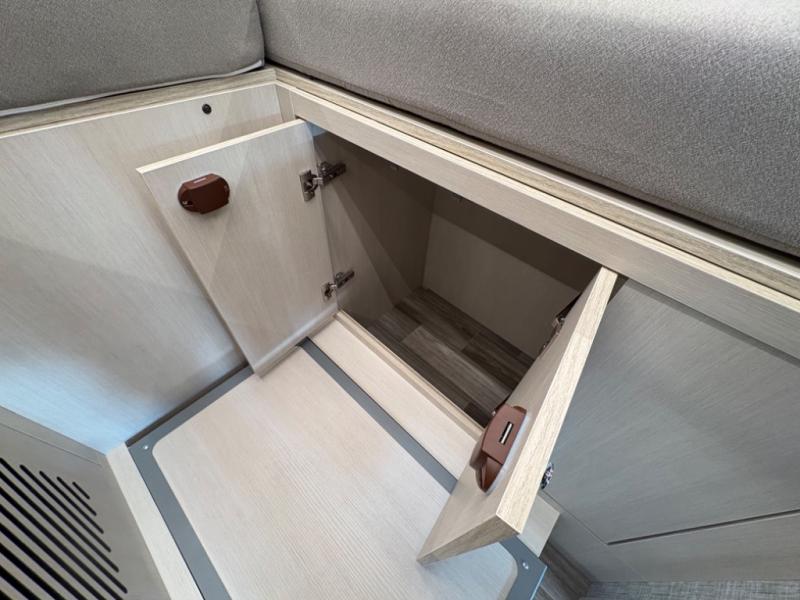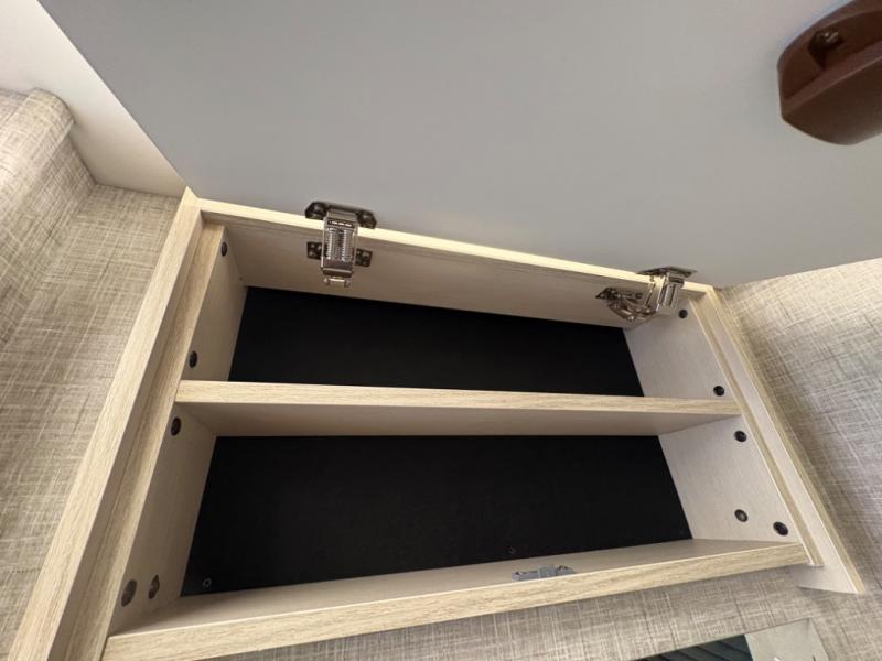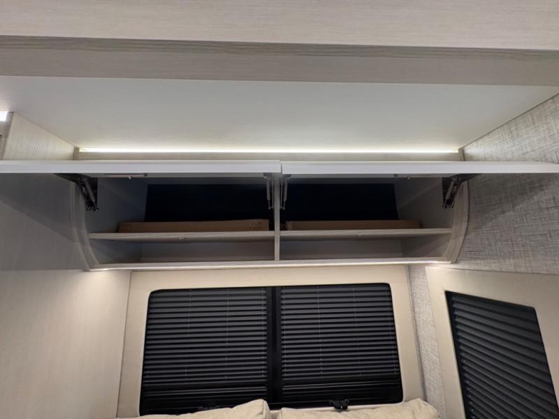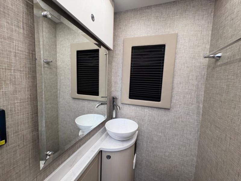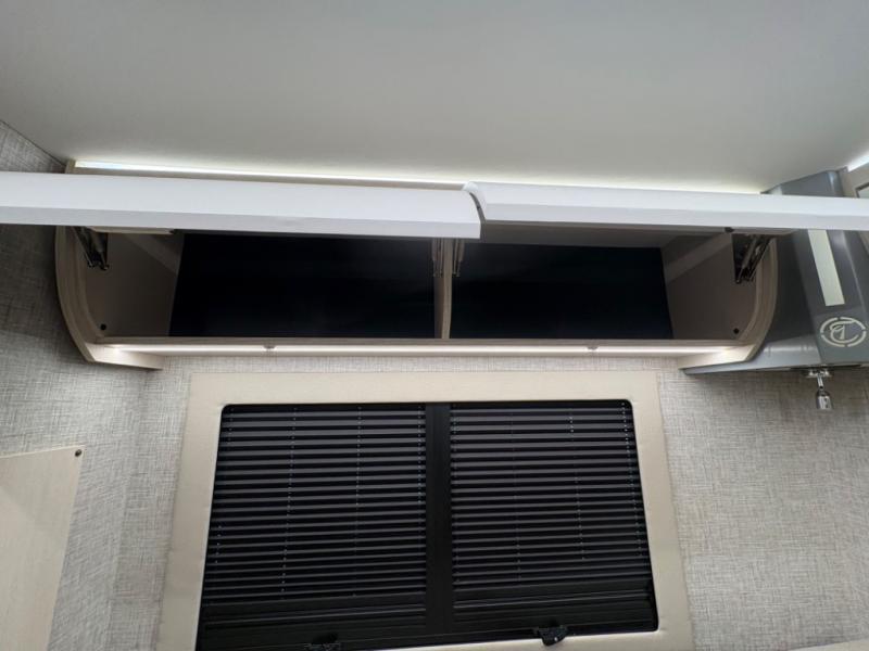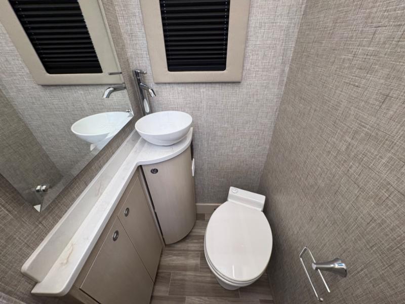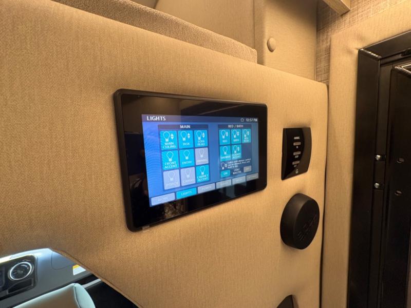 Head out to explore whenever the mood hits you! This coach provides a comfortable and luxurious way to travel from the cab features to the sleeping accommodations. The driver and passenger will have a tray for smartphones with charging ports, heated/electric adjustable mirrors, heated seats, and they might like to add the side-view cameras option. You can dine at the tri-fold sofa after whipping up a meal using the kitchen appliances including a stainless steel convection microwave. The split bathroom includes a shower along one side and a private toilet and sink on the opposite so two people can get ready at the same time. At night, fall quickly to sleep on the rear twin beds which allow you easy access to the bathroom, plus the nightstand will come in handy to place your cellphones and drinks. You will also find overhead cabinets for storage, and you might like to add an optional TV to watch.