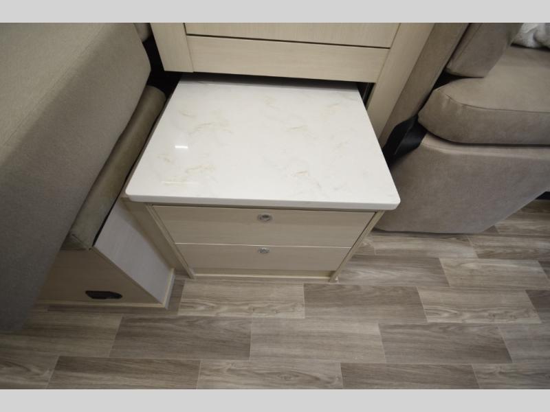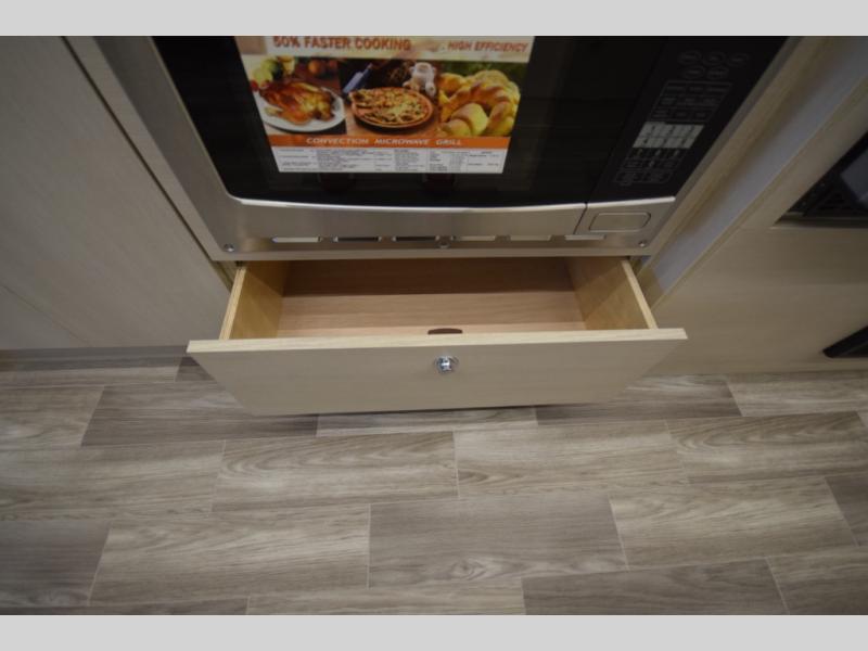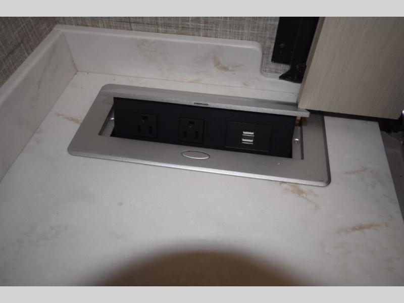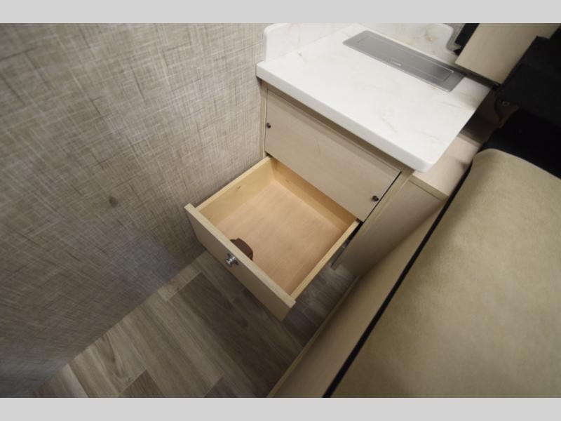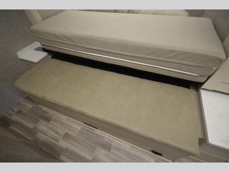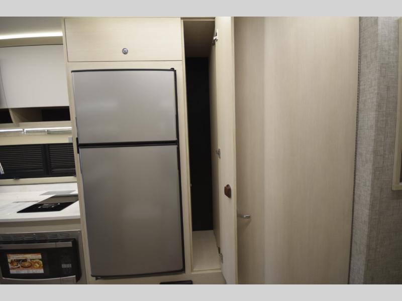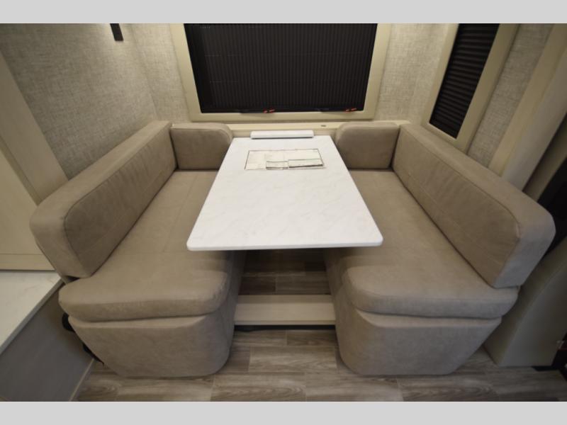 The modern galley kitchen makes cooking on the go a pleasure, featuring a pantry, refrigerator, microwave, and plenty of counter space for meal prep. Gather around the U-shaped dinette to enjoy home-cooked meals, play games, or plan tomorrow’s route—whatever the moment calls for.