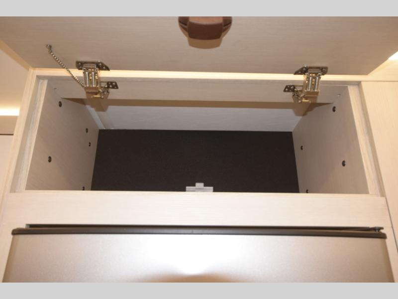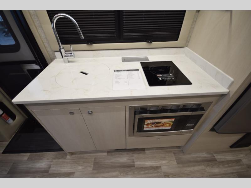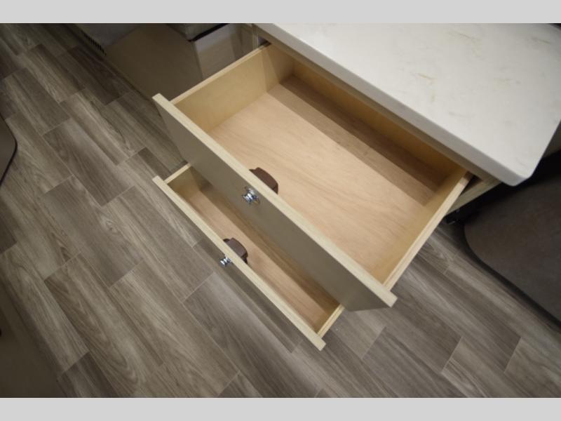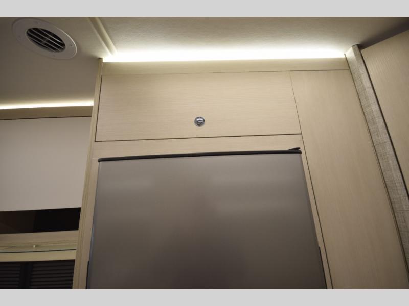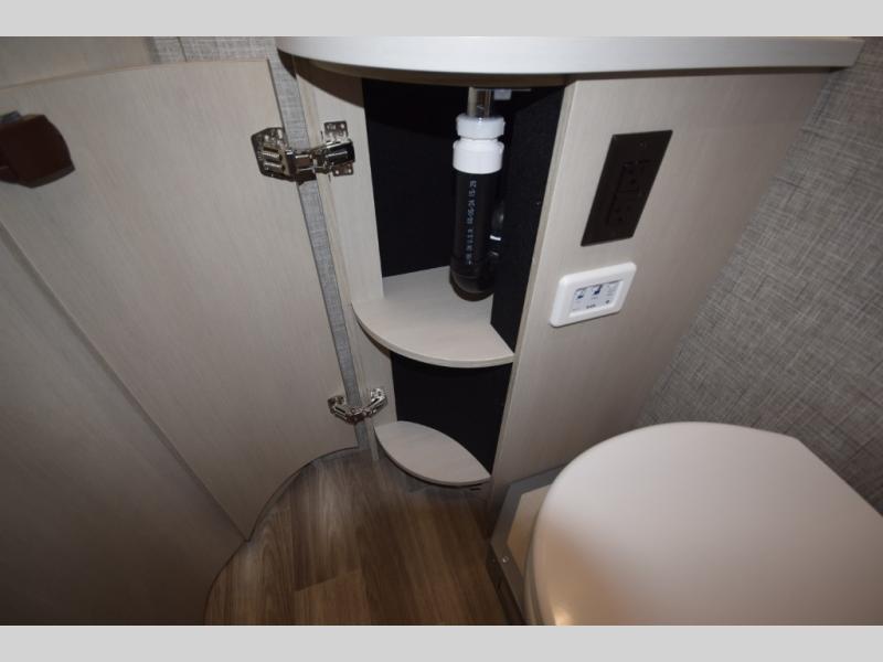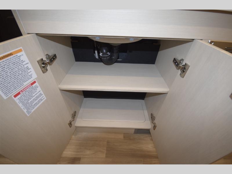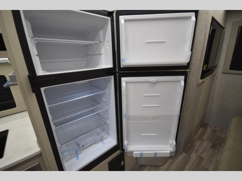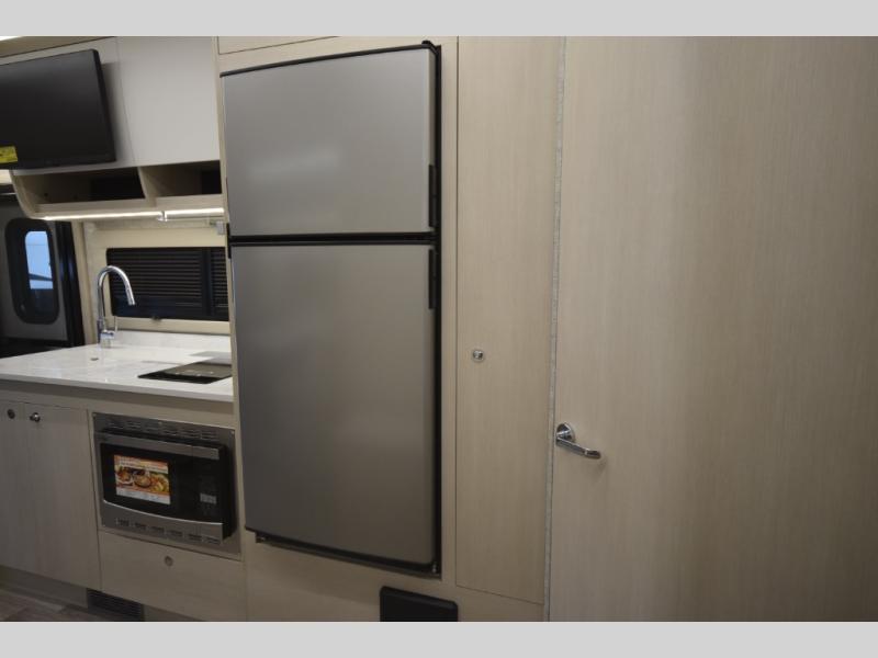 The modern galley kitchen makes cooking on the go a pleasure, featuring a pantry, refrigerator, microwave, and plenty of counter space for meal prep. Gather around the U-shaped dinette to enjoy home-cooked meals, play games, or plan tomorrow’s route—whatever the moment calls for.