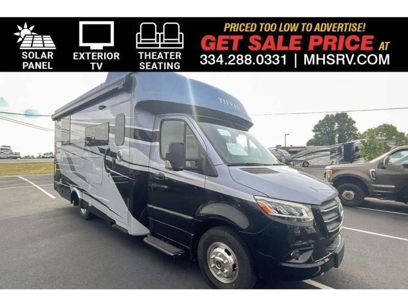 With any Wayfarer Class C diesel coach by Tiffin Motorhomes you will enjoy luxury features both inside and out. There are one-piece molded gel-coat fiberglass front and rear caps plus full-body paint and two layers of clear coat for added protection. The Mercedes-Benz 3500XD dual wheel cutaway chassis provides a strong foundation, and the 2.0L V4 turbo diesel high output 208 HP diesel engine with 332 lb-ft torque will keep you going adventure after adventure! You will love the drive just as much as the destination with adjustable captain's seats that are also heated, intelligent navigation, and a Mercedes-Benz MBUX multimedia system with a 10.25" touchscreen. Wherever you decide to roam, you will be met with interior comforts that include handcrafted overhead cabinetry, solar and privacy shades, solid surface galley countertops and task lighting, and a wardrobe in the bedroom to keep your space tidy.