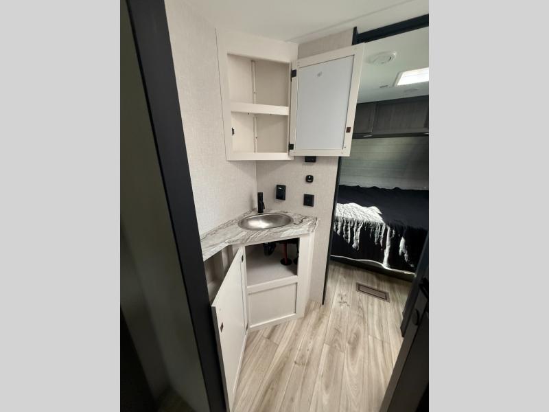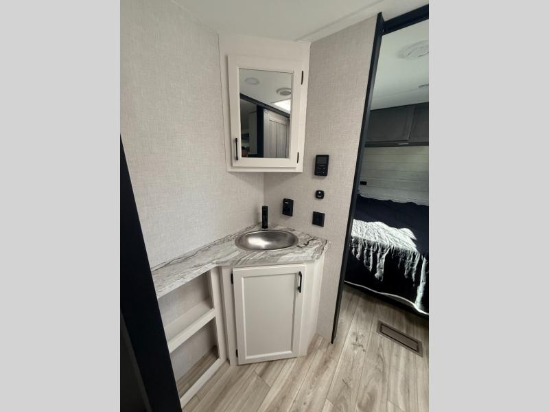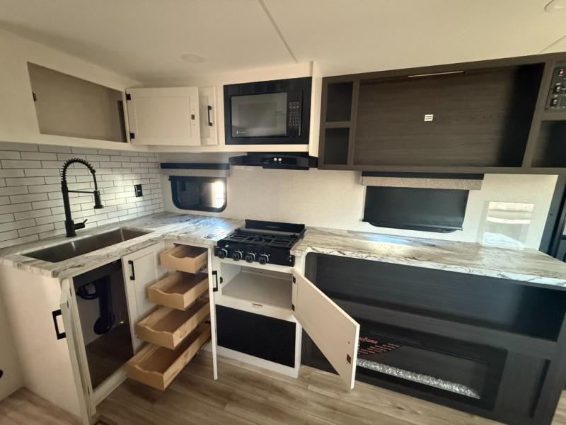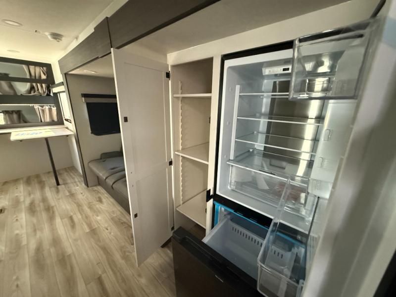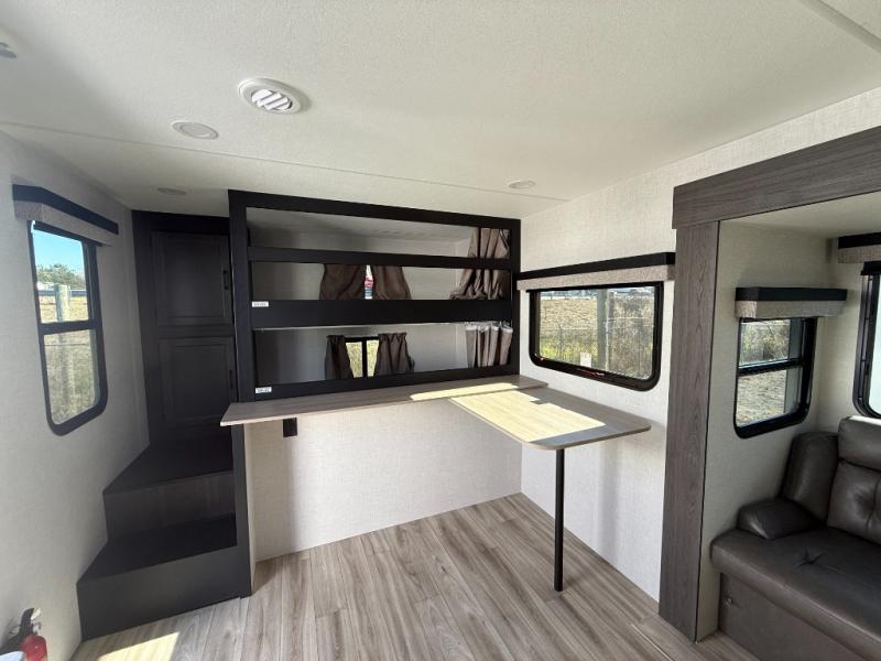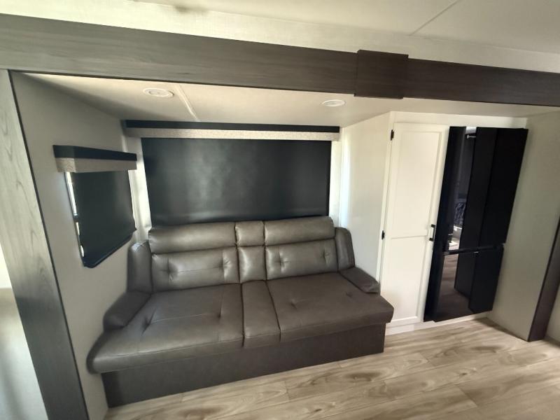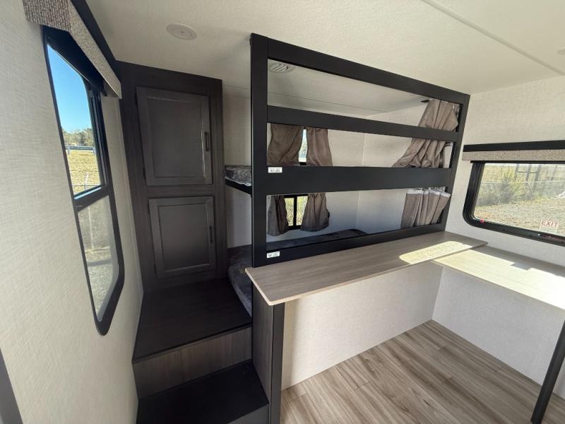 At the front of the trailer, a private bedroom offers a peaceful retreat with a spacious 70" x 80" king bed for a great night’s sleep, complemented by overhead cabinets and wardrobes on each side for clothing and essentials. Just steps away, the walk-through bathroom features a 30" x 36" shower, allowing you to freshen up in comfort without leaving the convenience of your trailer. The center of the floorplan opens into a welcoming living and kitchen area, where a slide-out houses the jiffy sofa for relaxing, along with a pantry and a 10 cu. ft. refrigerator to keep groceries and dry goods well stocked. Across from this space, the L-shaped kitchen is equipped with a three-burner cooktop, seamless countertops for easy meal prep, and abundant overhead cabinets for added storage. A bar and Sit n’ Slide table provide the perfect spot to enjoy meals or gather for board games. At the rear, a 40" x 70" bunk-over-bunk setup ensures the whole crew can rest comfortably after a day of adventure, with an additional wardrobe nearby for even more storage.