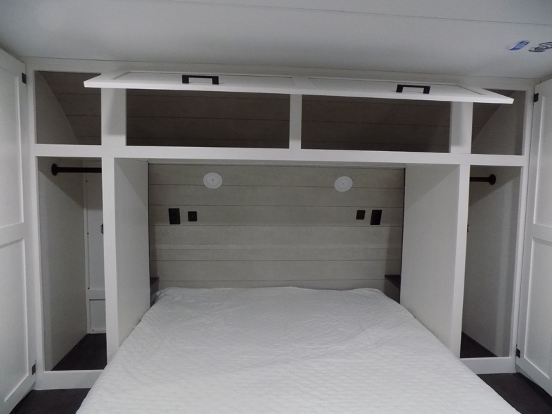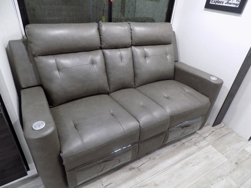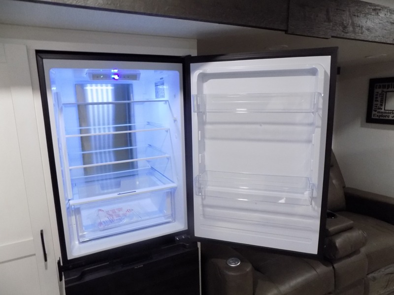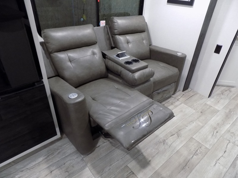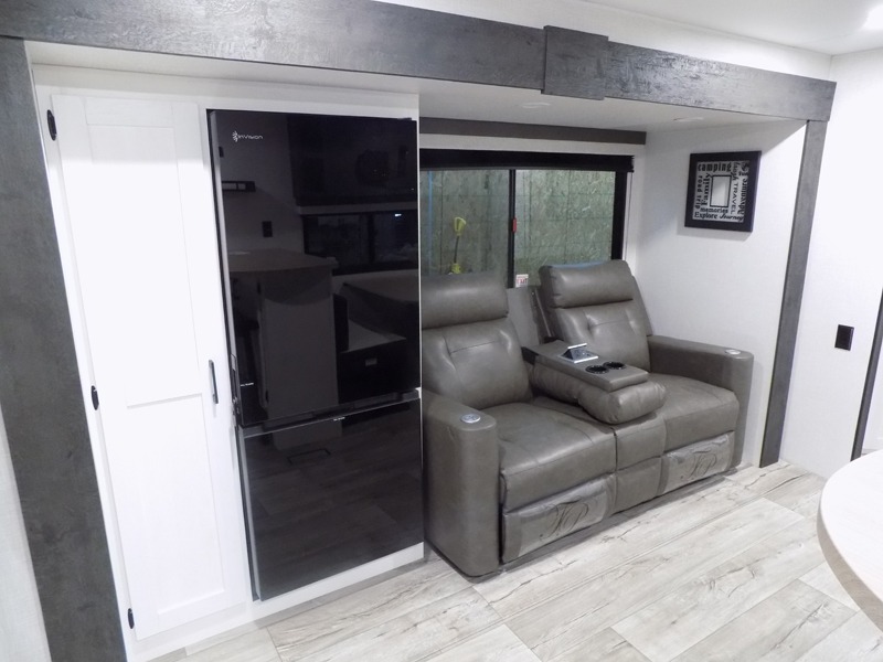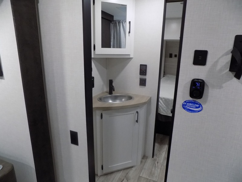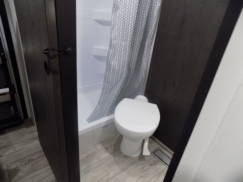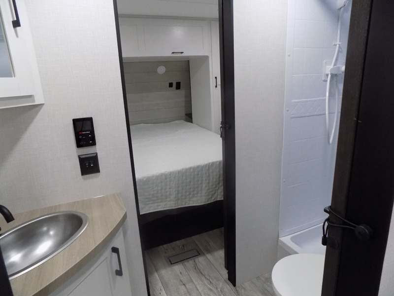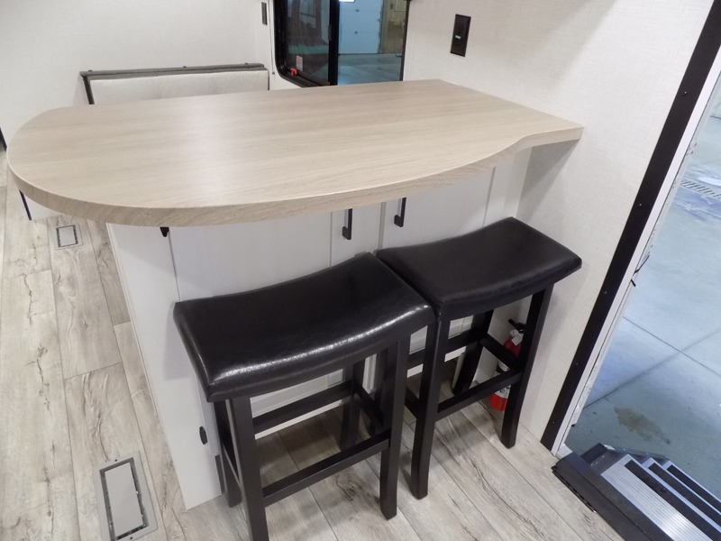 You'll love every minute spent in this dual entry travel trailer. The front master bedroom includes one of these doors, along with a Sleep Tight queen bed, dual wardrobes, and easy access into the walk-thru bath. Your crew can relax on the theater seating within the large slide out, play a game at the Sit N' Slide table with flipside reversible cushions, or dine at the bartop with stools. There is also a rear kitchen with ample counter space. Head outdoors to enjoy the 20' power awning in your camp chairs!