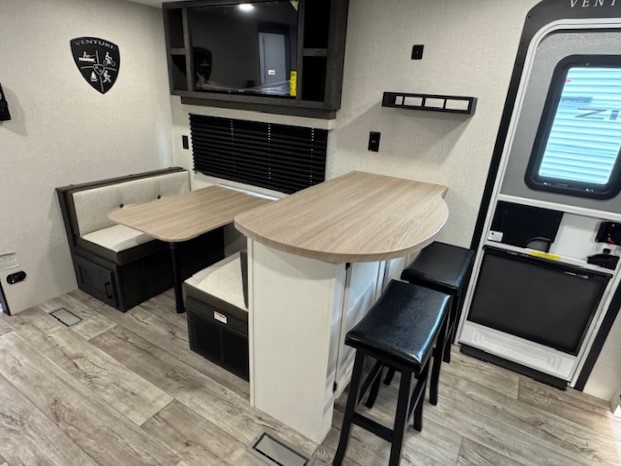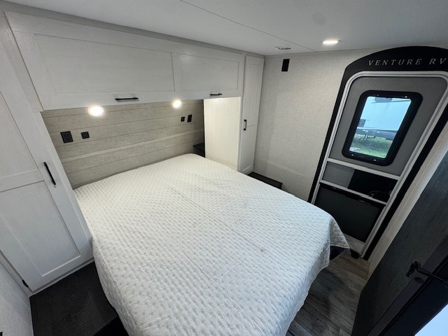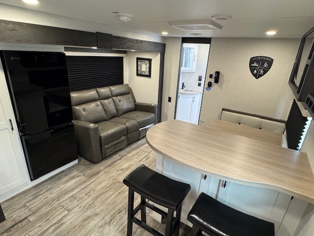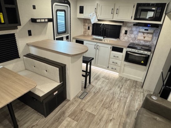 With any Sienna travel trailer by Venture RV, you will enjoy a lightweight unit, convenient amenities, and a durable construction that includes a BAL NXG-bolted frame. There is also a heated and enclosed one-piece underbelly, residential fiberglass insulation, and a reflective PVC roof membrane within the Weather-Shield Package to help extend your camping season. Outside, the BAL 5.0 power stabilizer jacks and power tongue jack will have you set up in no-time, and the Venture RV bottle opener/dog tie down will make it easy to bring your furry friends along. Head inside to enjoy the modern farmhouse design, along with Beauflor throughout with no carpet, custom backsplash, large underbed storage, and a bath skylight to name a few comforts!