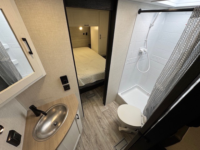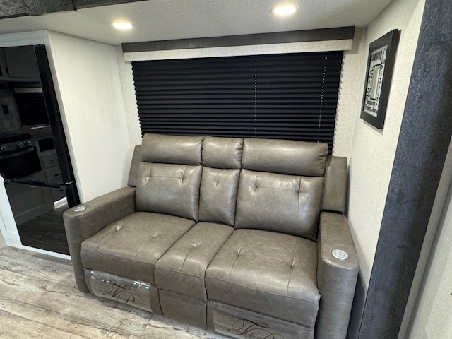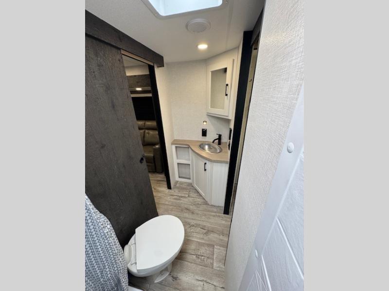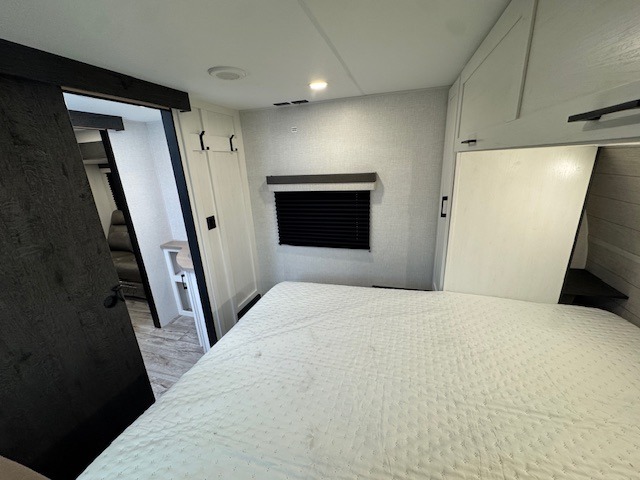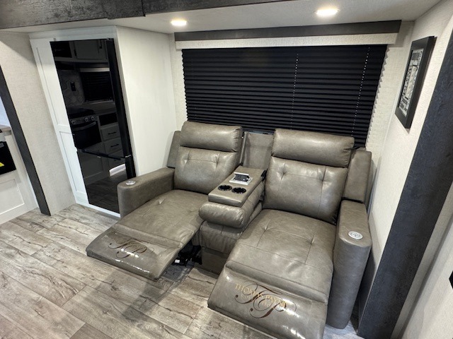 You'll love every minute spent in this dual entry travel trailer. The front master bedroom includes one of these doors, along with a Sleep Tight queen bed, dual wardrobes, and easy access into the walk-thru bath. Your crew can relax on the theater seating within the large slide out, play a game at the Sit N' Slide table with flipside reversible cushions, or dine at the bartop with stools. There is also a rear kitchen with ample counter space. Head outdoors to enjoy the 20' power awning in your camp chairs!