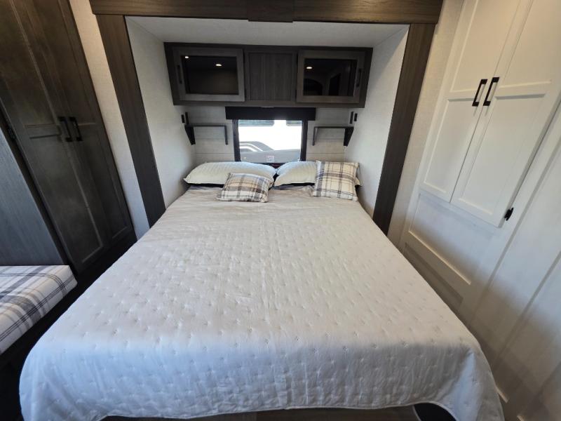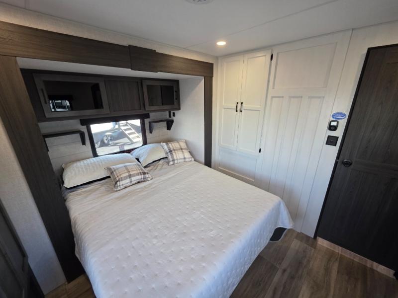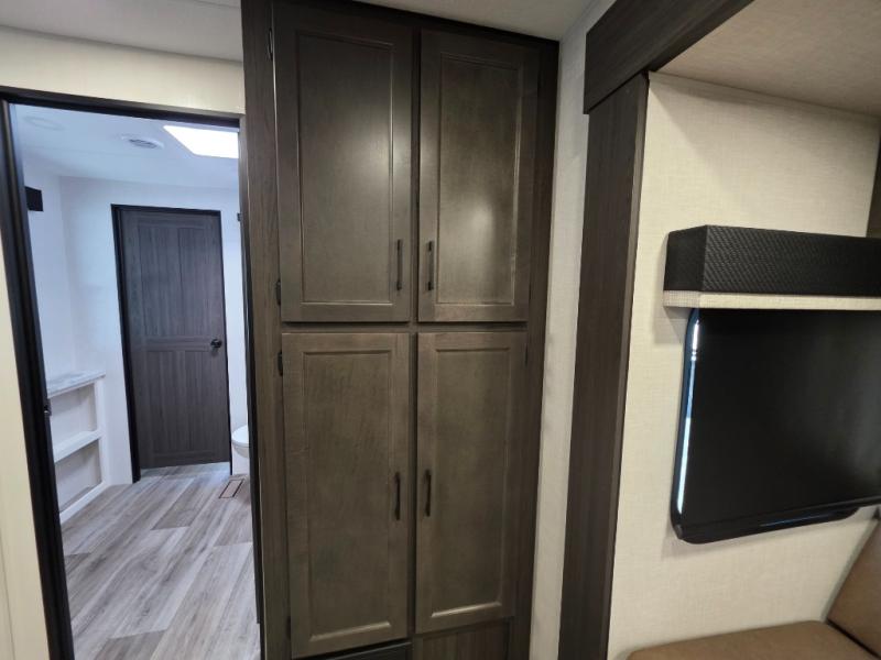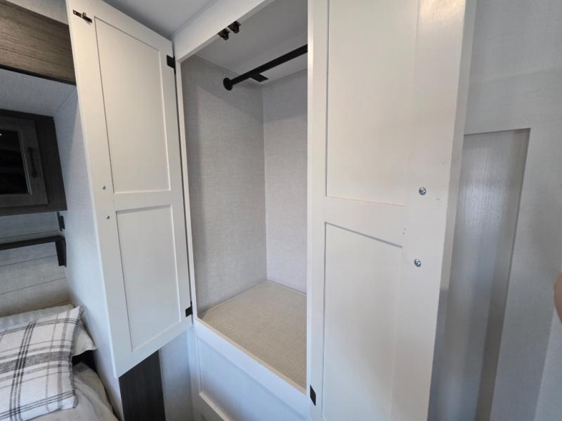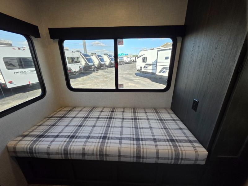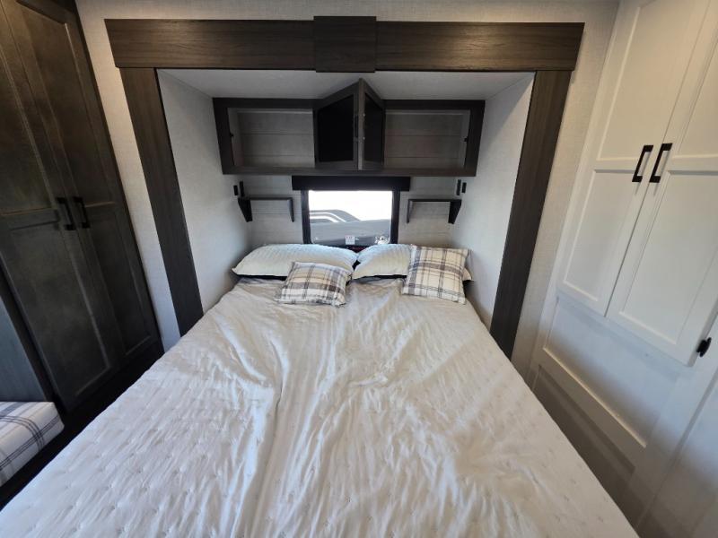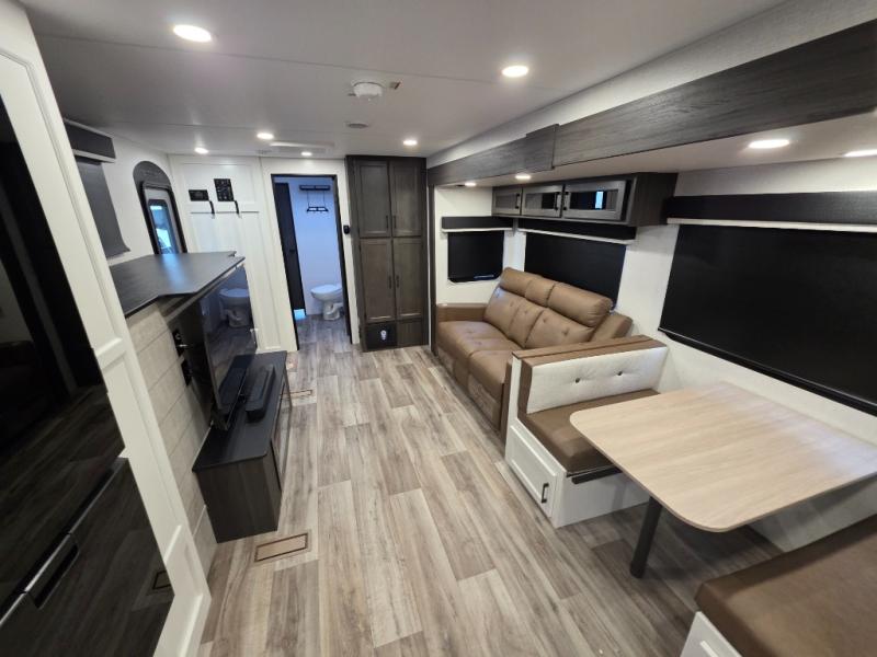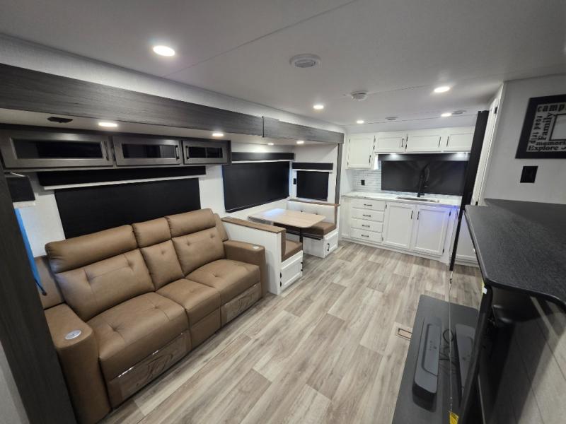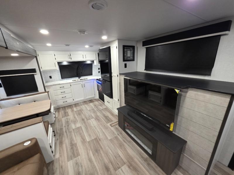 A front kitchen in this travel trailer provides more interior space! Once you have prepared your best meals with the Furrion oven and three burner cooktop, you can head to the Sit N' Slide table with flipside reversible cushions to dine. The 70" sofa also offers a comfortable place to take an afternoon nap or sit while enjoying the entertainment center with a frameless electric fireplace and 40" TV on a swing arm. A walk-thru bath makes it easy for all to enter and has a 30" x 36" shower to freshen up in each morning. The rear private bedroom has a Sleep Tight queen bed slide for a good night's rest, a dresser, two wardrobes, and a bench seat where you sit to put your hiking boots on. You'll also find one of the dual entry doors here for added convenience!
