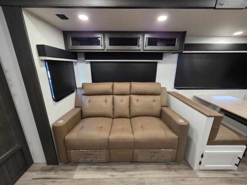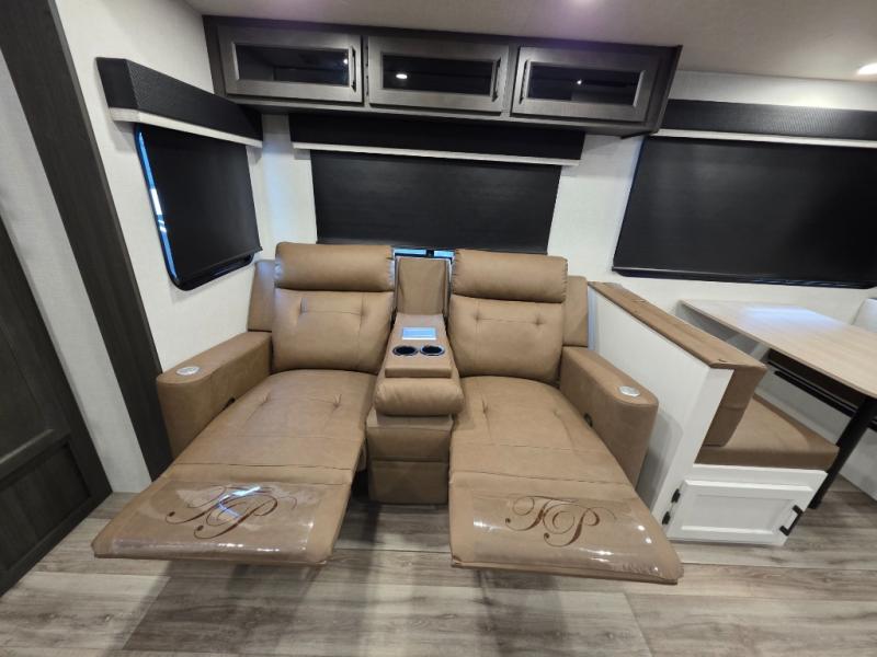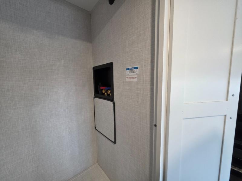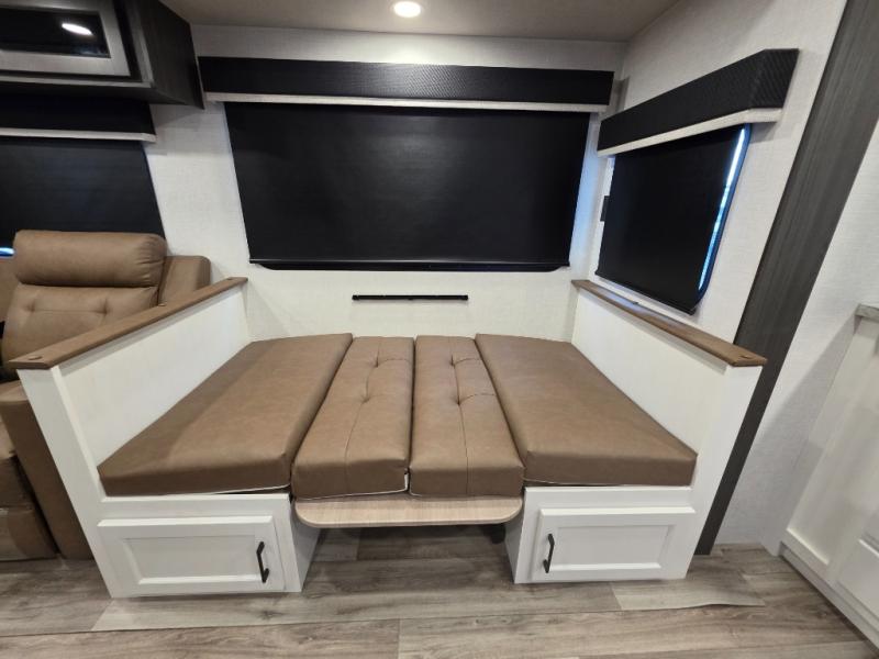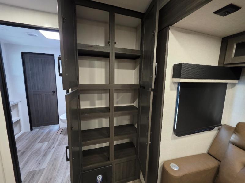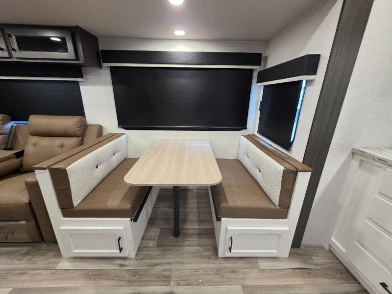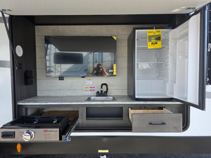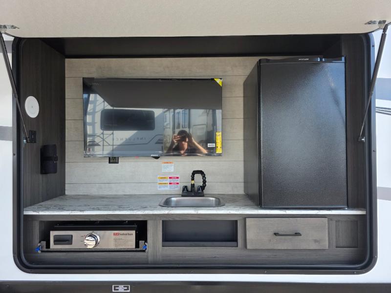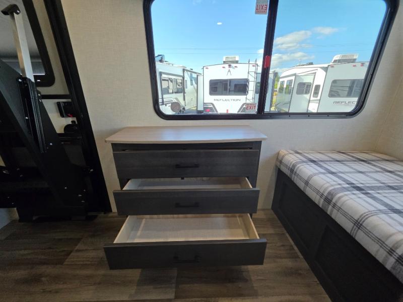 A front kitchen in this travel trailer provides more interior space! Once you have prepared your best meals with the Furrion oven and three burner cooktop, you can head to the Sit N' Slide table with flipside reversible cushions to dine. The 70" sofa also offers a comfortable place to take an afternoon nap or sit while enjoying the entertainment center with a frameless electric fireplace and 40" TV on a swing arm. A walk-thru bath makes it easy for all to enter and has a 30" x 36" shower to freshen up in each morning. The rear private bedroom has a Sleep Tight queen bed slide for a good night's rest, a dresser, two wardrobes, and a bench seat where you sit to put your hiking boots on. You'll also find one of the dual entry doors here for added convenience!
