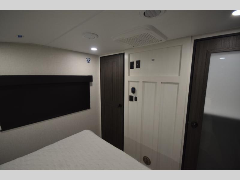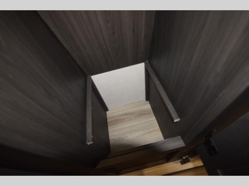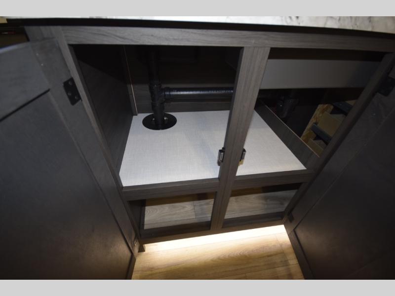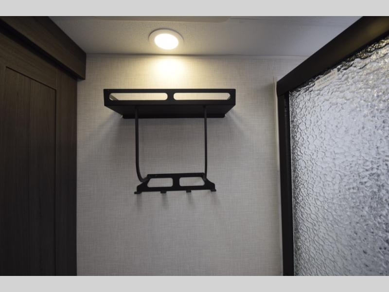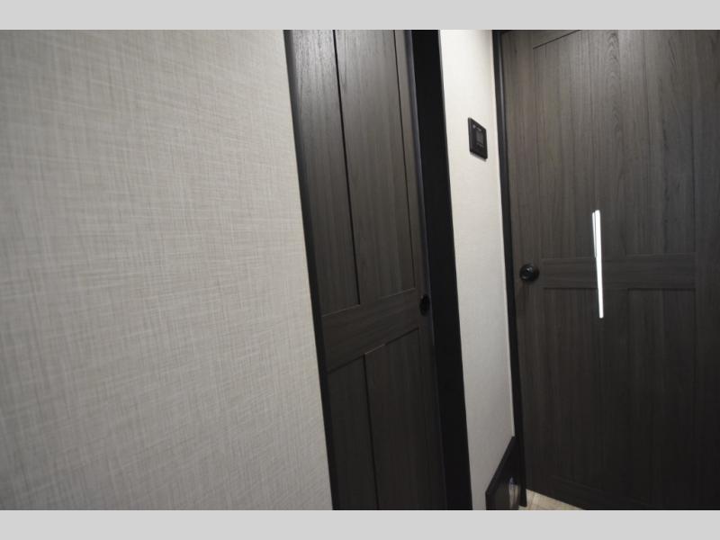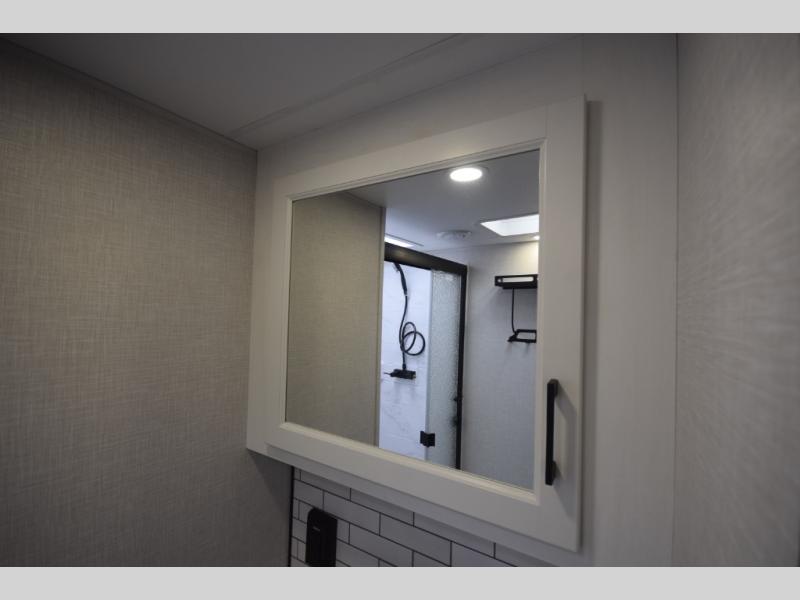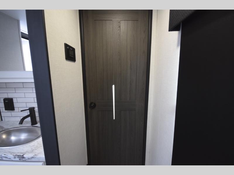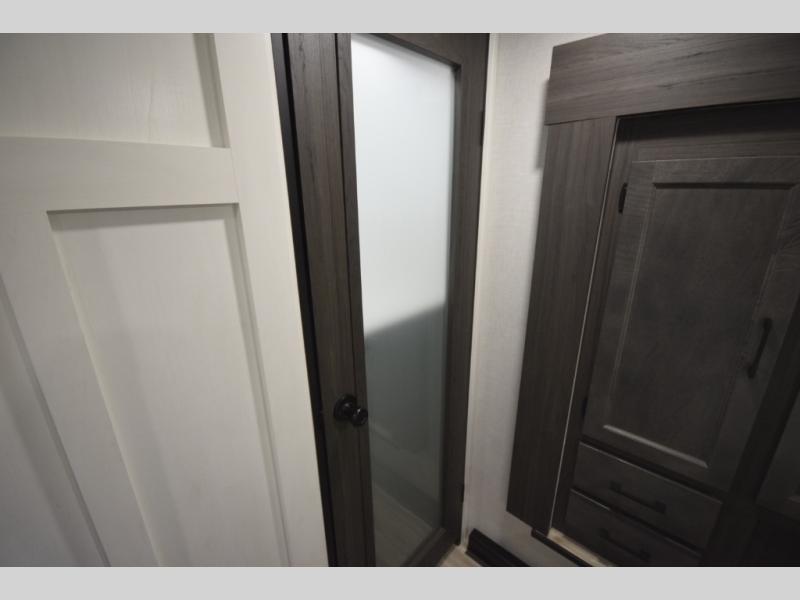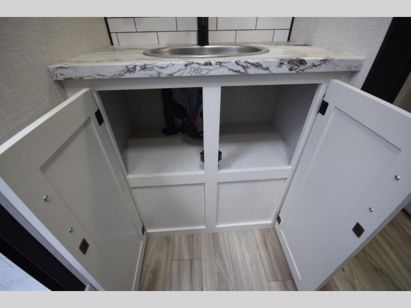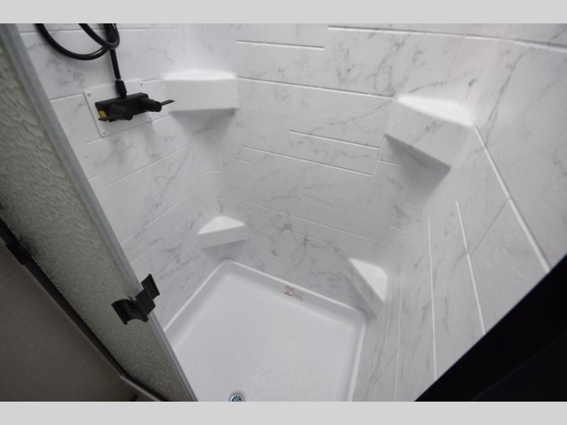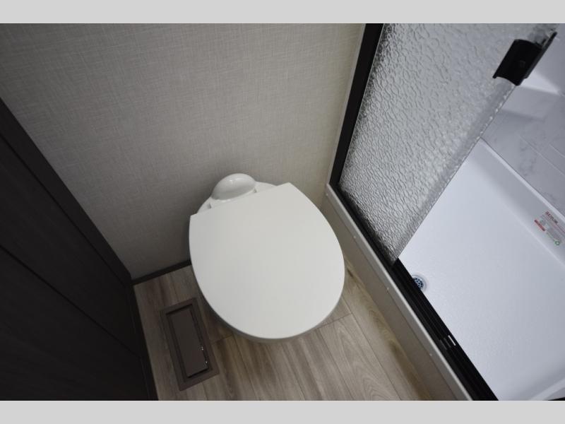 Just down the hall, the full bathroom elevates your camping experience with residential touches, including a 30" x 36" shower with a glass slider door, a porcelain foot-flush toilet, and an oval stainless-steel sink. It's a refreshing place to start your morning or wind down after a day of outdoor adventure.