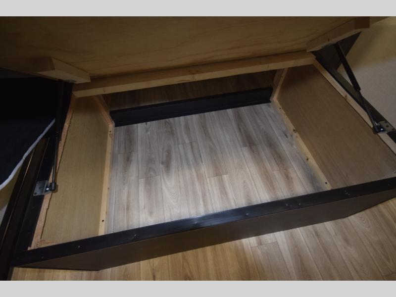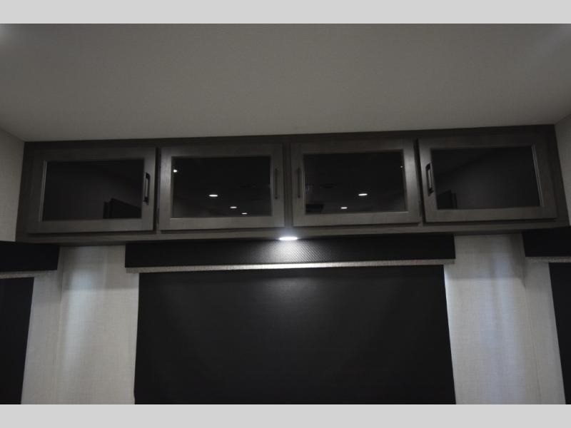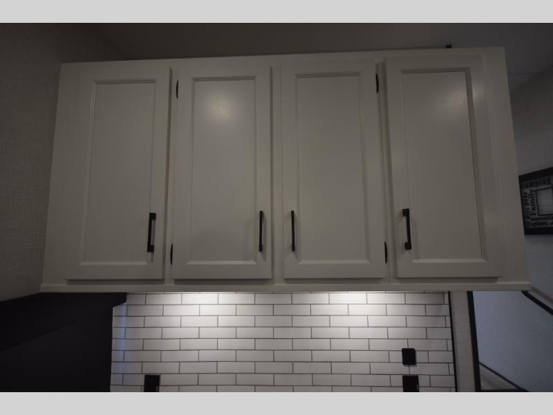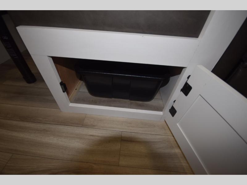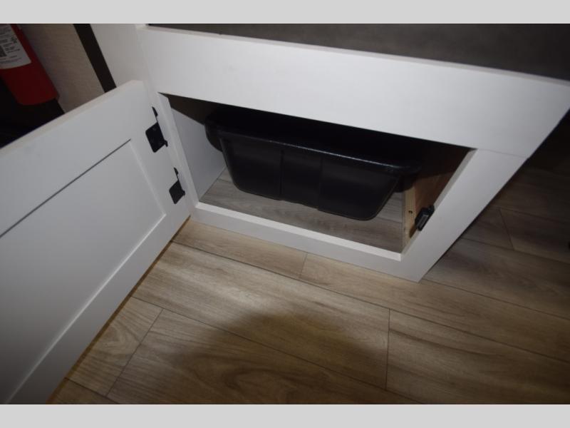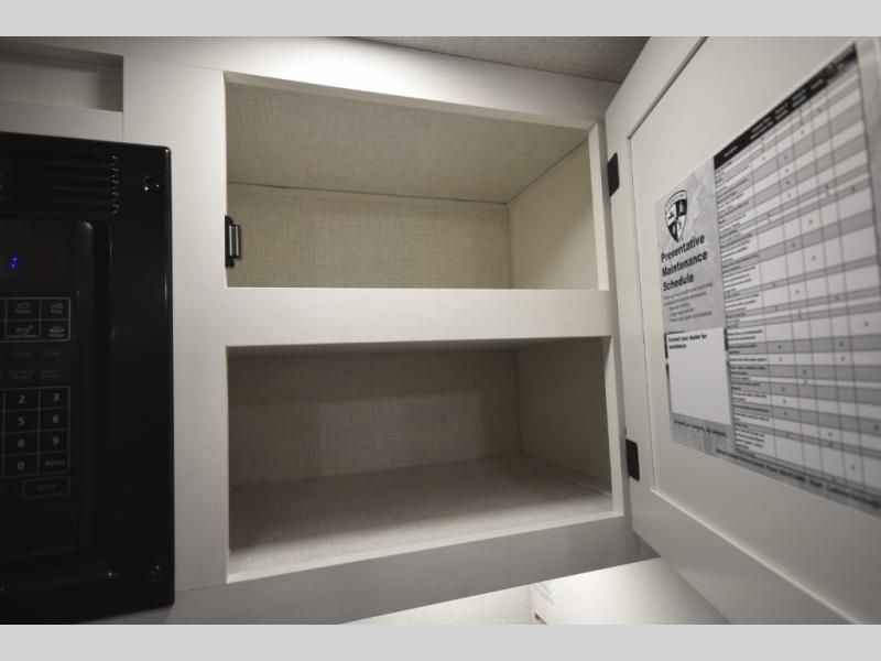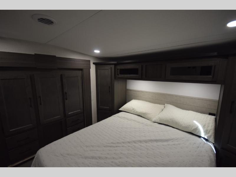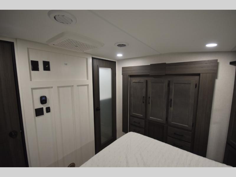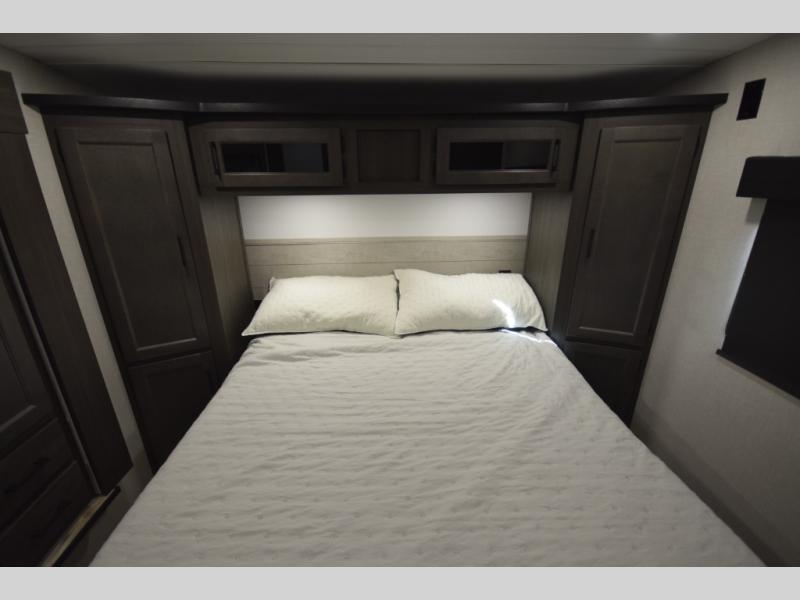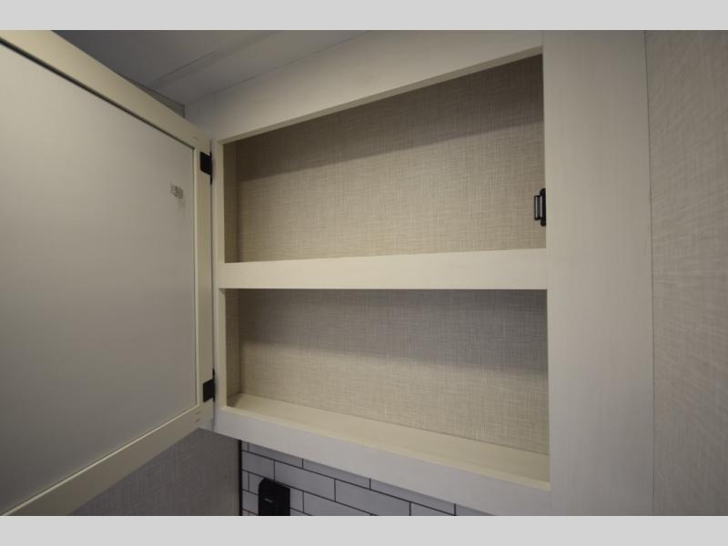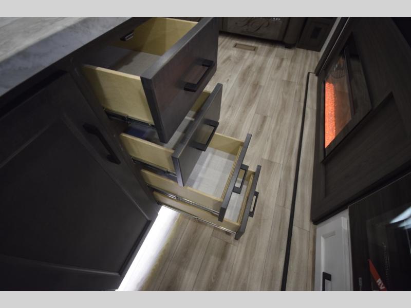 Just down the hall, the full bathroom elevates your camping experience with residential touches, including a 30" x 36" shower with a glass slider door, a porcelain foot-flush toilet, and an oval stainless-steel sink. It's a refreshing place to start your morning or wind down after a day of outdoor adventure.