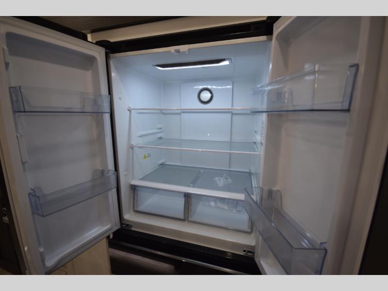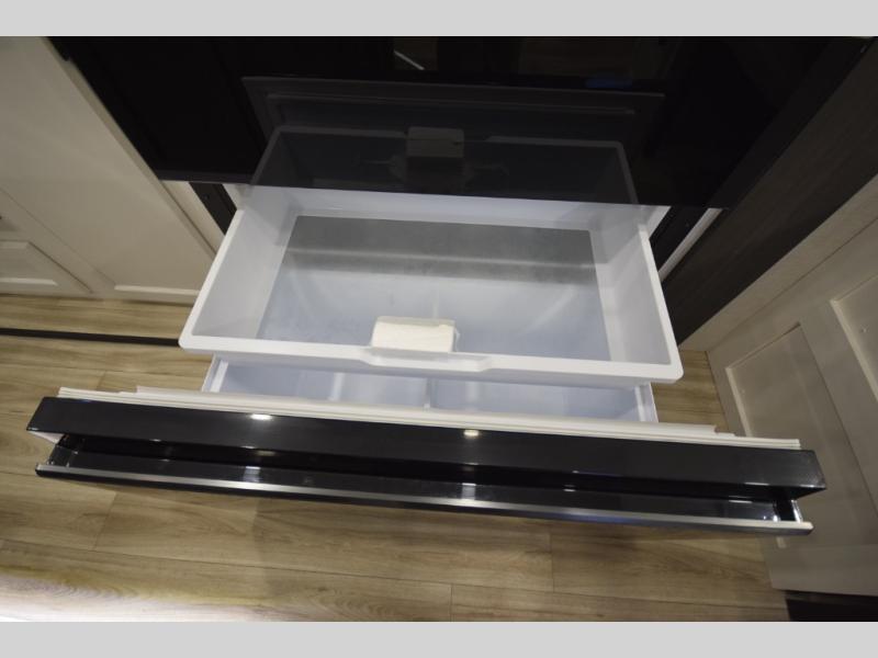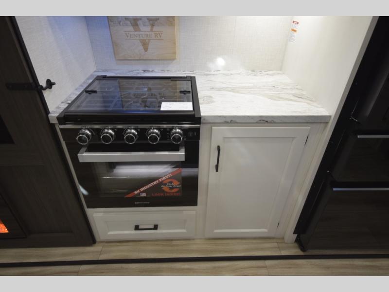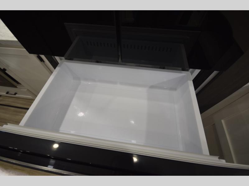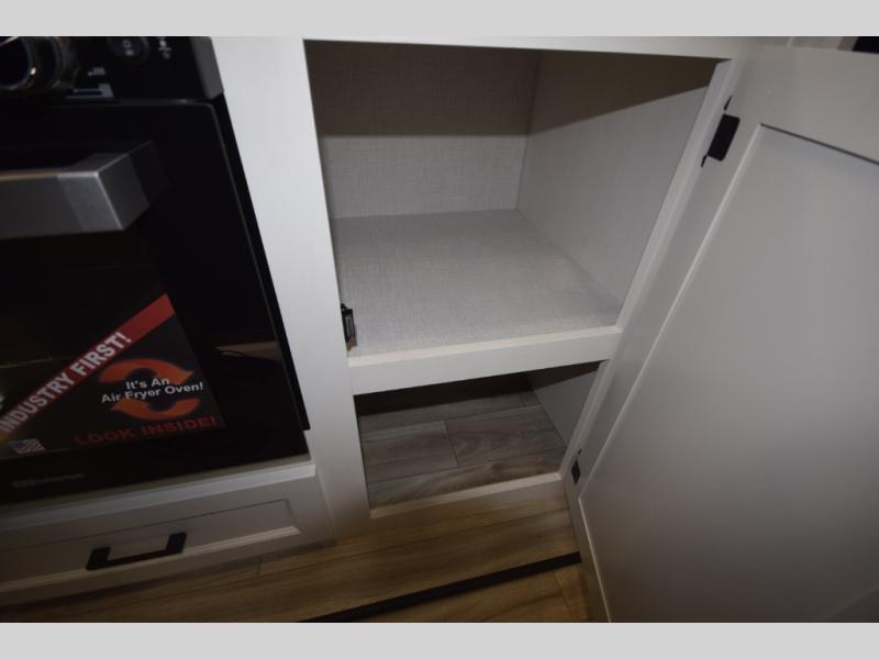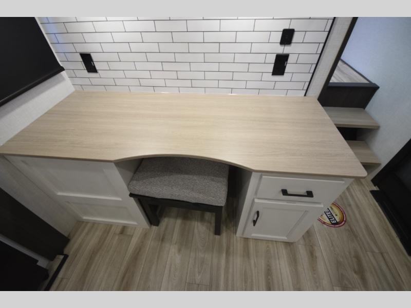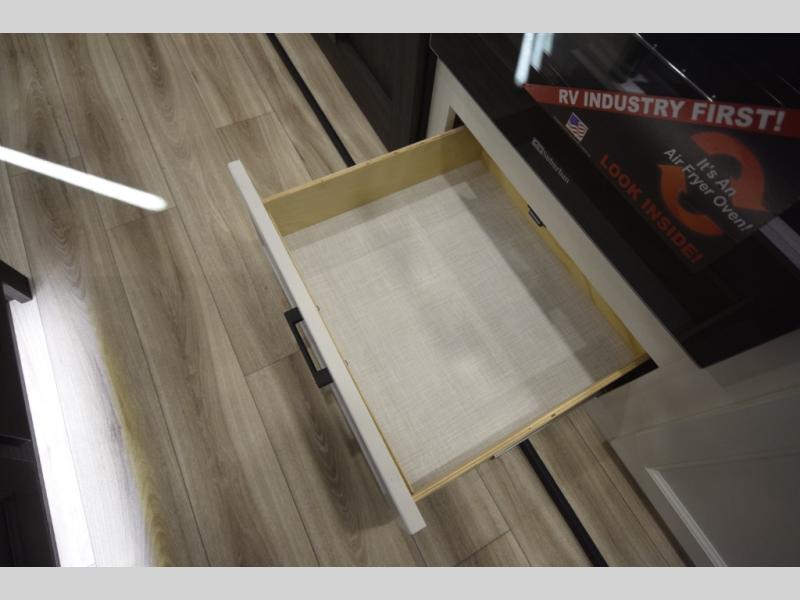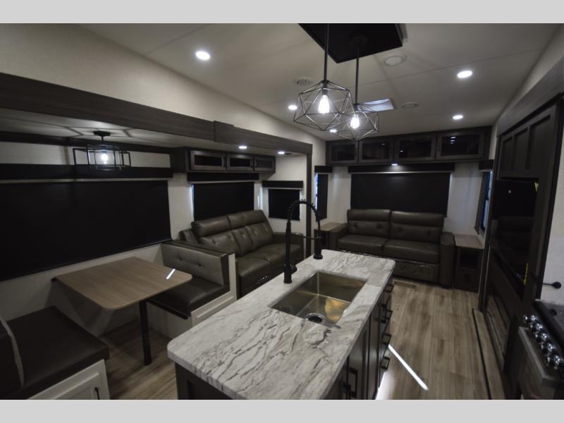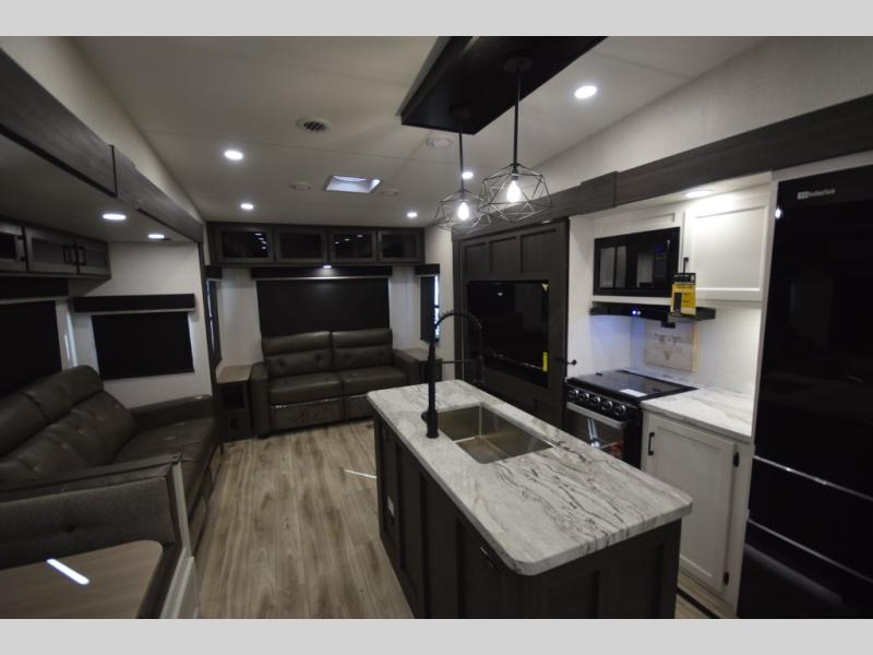 Step into the heart of the fifth wheel and you'll find an open living and kitchen area enhanced by dual opposing slides for maximum floor space. The fully equipped kitchen is ready for every mealtime adventure, featuring a pantry, three-burner range with flush-mount glass cover, 21" oven with an air fryer, microwave, and an 18 cu. ft. refrigerator. The center island adds valuable counter space and a convenient sink for easy prep and cleanup. A nearby desk and hutch offer versatility—perfect for remote work, extra storage, or organizing your travel gear.