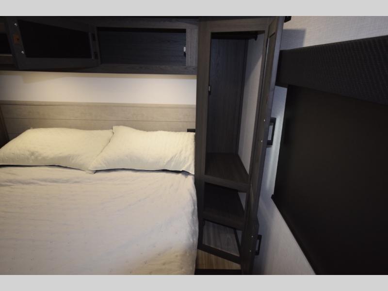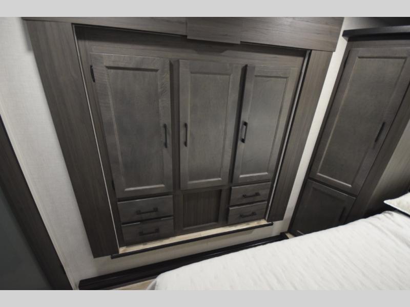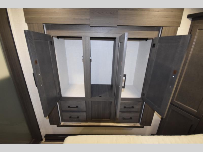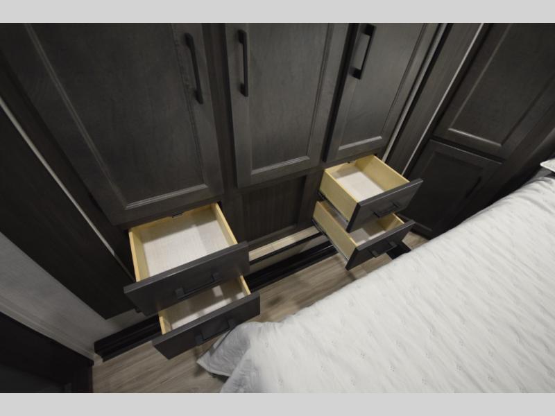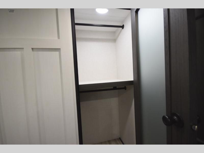 At the front, the private bedroom offers a peaceful getaway with a 60" x 80" Sleep Tight queen bed and a roomy slide-out wardrobe. Extra wardrobes on each side provide plenty of space for clothing, gear, and travel essentials, making long trips easier and more organized.