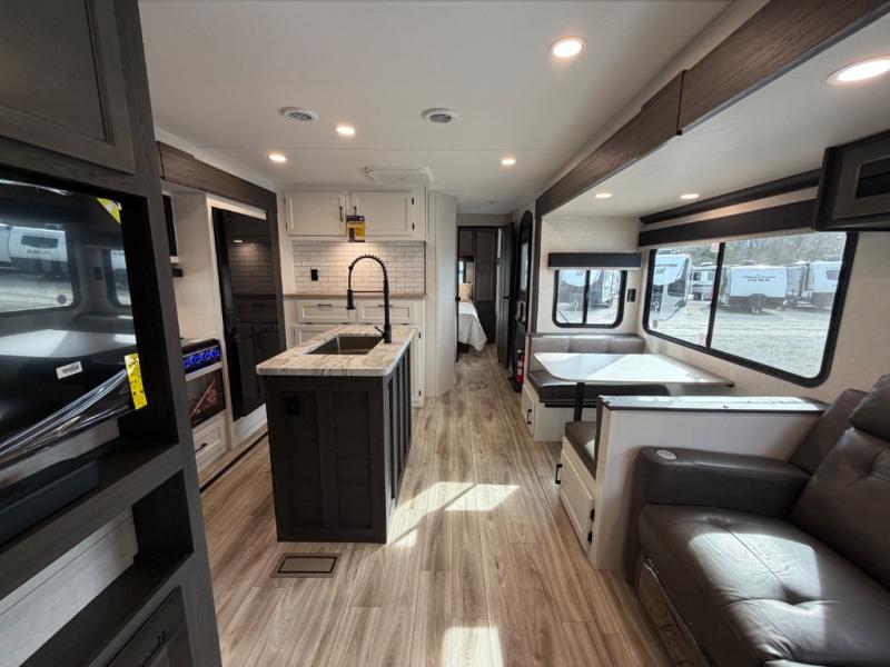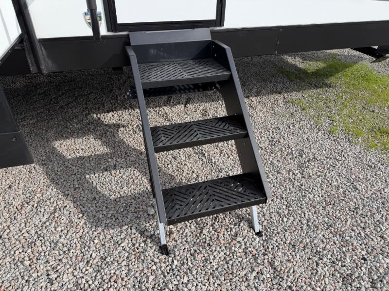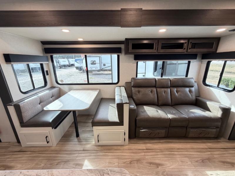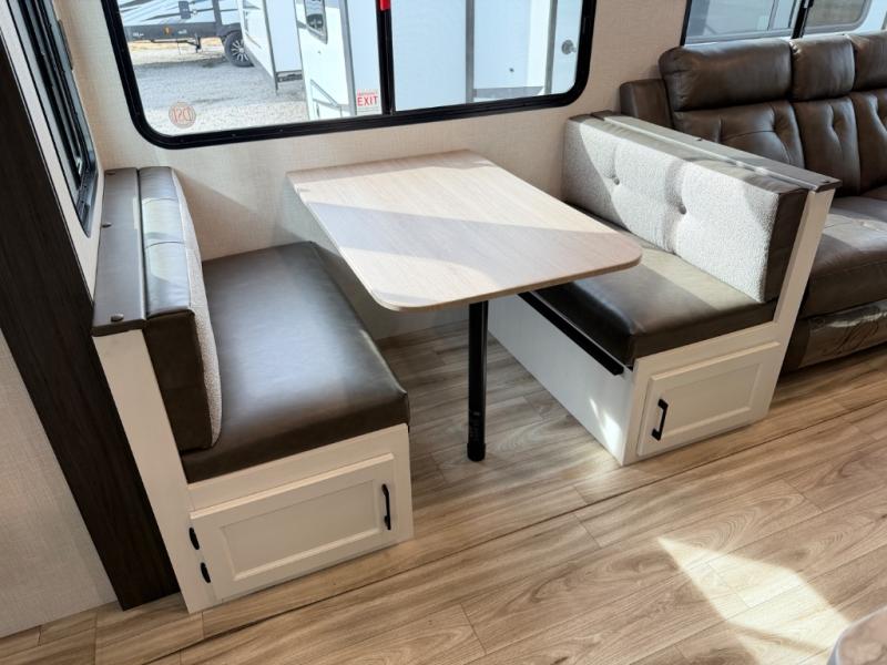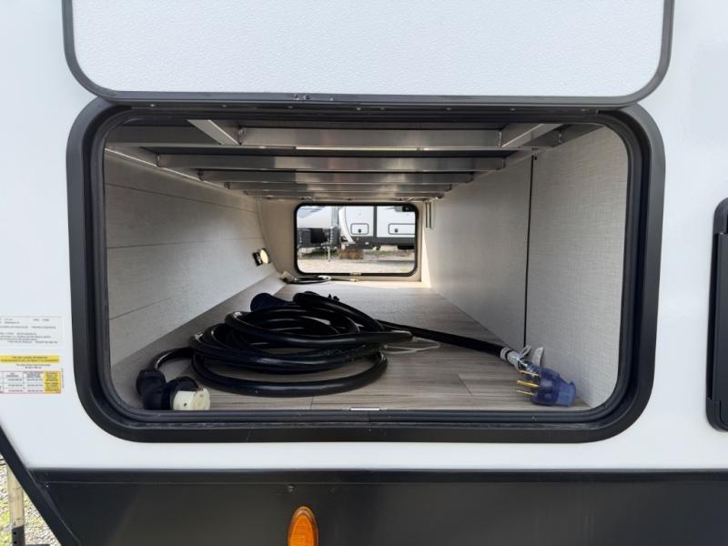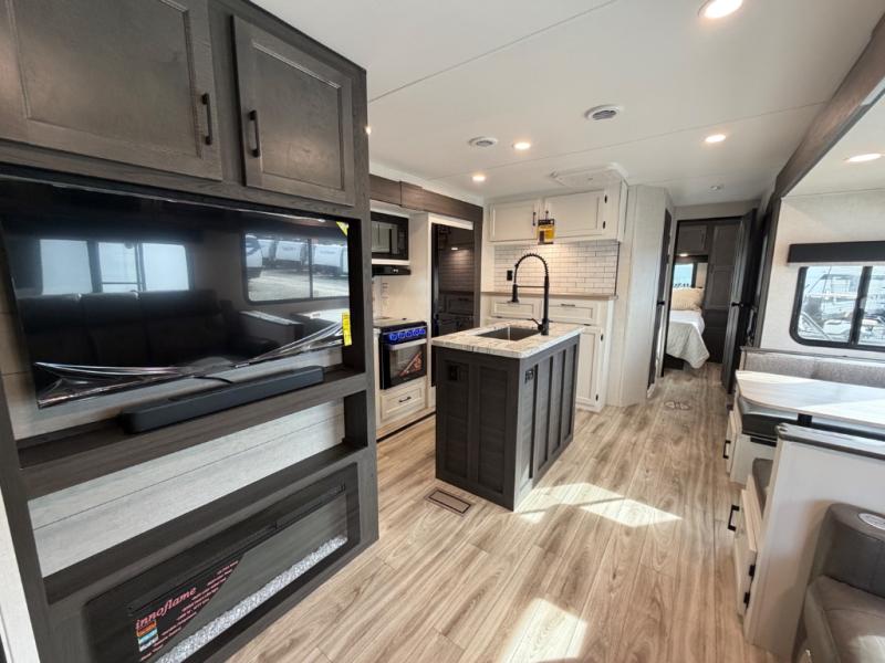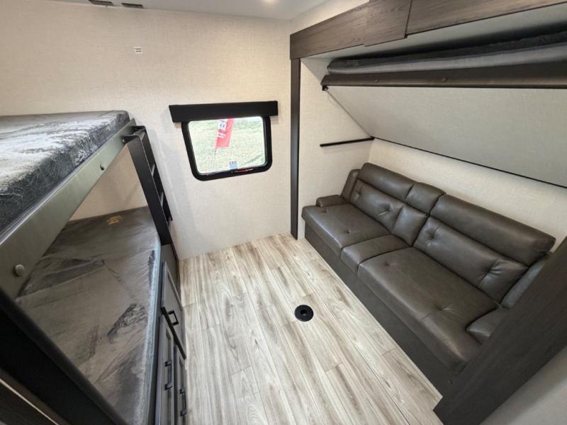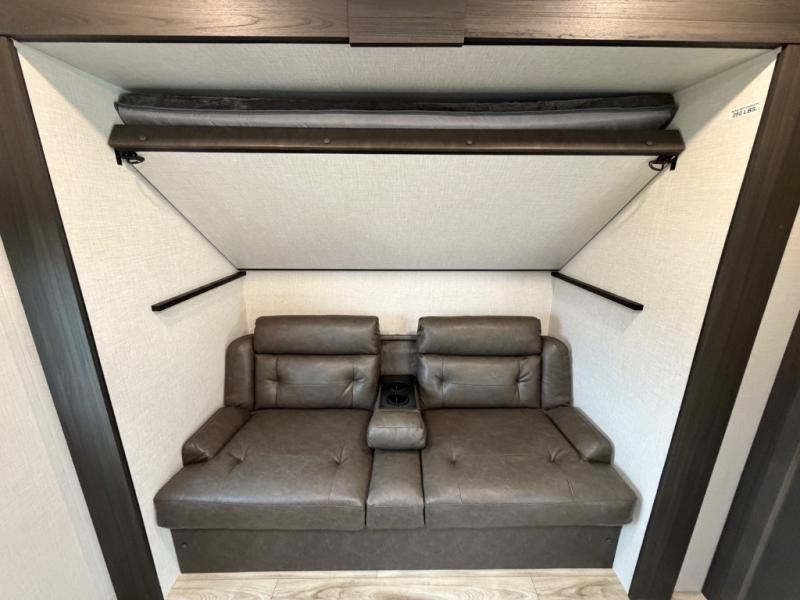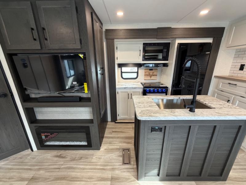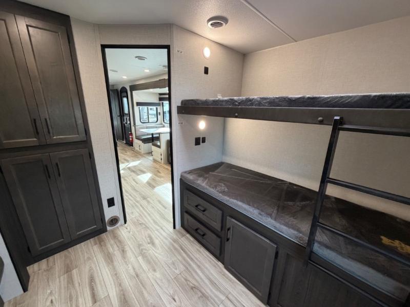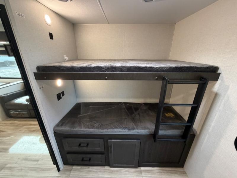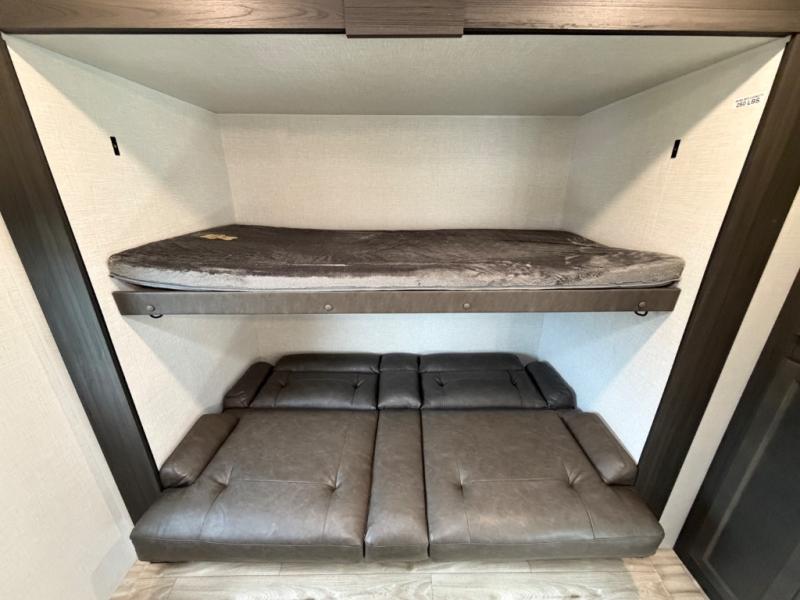 Stay protected rain or shine with the two 10' legless awnings with wind sensors on this travel trailer! Some other exterior features you will enjoy include a campfire café with a 40" TV to watch the big game while you grill steaks on the griddle, and the pass-through storage area with slam latch baggage doors will keep your gear in place. Inside, there is a rear private bunkhouse with a closet, a 32" x 70" flip-up bunk above a 70" sofa with a table, and a 28" x 70" bunk above a 40" x 70" bottom bunk. The living area has a sofa across from an entertainment center with a frameless fireplace and a 40" TV with a swing arm so others can watch it from the Sit N' Slide table. The dual entry bathroom has a 34" radius shower to freshen up in, and is easy to access, especially those staying in the front private bedroom!