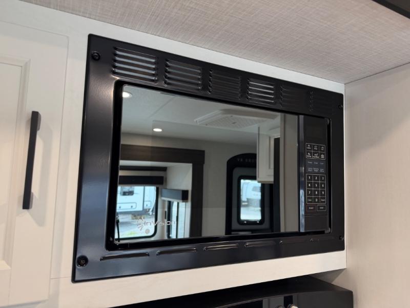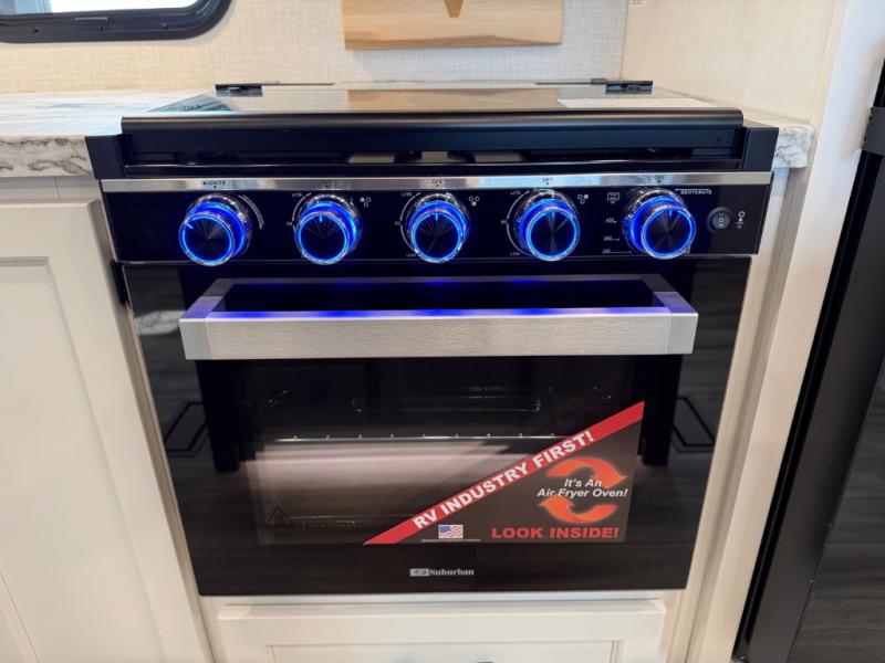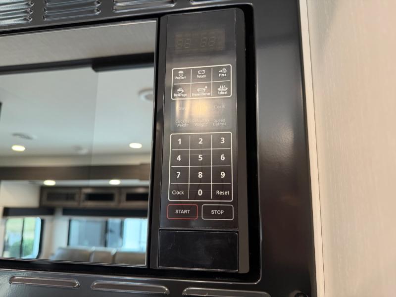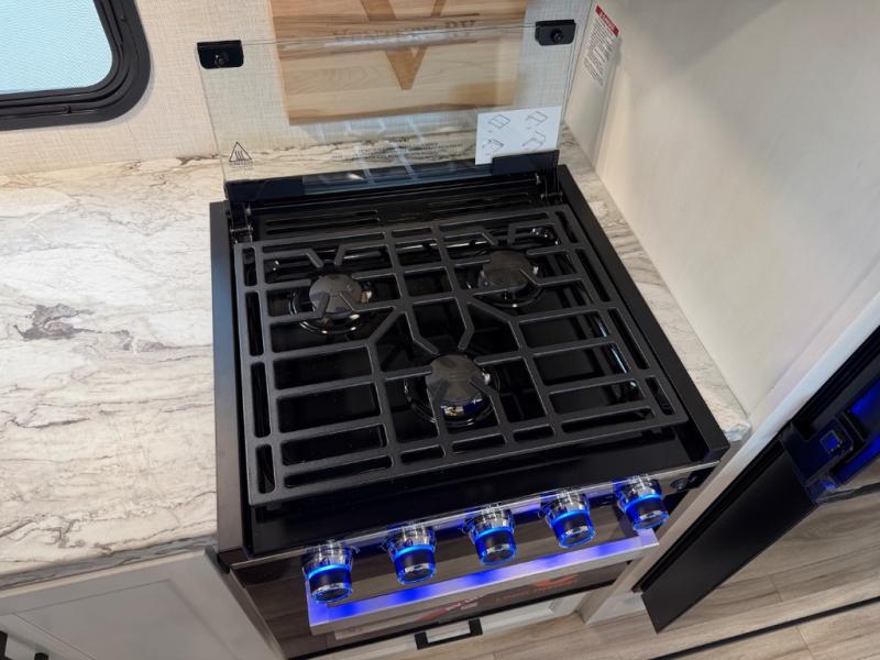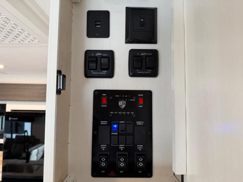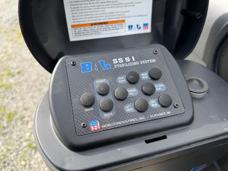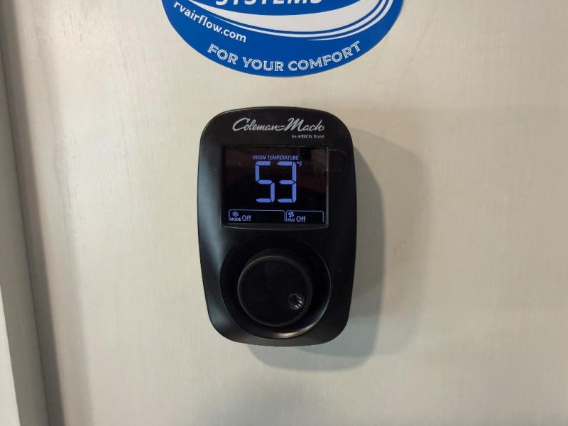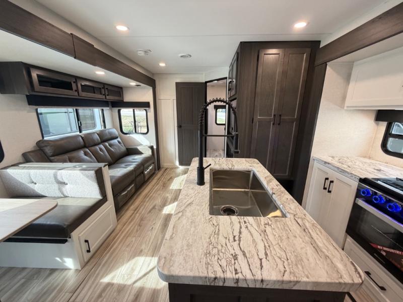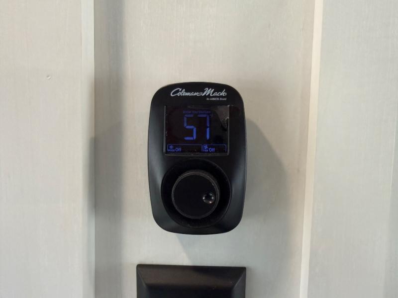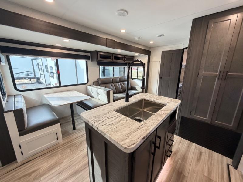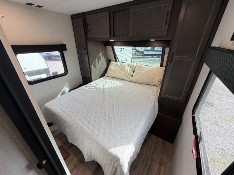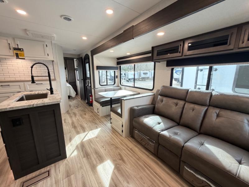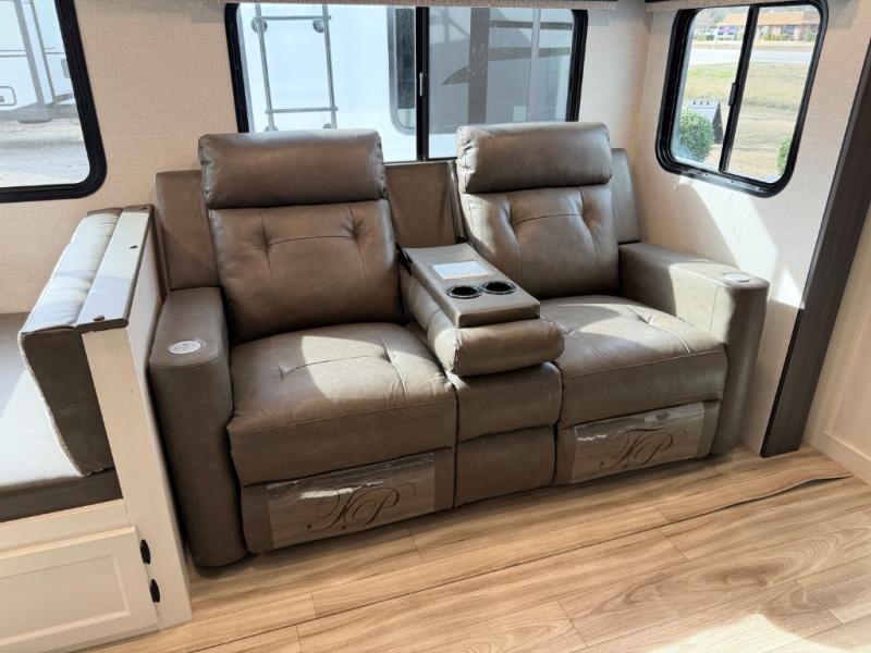 Stay protected rain or shine with the two 10' legless awnings with wind sensors on this travel trailer! Some other exterior features you will enjoy include a campfire café with a 40" TV to watch the big game while you grill steaks on the griddle, and the pass-through storage area with slam latch baggage doors will keep your gear in place. Inside, there is a rear private bunkhouse with a closet, a 32" x 70" flip-up bunk above a 70" sofa with a table, and a 28" x 70" bunk above a 40" x 70" bottom bunk. The living area has a sofa across from an entertainment center with a frameless fireplace and a 40" TV with a swing arm so others can watch it from the Sit N' Slide table. The dual entry bathroom has a 34" radius shower to freshen up in, and is easy to access, especially those staying in the front private bedroom!