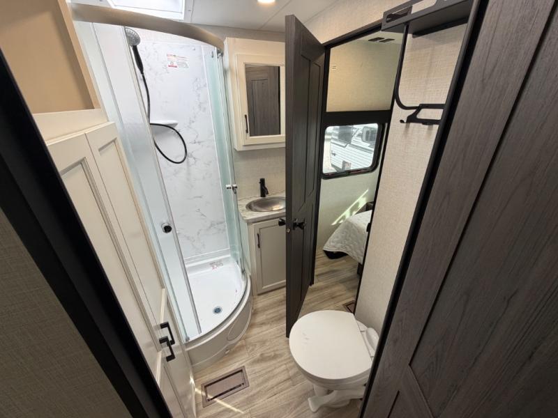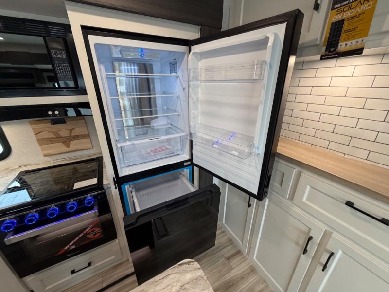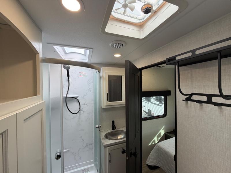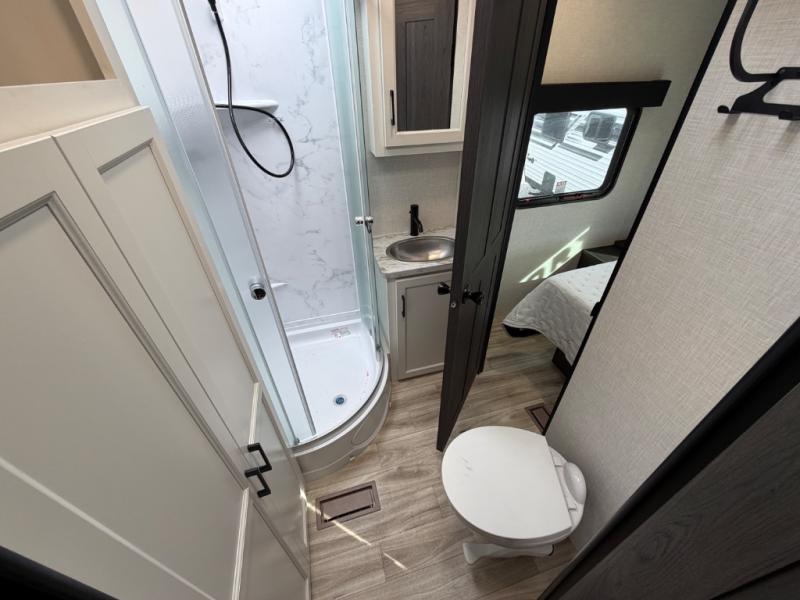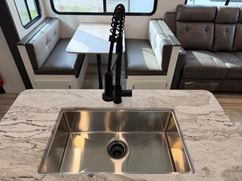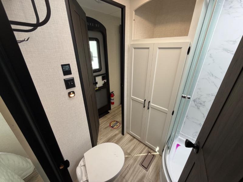 Every Venture RV SportTrek lightweight travel trailer is constructed to offer peace of mind and the comforts of home! Their purposeful residential kitchens are packed with handy features like a Furrion oven and three burner cooktop, a large stainless steel sink with a cover and dish drying rack, plus a 12V refrigerator. You will find plenty of storage throughout, including Safe-Tek hidden storage with a charging center and StorMore nightstands on either side of the bed behind the full-length closets. And the magnetic slam-latch baggage doors and spacious pass-through storage area will hold your outdoor gear in place. They even come with a hot and cold exterior shower and SporTrek's Weather Shield which includes a forced air heated and enclosed underbelly, radiant foil insulation wrapped tanks, and more features that will let you extend your camping season. You will also love the new residential upgraded furniture, Serta memory foam mattress, barn style passage doors, and many more comforts!