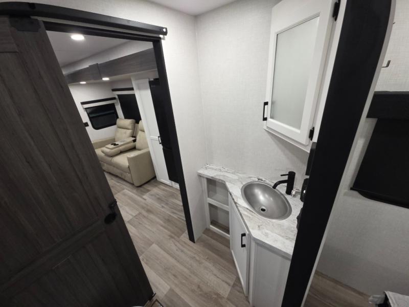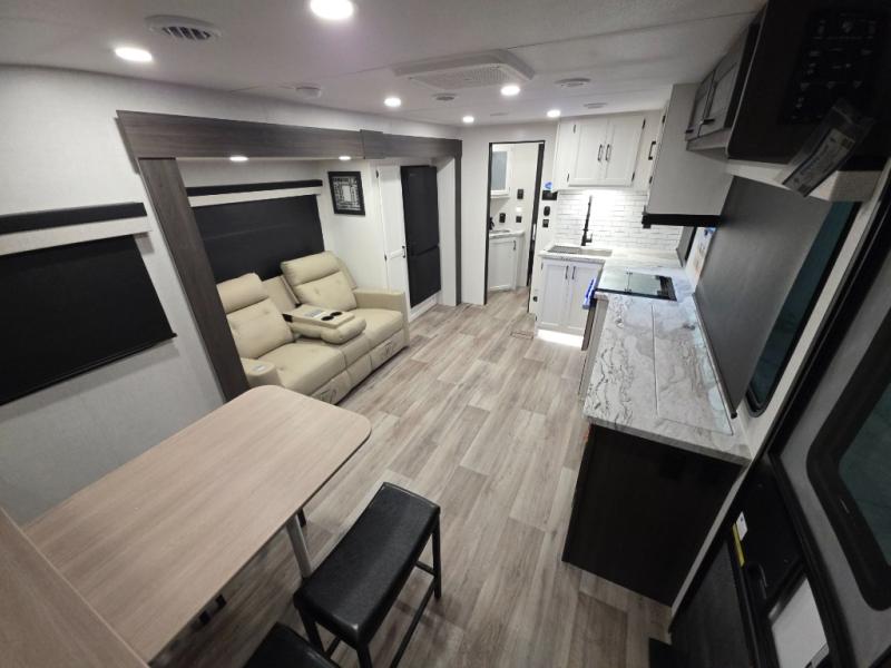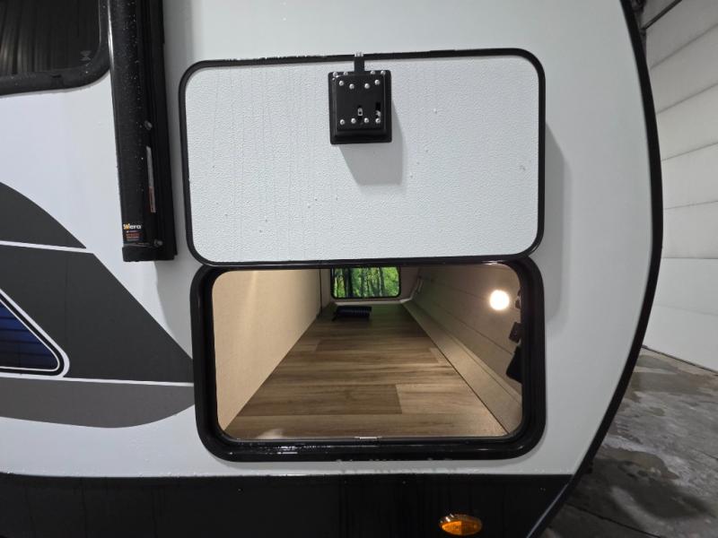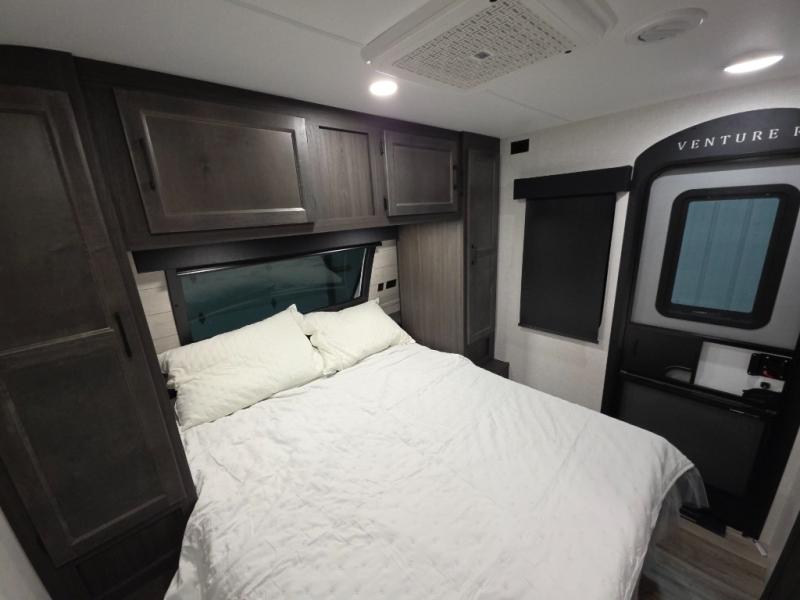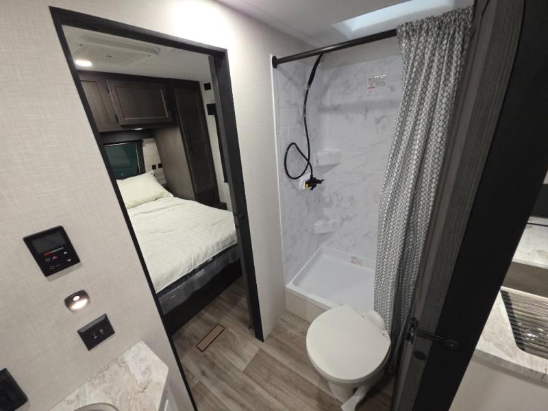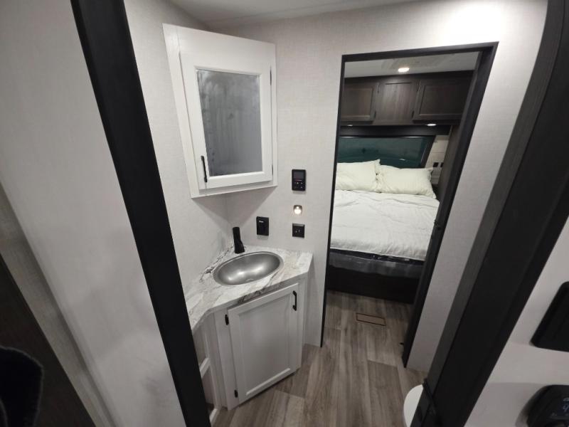 Every Venture RV SportTrek lightweight travel trailer is constructed to offer peace of mind and the comforts of home! Their purposeful residential kitchens are packed with handy features like a Furrion oven and three burner cooktop, a large stainless steel sink with a cover and dish drying rack, plus a 12V refrigerator. You will find plenty of storage throughout, including Safe-Tek hidden storage with a charging center and StorMore nightstands on either side of the bed behind the full-length closets. And the magnetic slam-latch baggage doors and spacious pass-through storage area will hold your outdoor gear in place. They even come with a hot and cold exterior shower and SporTrek's Weather Shield which includes a forced air heated and enclosed underbelly, radiant foil insulation wrapped tanks, and more features that will let you extend your camping season. You will also love the new residential upgraded furniture, Serta memory foam mattress, barn style passage doors, and many more comforts!