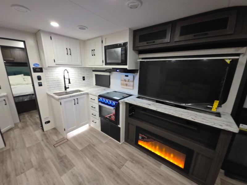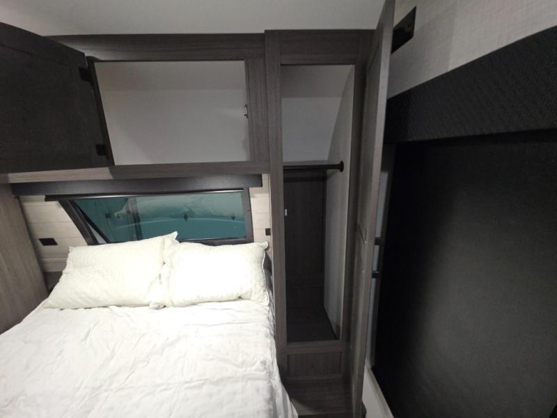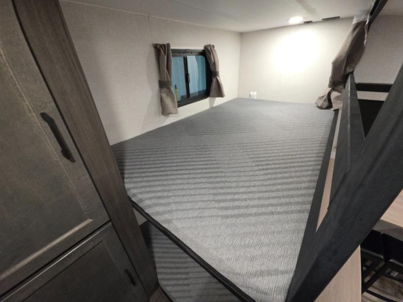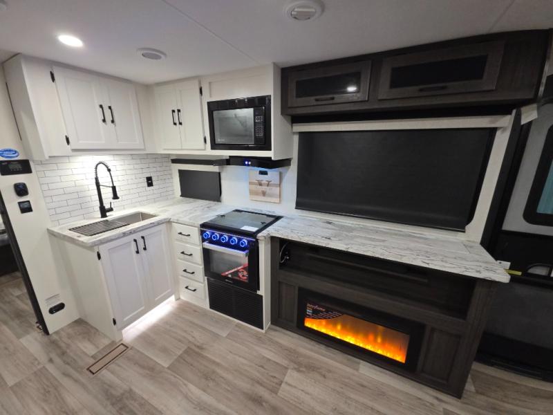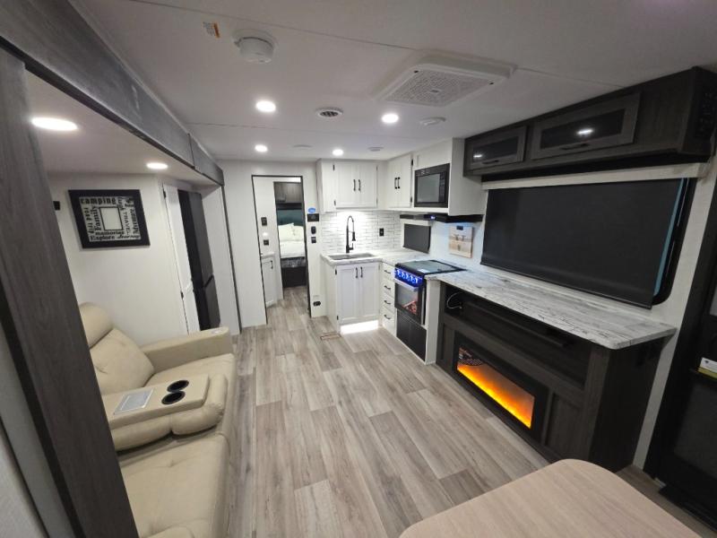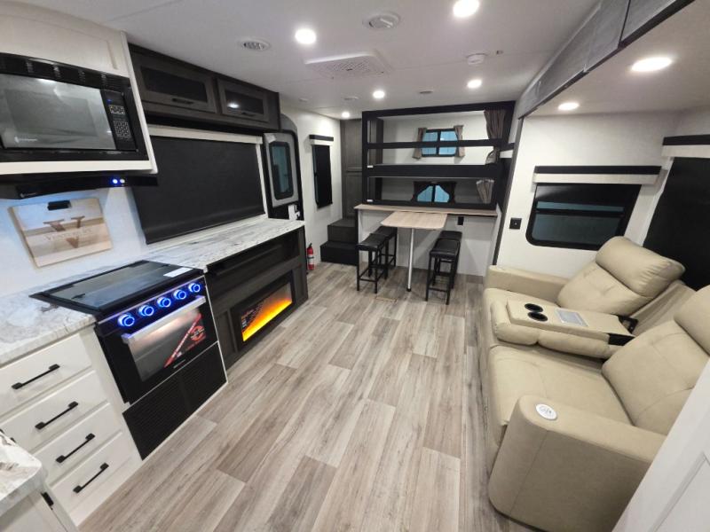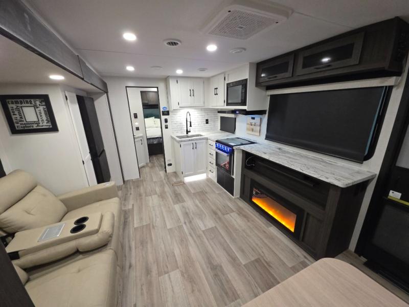 You'll feel right at home in this dual entry travel trailer. There are rear 40" x 70" bunk beds with a wardrobe for your guests' things, and you'll enjoy the front master bedroom with a Sleep Tight queen bed. There are also dual bedside wardrobes here, one of the dual entry doors, and a private entrance into the walk-thru bath. Everyone can meet in the combined kitchen and living area that includes a bar with a sit n' slide table along with theater seating, an entertainment center with a fireplace, plus all the appliances to make your best meals.