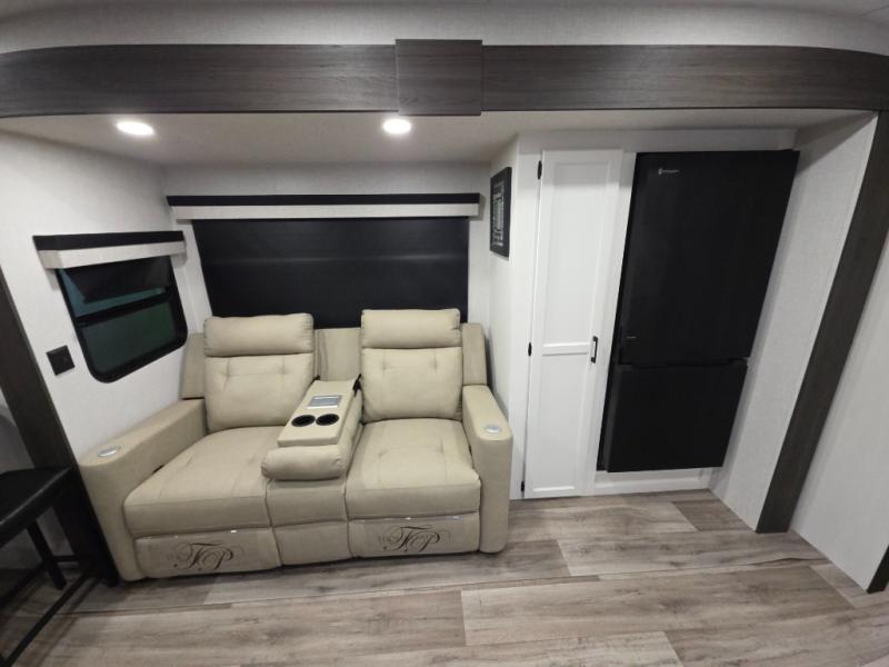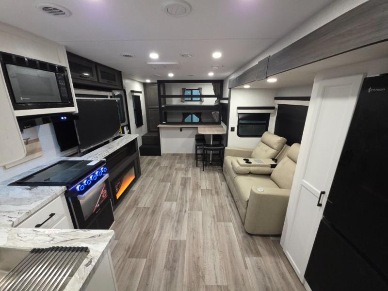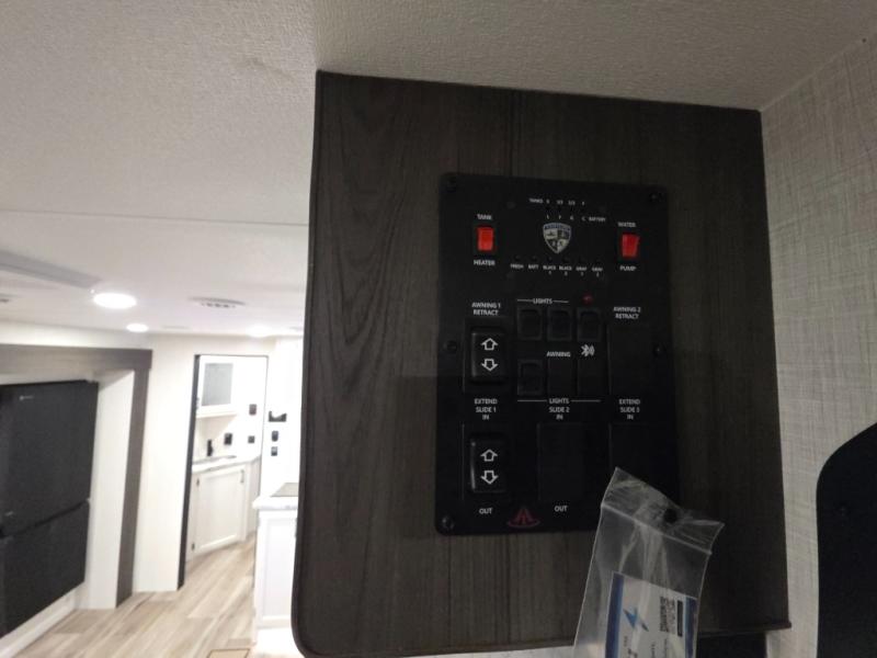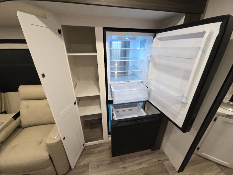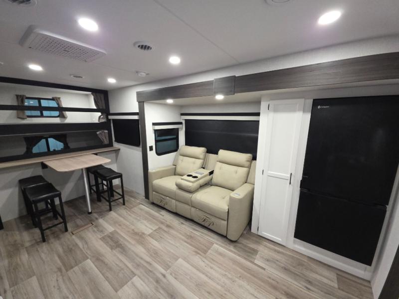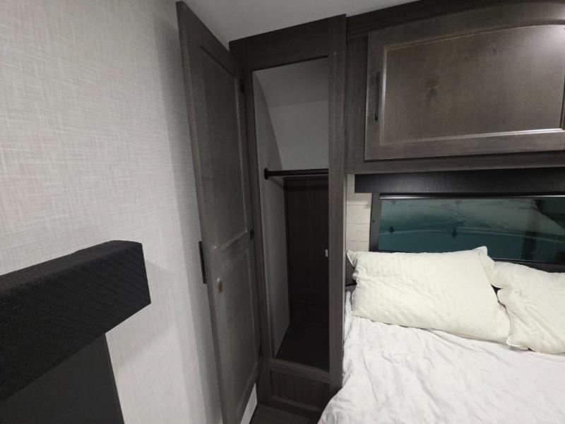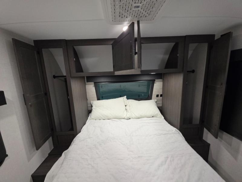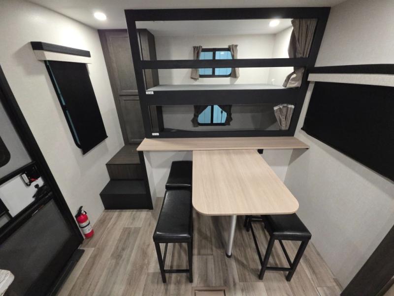 You'll feel right at home in this dual entry travel trailer. There are rear 40" x 70" bunk beds with a wardrobe for your guests' things, and you'll enjoy the front master bedroom with a Sleep Tight queen bed. There are also dual bedside wardrobes here, one of the dual entry doors, and a private entrance into the walk-thru bath. Everyone can meet in the combined kitchen and living area that includes a bar with a sit n' slide table along with theater seating, an entertainment center with a fireplace, plus all the appliances to make your best meals.