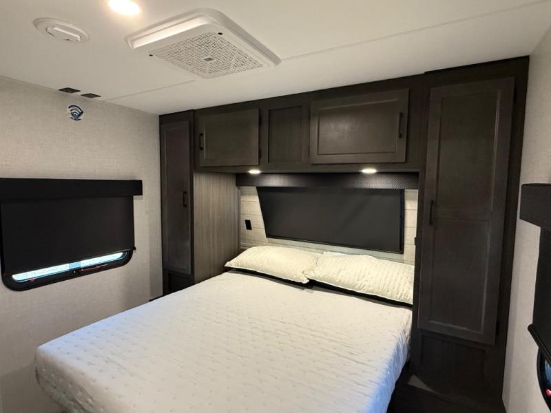 Every Venture RV SportTrek lightweight travel trailer is constructed to offer peace of mind and the comforts of home! Their purposeful residential kitchens are packed with handy features like a Furrion oven and three burner cooktop, a large stainless steel sink with a cover and dish drying rack, plus a 12V refrigerator. You will find plenty of storage throughout, including Safe-Tek hidden storage with a charging center and StorMore nightstands on either side of the bed behind the full-length closets, and the magnetic slam-latch baggage doors and spacious pass-through storage area will hold your outdoor gear in place. They even come with a hot and cold exterior shower and SporTrek's Weather Shield which includes a forced air heated and enclosed underbelly, radiant foil insulation wrapped tanks, and more features that will let you extend your camping season. You will also love the new residential upgraded furniture, Serta memory foam mattress, barn style passage doors, and many more comforts!
