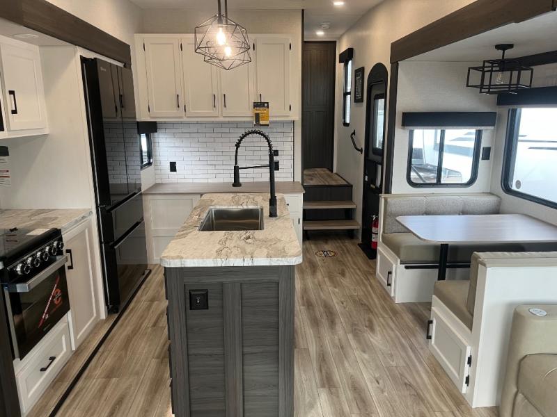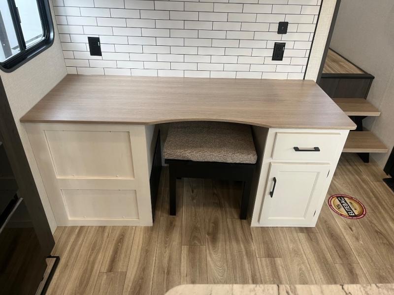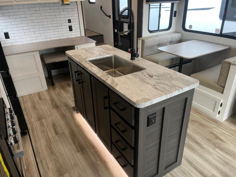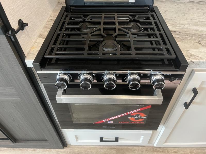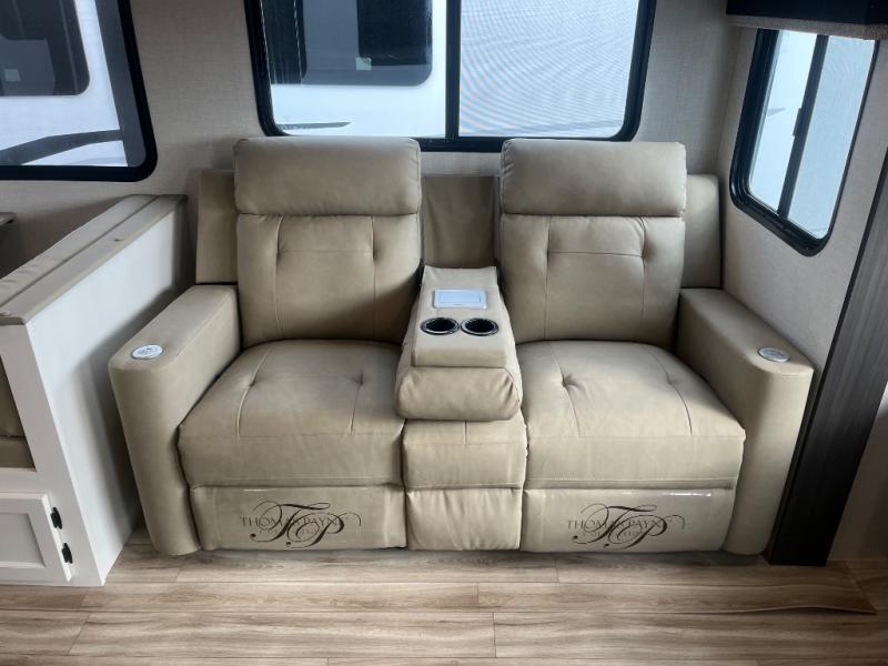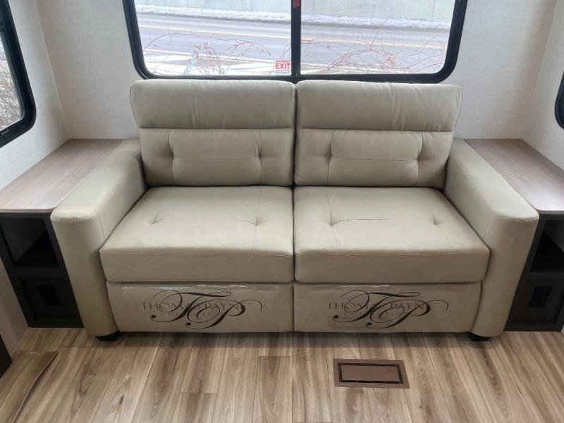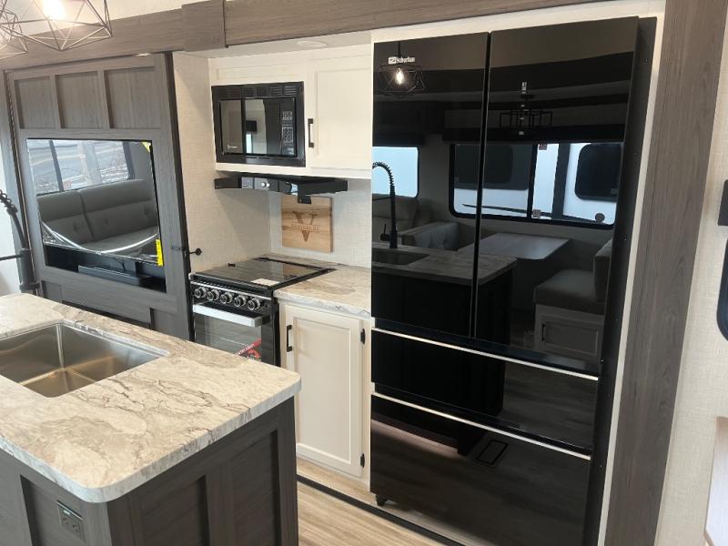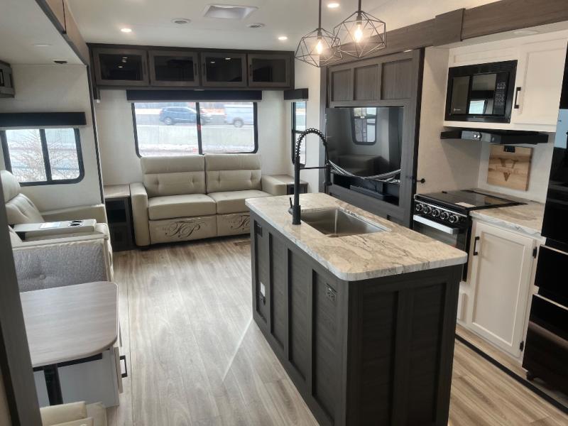 At the front of the fifth wheel, you’ll find a private bedroom designed for rest and relaxation, featuring a 60" x 80" Sleep Tight queen bed and a spacious slide-out wardrobe, with additional wardrobes on each side for all your clothing and essentials. Down the hall, the full bathroom offers residential comfort with a 30" x 36" shower with glass slider door, a porcelain foot-flush toilet, and an oval stainless-steel sink. In the center and rear, the open living and kitchen area features dual opposing slides for generous floor space. The fully equipped kitchen includes a pantry, three-burner range with flush-mount glass cover, 21" oven with air fryer, microwave, and a large 18 cu. ft. refrigerator, plus a center island with sink and added counter space. Nearby, a desk and hutch provide versatility for work or storage, while the table with chairs and Versa benches and theater seating make it easy to dine or relax. At the rear, a 70" tri-fold sofa offers the perfect spot to unwind and easily converts into extra-sleeping space when needed.