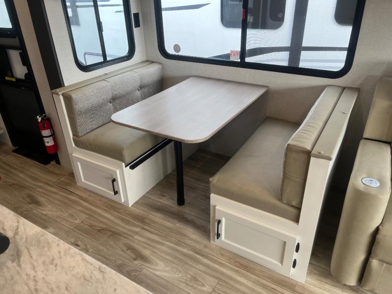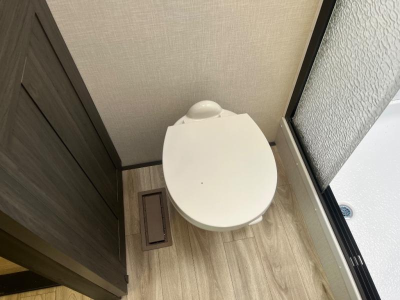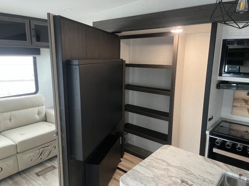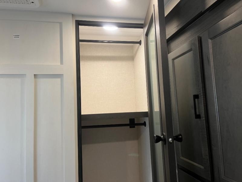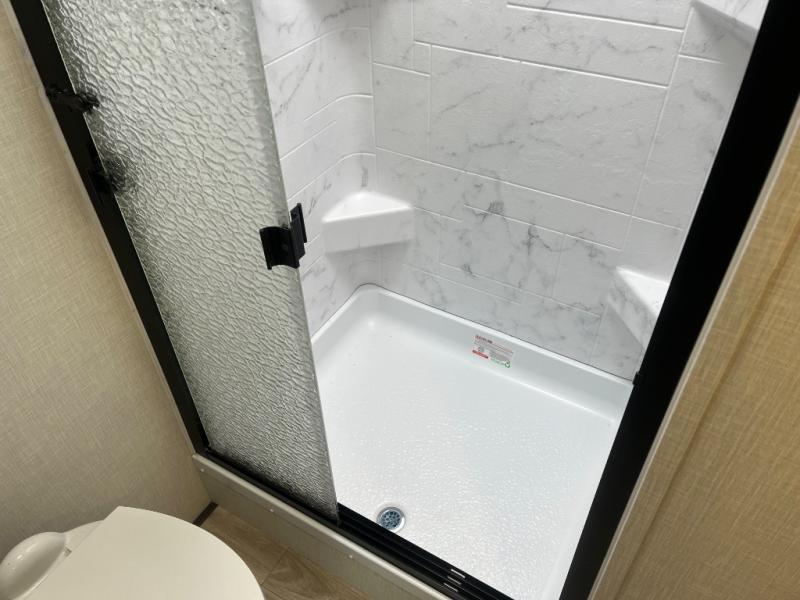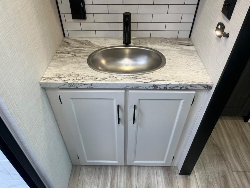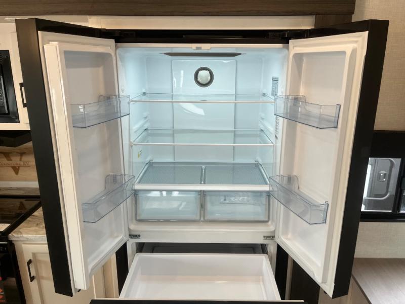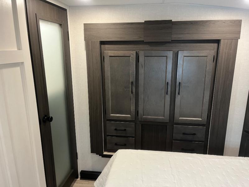 At the front of the fifth wheel, you’ll find a private bedroom designed for rest and relaxation, featuring a 60" x 80" Sleep Tight queen bed and a spacious slide-out wardrobe, with additional wardrobes on each side for all your clothing and essentials. Down the hall, the full bathroom offers residential comfort with a 30" x 36" shower with glass slider door, a porcelain foot-flush toilet, and an oval stainless-steel sink. In the center and rear, the open living and kitchen area features dual opposing slides for generous floor space. The fully equipped kitchen includes a pantry, three-burner range with flush-mount glass cover, 21" oven with air fryer, microwave, and a large 18 cu. ft. refrigerator, plus a center island with sink and added counter space. Nearby, a desk and hutch provide versatility for work or storage, while the table with chairs and Versa benches and theater seating make it easy to dine or relax. At the rear, a 70" tri-fold sofa offers the perfect spot to unwind and easily converts into extra-sleeping space when needed.