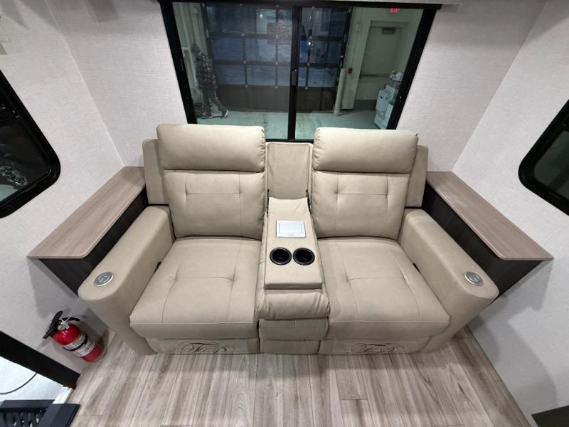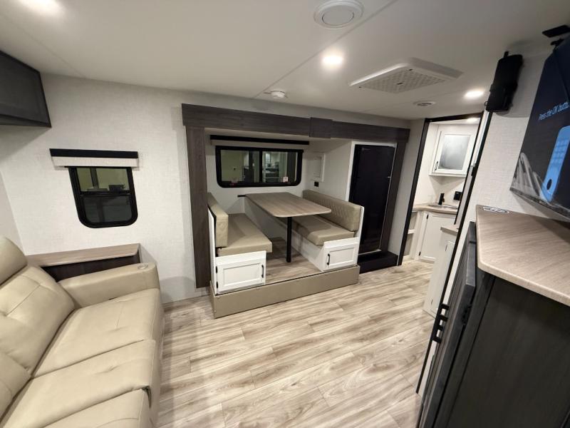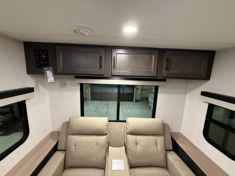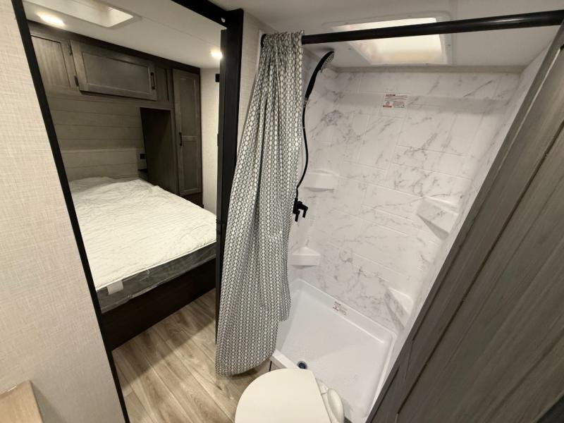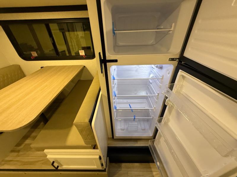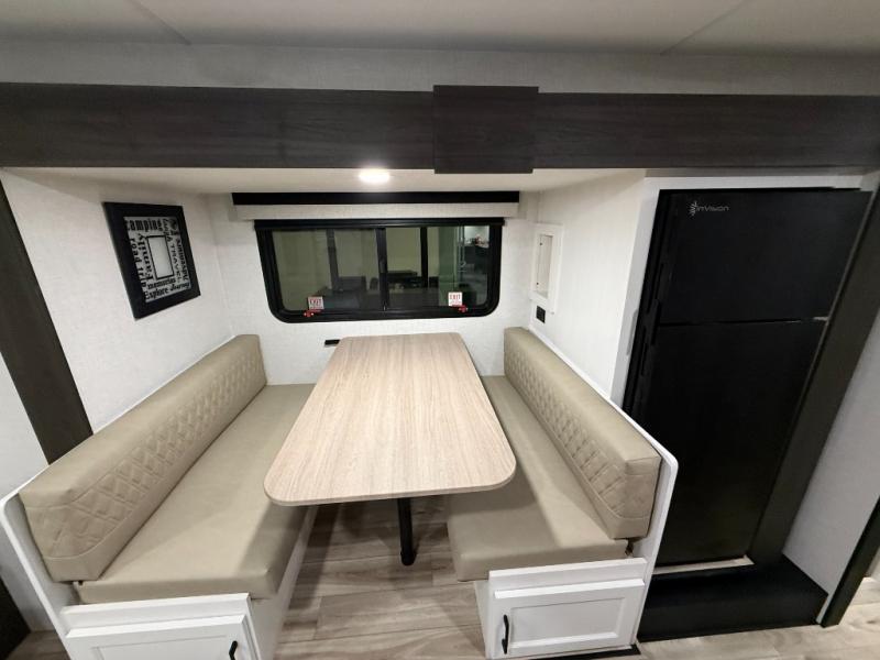 This trailer offers a smart and comfortable layout designed for relaxation and convenience. At the front, the private bedroom features a 60" x 75" bed for a restful night’s sleep, with wardrobes on each side for clothing storage and an overhead cabinet for added space. Moving down the hall, the pass-through bathroom includes a spacious 30" x 36" shower and a linen shelf to keep toiletries organized. Toward the rear, the living and kitchen area opens up with a slide-out that houses a 64" x 46" Sit N Slide dinette, perfect for dining, playing board games, or converting into extra sleeping space at night. Nearby, the 8 cu. ft. refrigerator provides ample room for groceries and drinks. Across from the dinette, the L-shaped kitchen offers generous counter space, a three-burner cooktop, a microwave, and plenty of overhead cabinets for storage. At the rear, there is also the option to add theater seating, creating a comfortable spot to relax and enjoy your downtime.