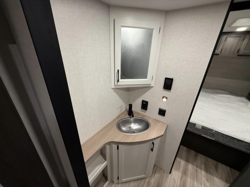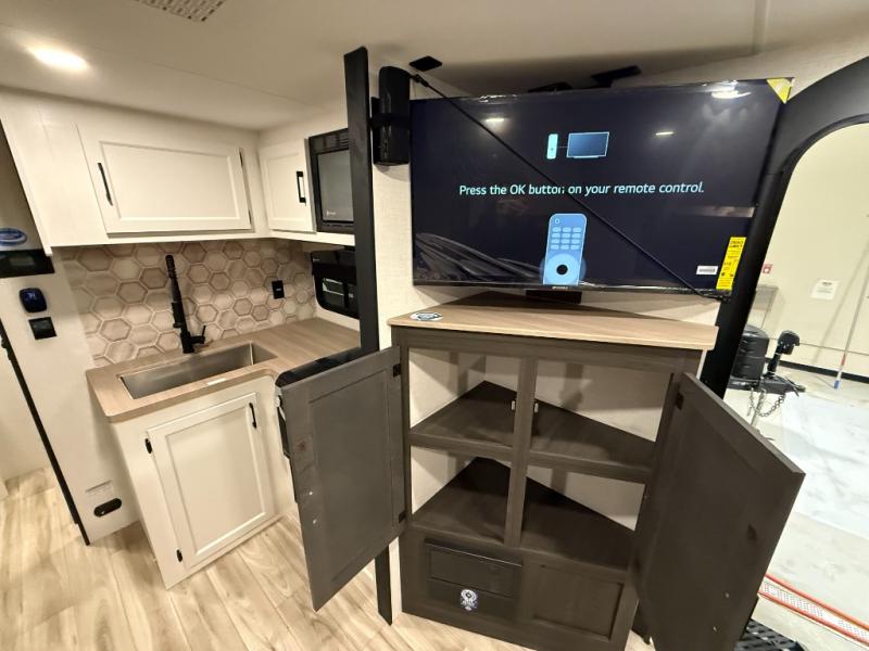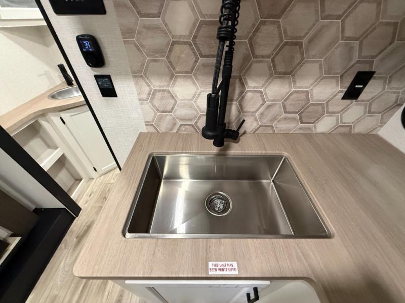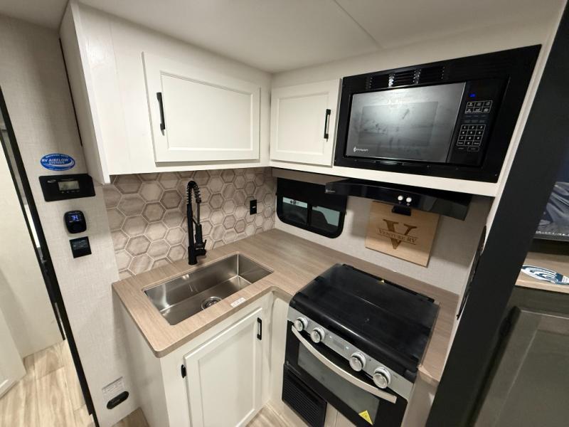 The Venture RV SportTrek Stinger travel trailers are built for both functionality and style, offering top-tier features for your comfort. With 3-sided double insulation, including radiant foil in the roof, floor, and front wall, you'll enjoy the climate control. The large pantry and extra cabinet storage ensure you have plenty of space for all your essentials, while the 12V 8 cu. ft. refrigerator keeps your groceries fresh on the road. For safety and ease, the trailer includes Dexter axles with self-adjusting brakes and a prewired tire monitor system, giving you peace of mind while you travel. Plus, the modern farmhouse interior design, featuring hardwood cabinet doors and a beautiful wooden hexagon backsplash, makes every meal and moment feel special.