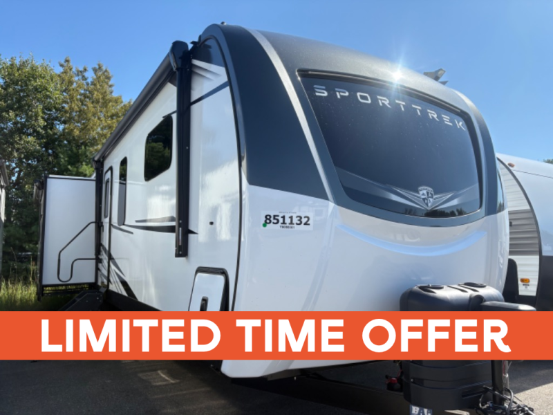 An elegant design and new features come with every one of these Venture RV SportTrek Touring Edition travel trailers! The NXG Huck bolt frame holds these units together and a walkable roof covers them. Heads will turn down the highway and at the campsite with an upgraded graphics package and a painted fiberglass front cap with integrated LED light. The exterior pass-through storage area has slam latch baggage doors with magnetic catches so you don't have to worry about them closing on you and a motion activated light to see your items clearly even at night. Luxury abounds throughout these units, especially with the mandatory Interior Luxury package which comes with solid surface kitchen countertops, designer valances with fabric nightshades, two 30" frameless fireplaces, and Beauflor wood plank flooring that is easy to clean. Come find your favorite model today!