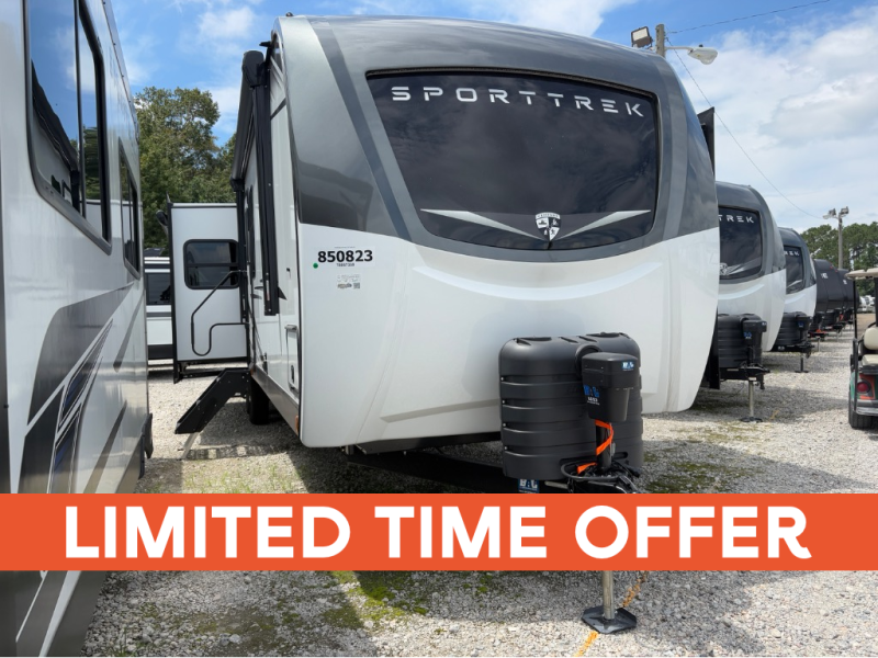 An elegant design and new features come with every one of these Venture RV SportTrek Touring Edition travel trailers! The NXG Huck bolt frame holds these units together and a walkable roof covers them. Heads will turn down the highway and at the campsite with an upgraded graphics package and a painted fiberglass front cap with integrated LED light. The exterior pass-through storage area has slam latch baggage doors with magnetic catches so you don't have to worry about them closing on you and a motion activated light to see your items clearly even at night. Luxury abounds throughout these units, especially with the mandatory Interior Luxury package which comes with solid surface kitchen countertops, designer valances with fabric nightshades, two 30" frameless fireplaces, and Beauflor wood plank flooring that is easy to clean. Come find your favorite model today!