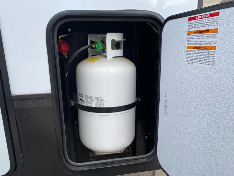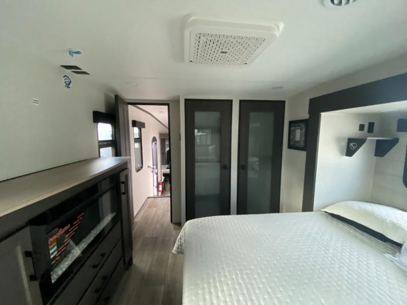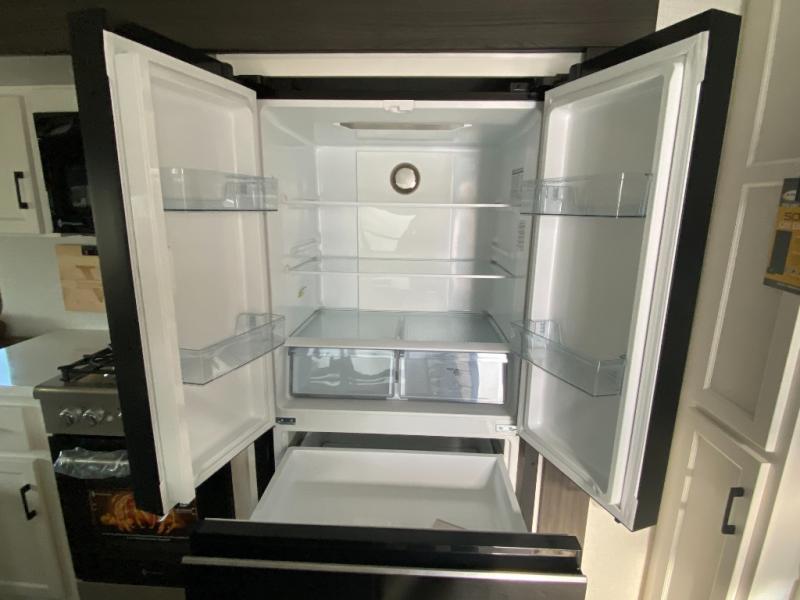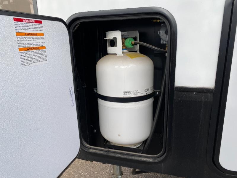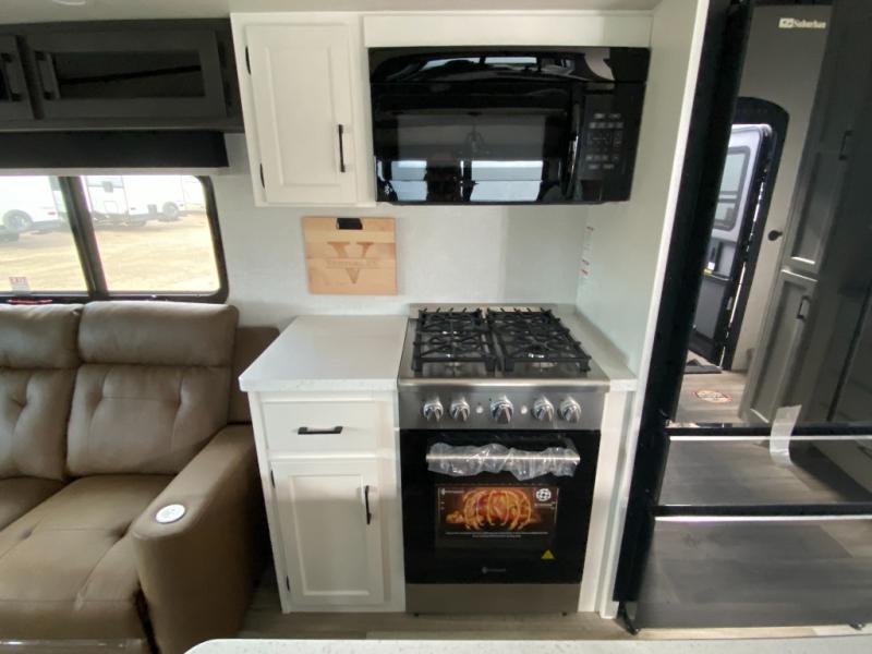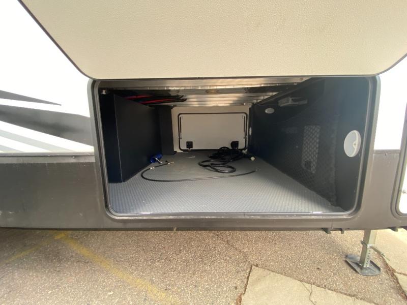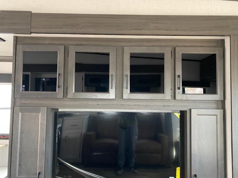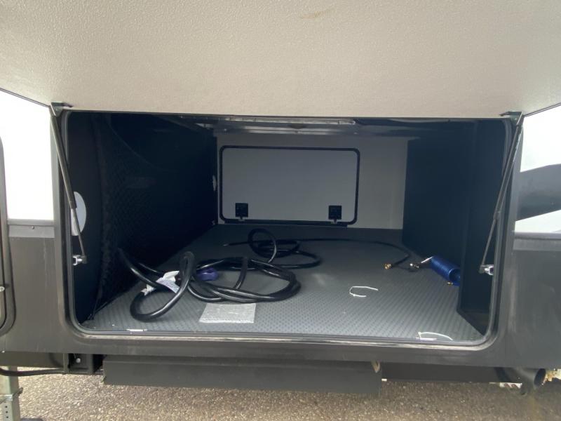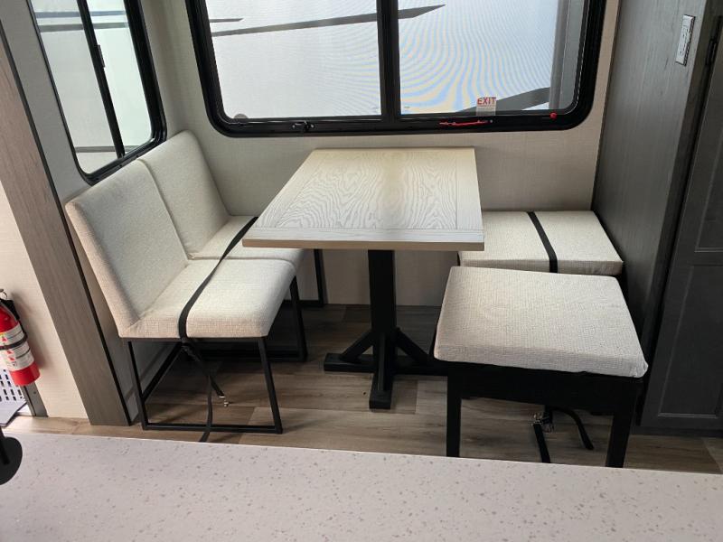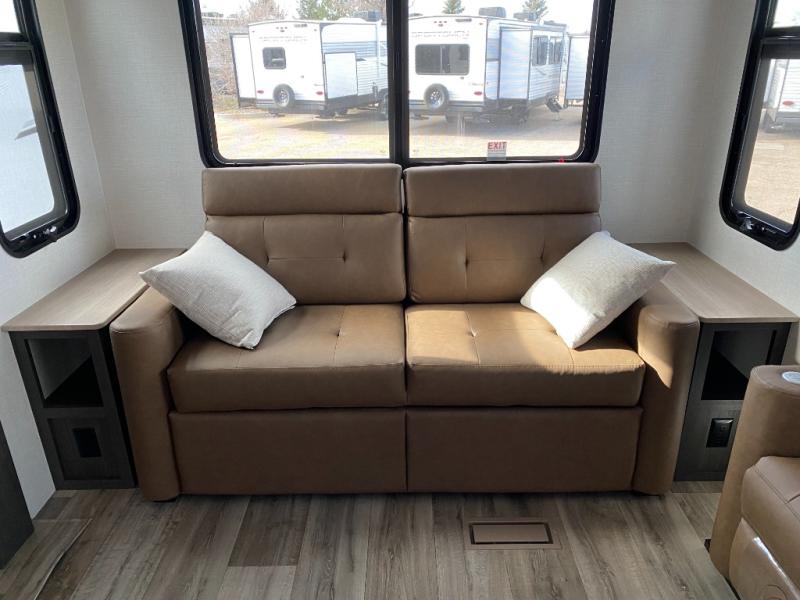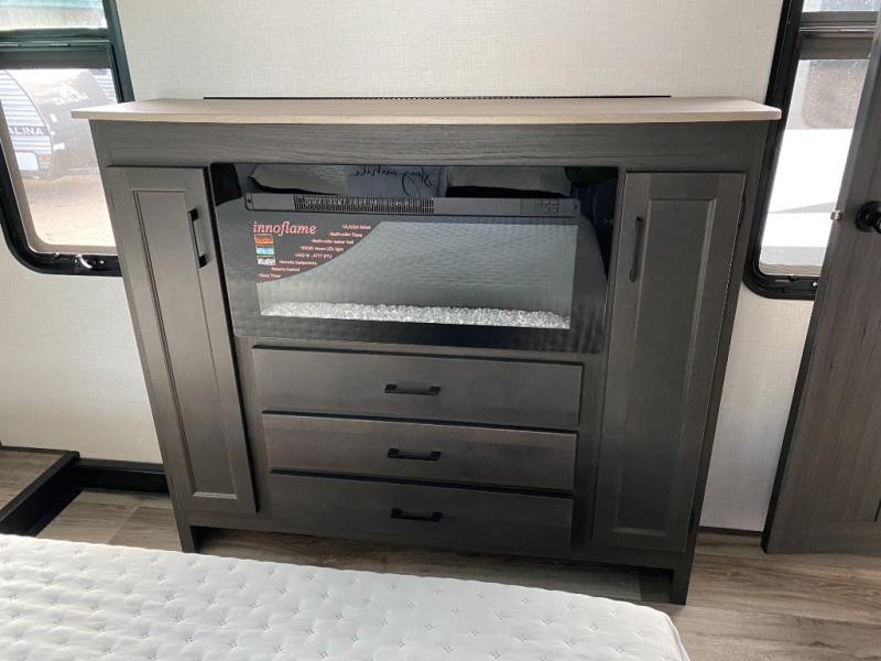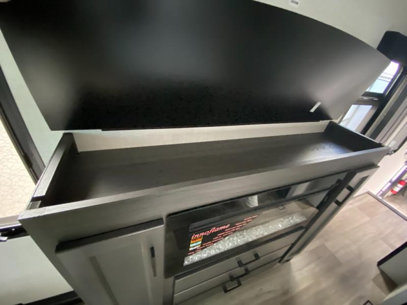 You won't even feel like you're camping in this fifth wheel! The front private bedroom has a Serta king mattress to lay your head on at night, a window seat to comfortably read a book while enjoying the 5,000 BTU fireplace, a shelf storage closet, and a prepped area for a washer and dryer. Freshen up each morning with the 48" fiberglass shower in the full bathroom then head down the floating steps with shoe storage to whip up a delicious breakfast. The fully equipped kitchen even comes with a 18" GE stainless steel dishwasher at the kitchen island for easy clean up. Enjoy your meals at the table with two chairs and two Versa benches. You could even cook at the outside campfire cafe with the griddle. Inside the rear living area, you will find a 70" tri-fold sofa with end tables and theater seating with USB charging across from the entertainment center with a 5,000 BTU fireplace!