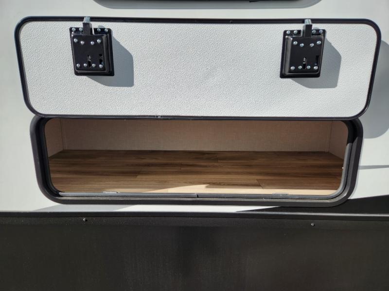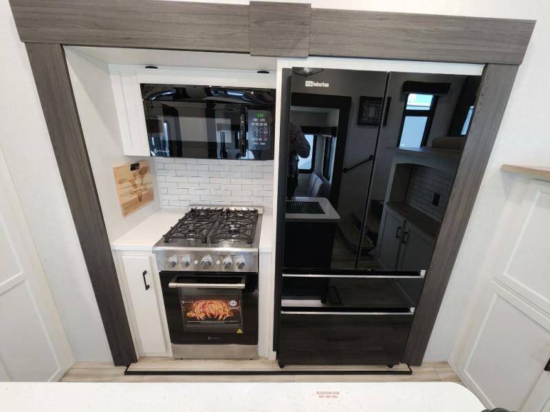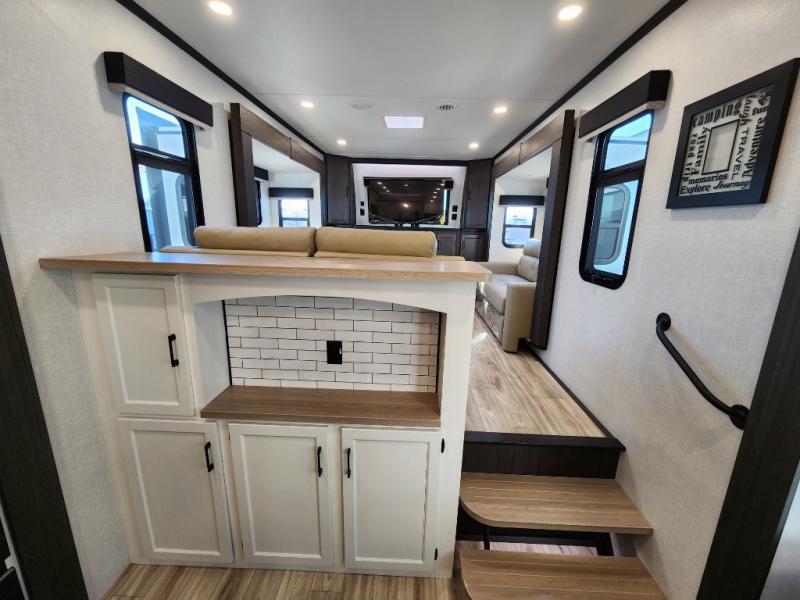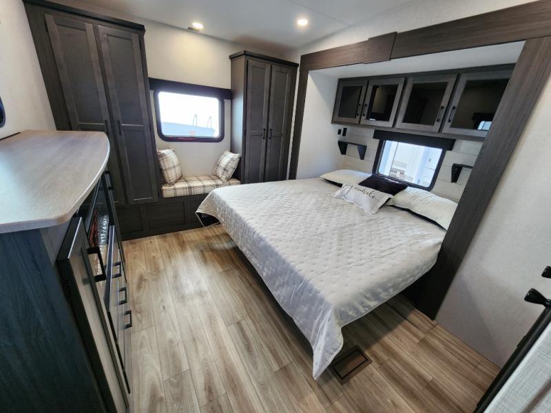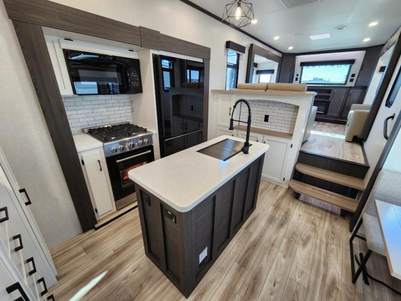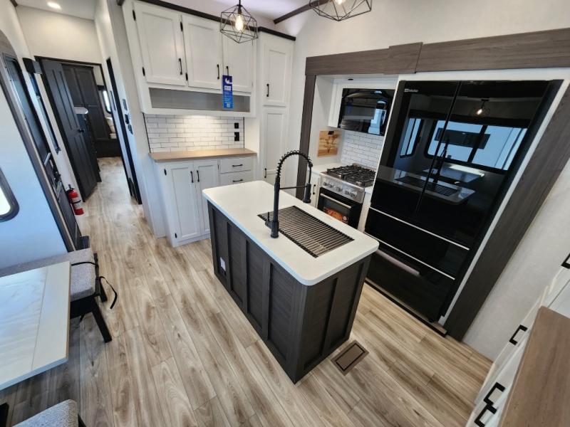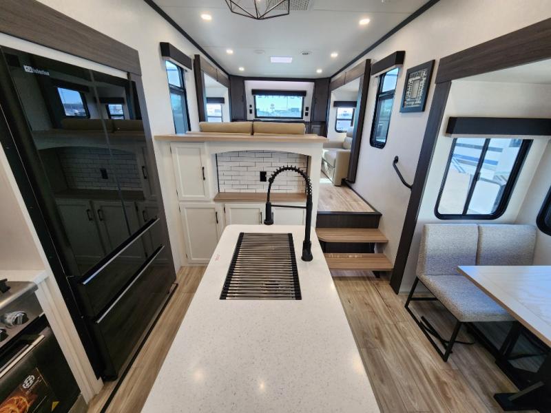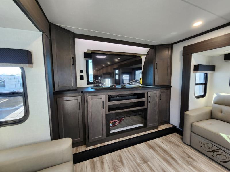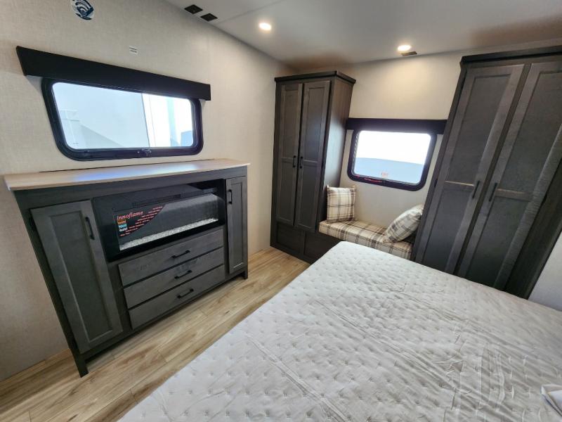 Imagine unwinding in a space that's equal parts cozy retreat and adventure hub. The king bed beckons you to relax, with a bench in the wardrobe area for extra seating. Ample storage in the wardrobe, dresser, and closet means you can bring all your essentials. The full bathroom features a sleek fiberglass shower, perfect for refreshing after a day of exploring. Furthermore, the kitchen is a dream: two hutches for dishes and decor, a pantry for storage, a three-burner cooktop for meals, and an 18 cu fridge. The kitchen island adds extra prep space, and the table with chairs plus two versa benches equals flex space for dining or games. In the living area, theater seating and two tri-fold sofas —perfect for cozy nights in. Along with the sofa, the fireplace offers warm and fuzzy vibes, and the 50” TV means entertainment galore.