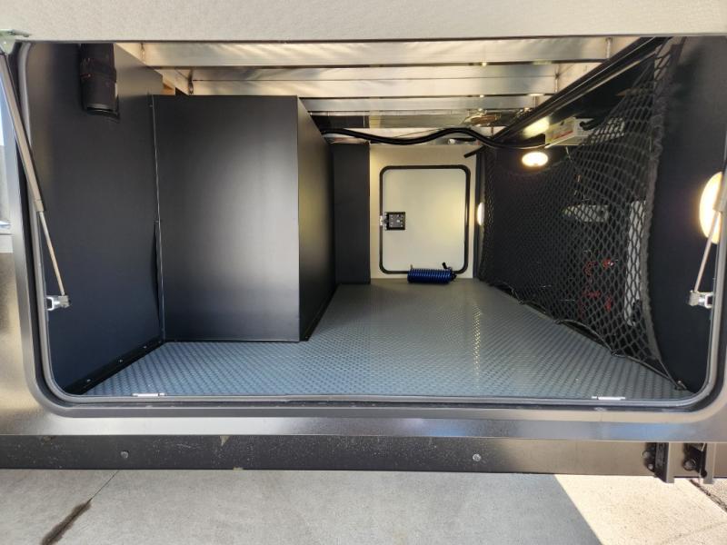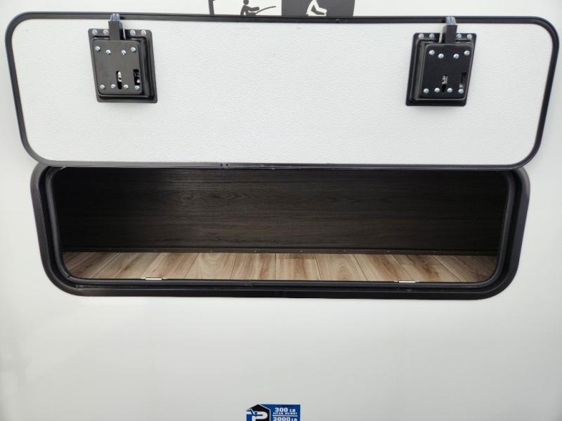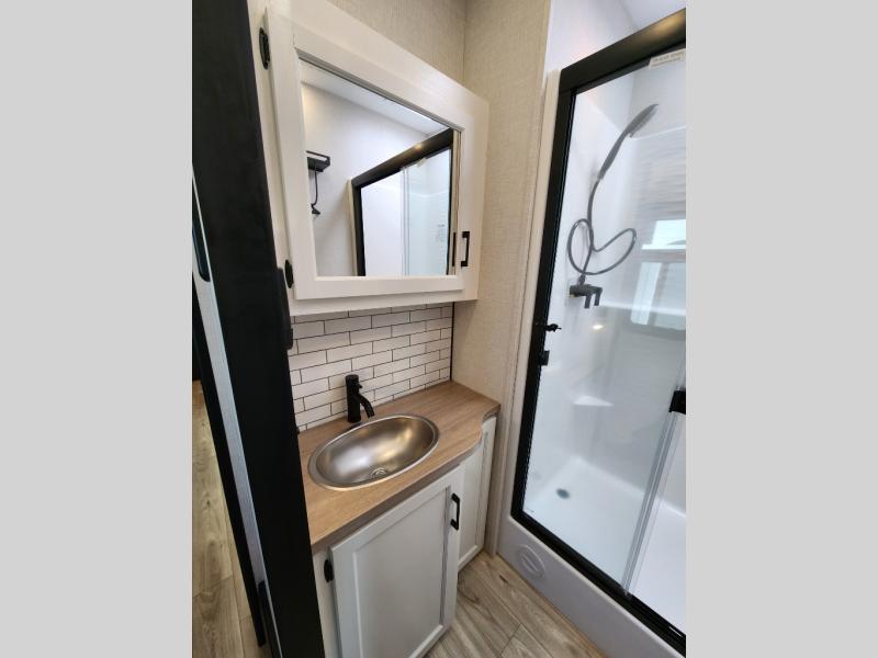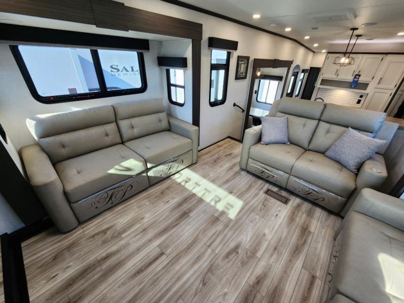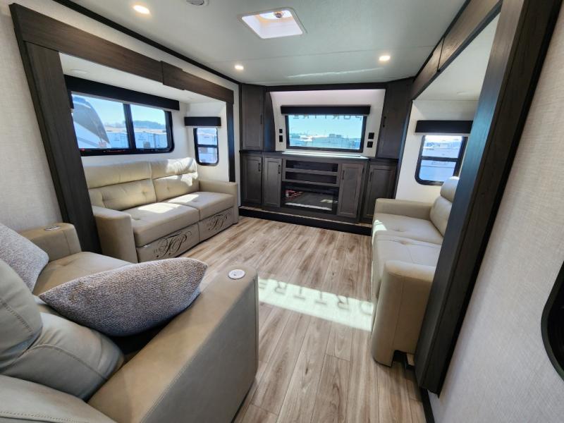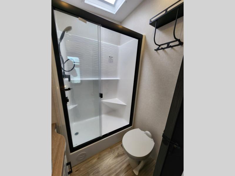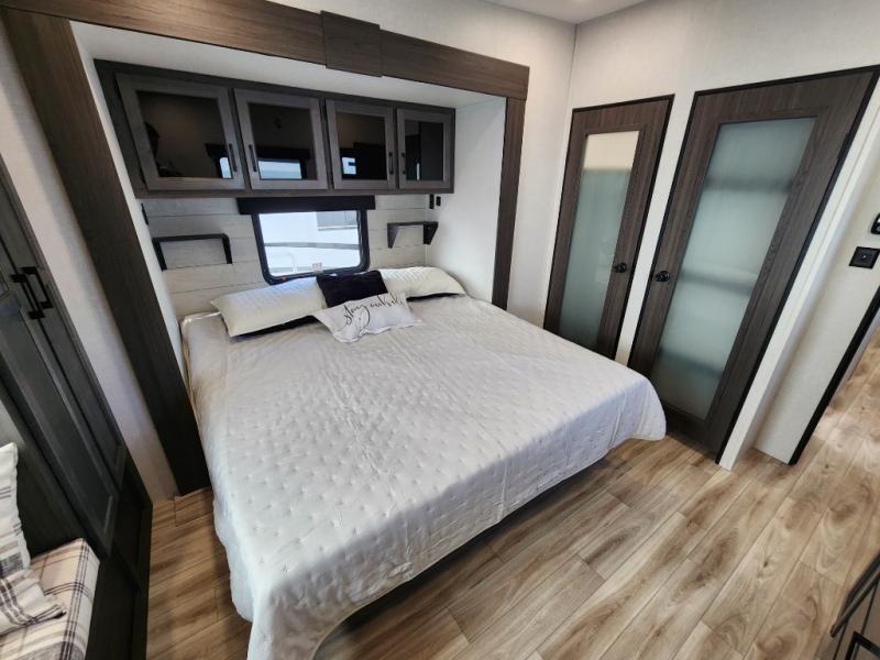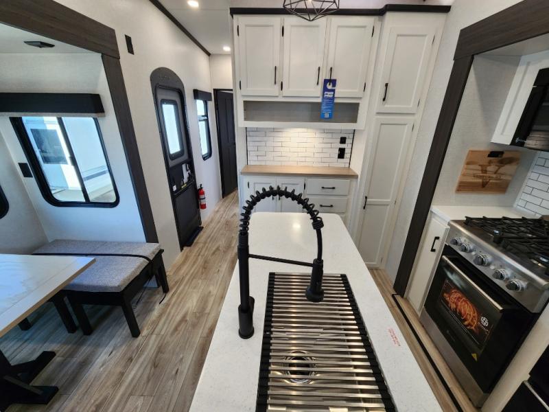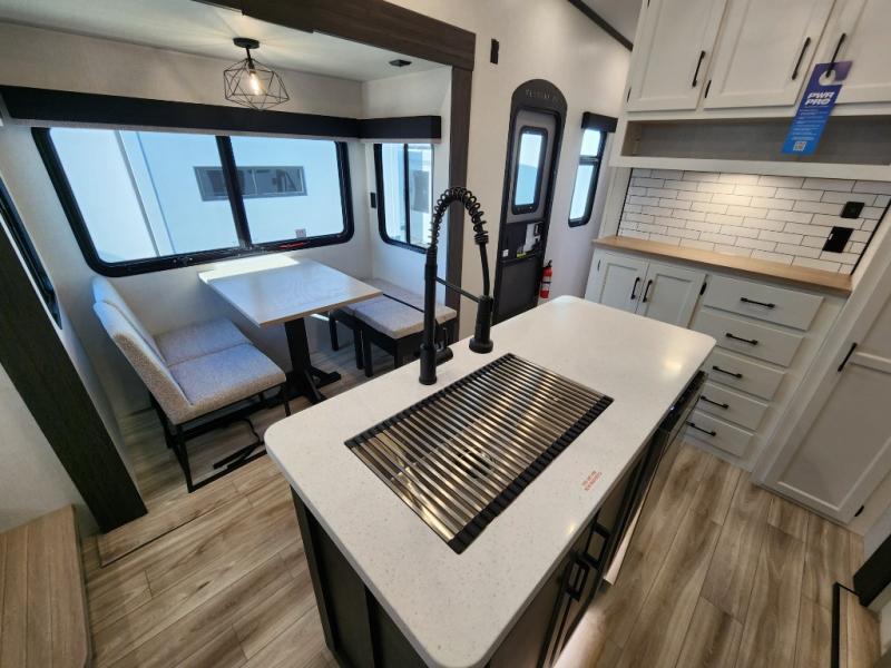 Imagine unwinding in a space that's equal parts cozy retreat and adventure hub. The king bed beckons you to relax, with a bench in the wardrobe area for extra seating. Ample storage in the wardrobe, dresser, and closet means you can bring all your essentials. The full bathroom features a sleek fiberglass shower, perfect for refreshing after a day of exploring. Furthermore, the kitchen is a dream: two hutches for dishes and decor, a pantry for storage, a three-burner cooktop for meals, and an 18 cu fridge. The kitchen island adds extra prep space, and the table with chairs plus two versa benches equals flex space for dining or games. In the living area, theater seating and two tri-fold sofas —perfect for cozy nights in. Along with the sofa, the fireplace offers warm and fuzzy vibes, and the 50” TV means entertainment galore.