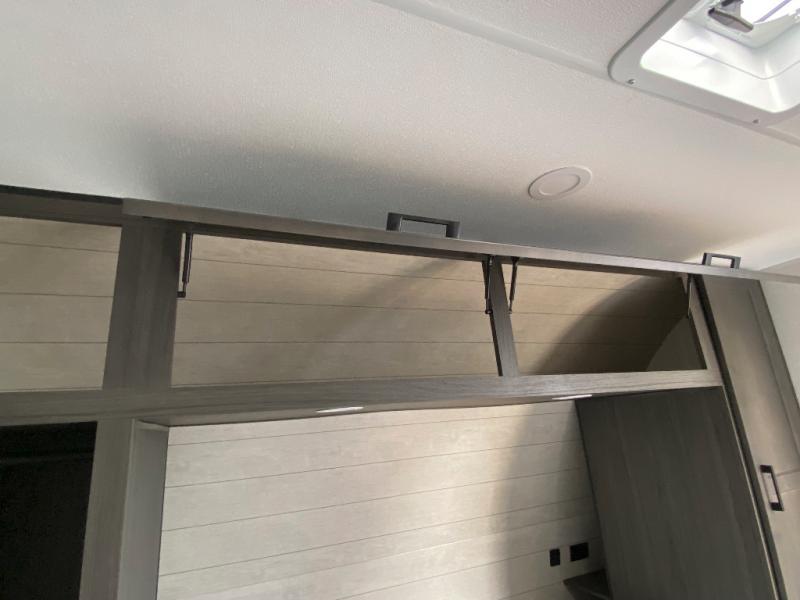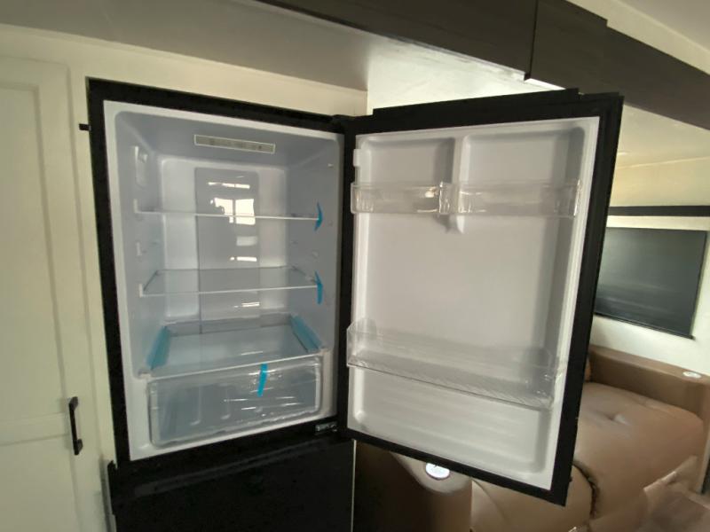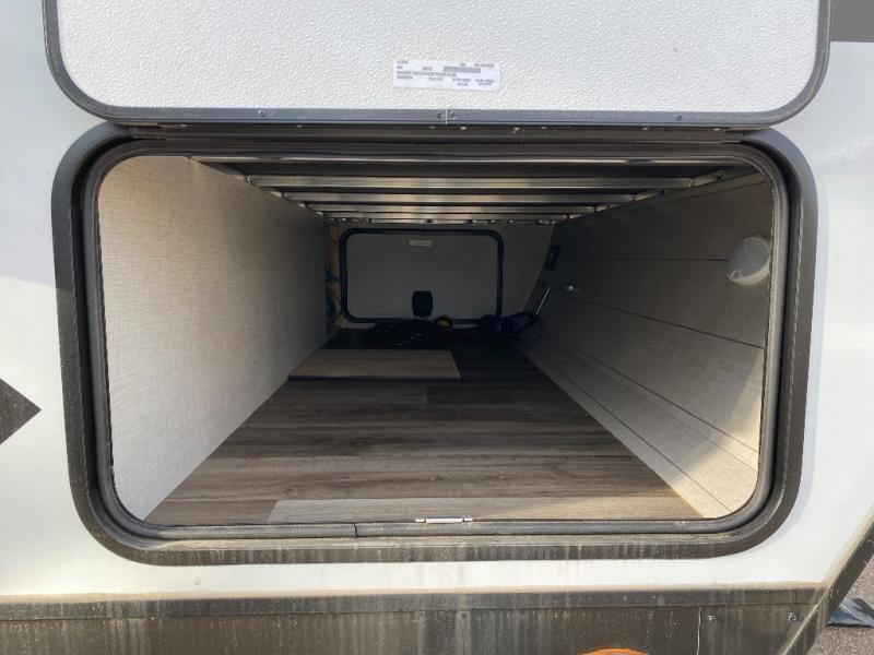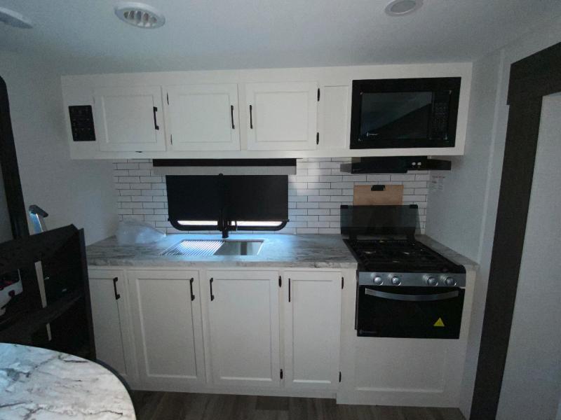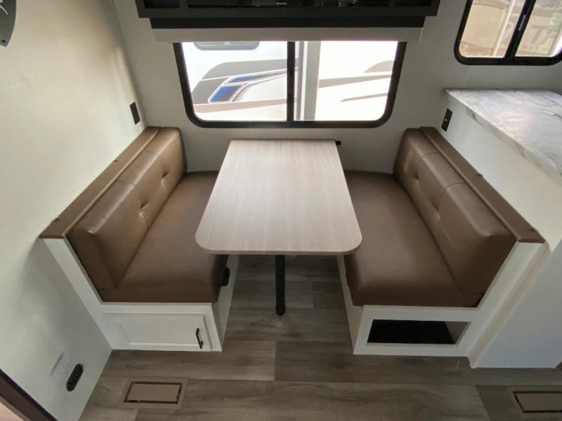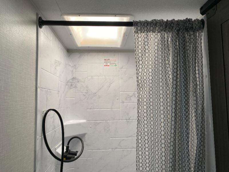 Sleep tight on the road! This travel trailer is special for four. First we have the 60" x 80" queen bed, and two people can easily fit on the sit n' slide dinette. Cook delicious dinner in the incredible kitchen. The counter includes a stainless steel sink with cover and dish drying racks, three cooktop burner, and an overhead cabinet. There is also a 10 cu. fridge and pantry for food storage. You can also have a relaxing time on the theater seating with USB port on each side. Store your belongings in the dual wardrobe beside the bed and also on the pass thru storage. Finally, take a relaxing bath in the walk thru bathroom furnished with a 30" x 36" shower.