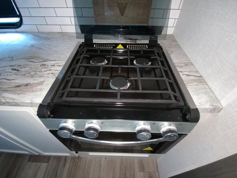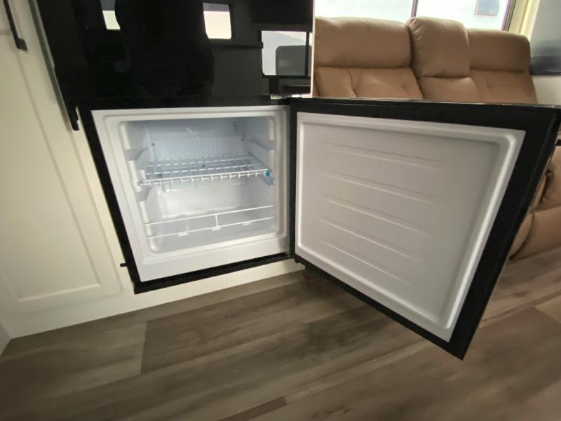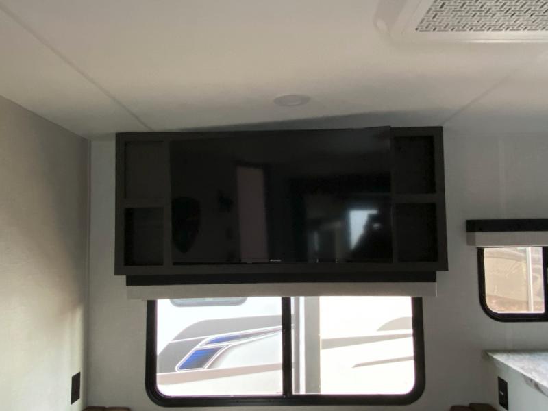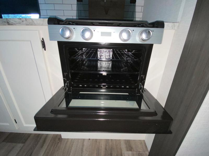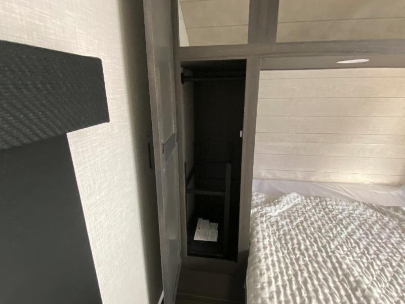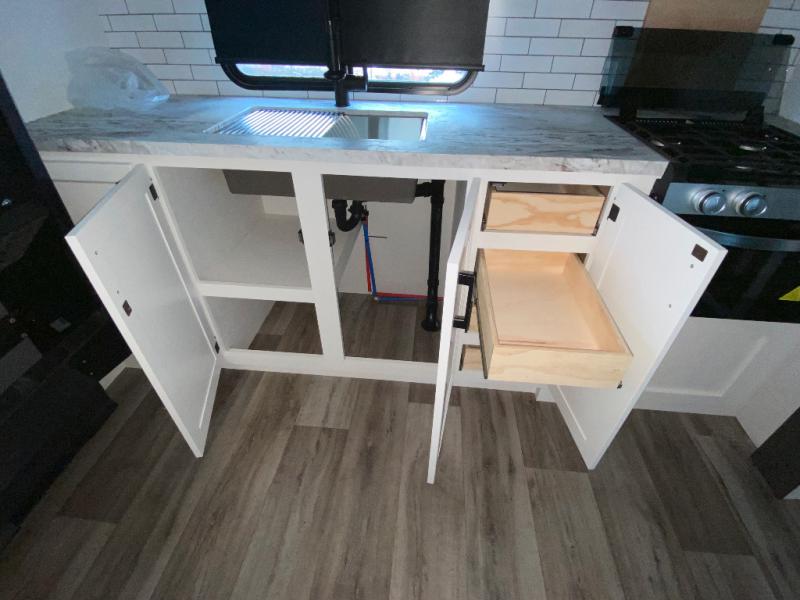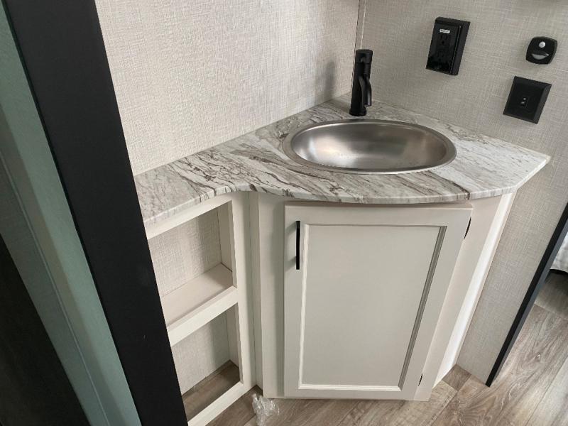 Sleep tight on the road! This travel trailer is special for four. First we have the 60" x 80" queen bed, and two people can easily fit on the sit n' slide dinette. Cook delicious dinner in the incredible kitchen. The counter includes a stainless steel sink with cover and dish drying racks, three cooktop burner, and an overhead cabinet. There is also a 10 cu. fridge and pantry for food storage. You can also have a relaxing time on the theater seating with USB port on each side. Store your belongings in the dual wardrobe beside the bed and also on the pass thru storage. Finally, take a relaxing bath in the walk thru bathroom furnished with a 30" x 36" shower.