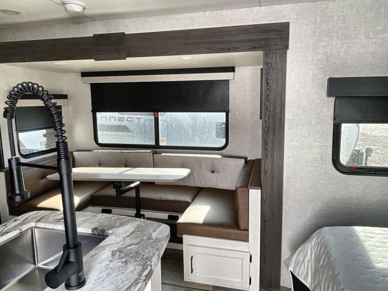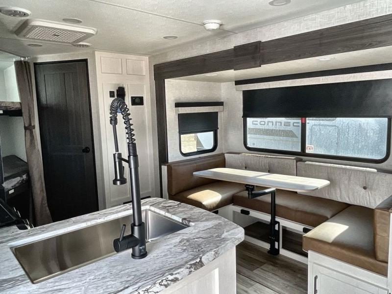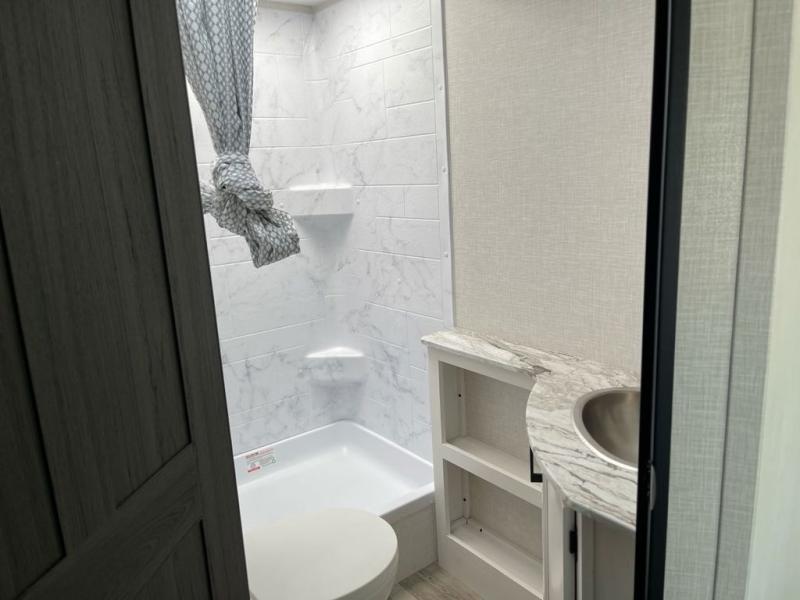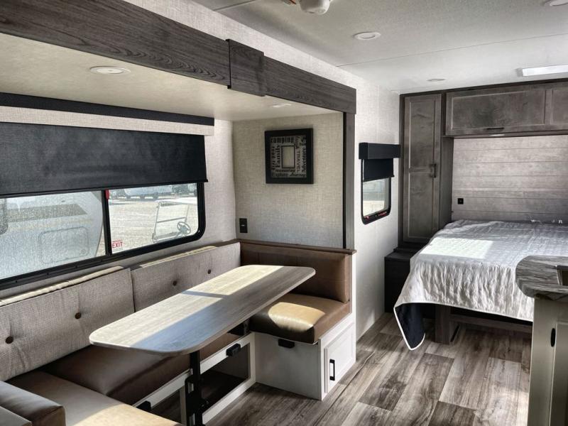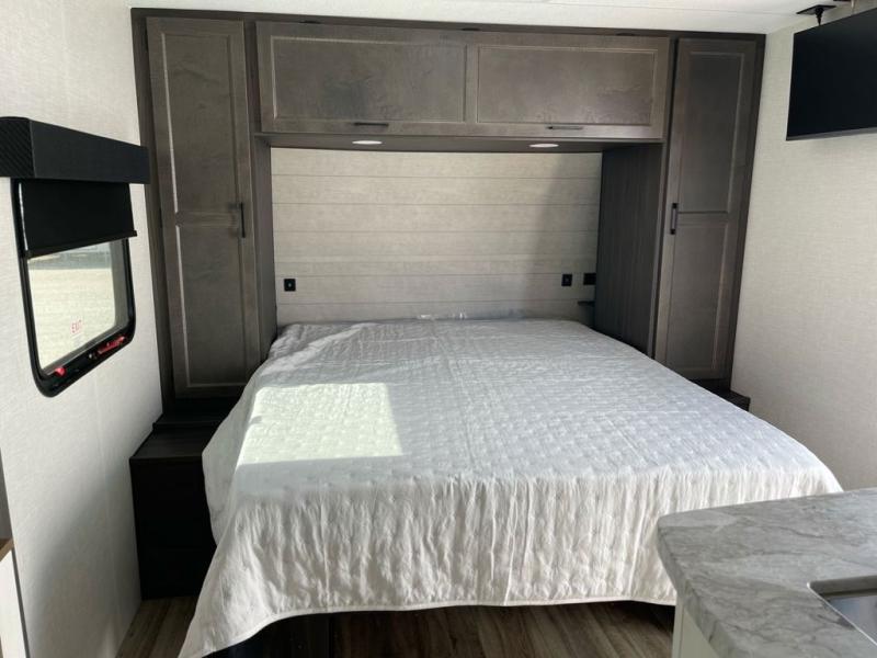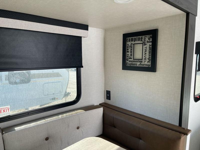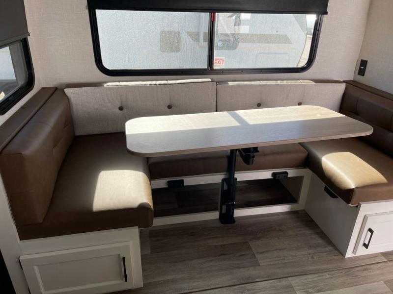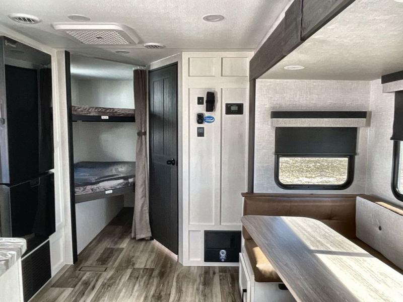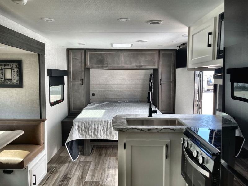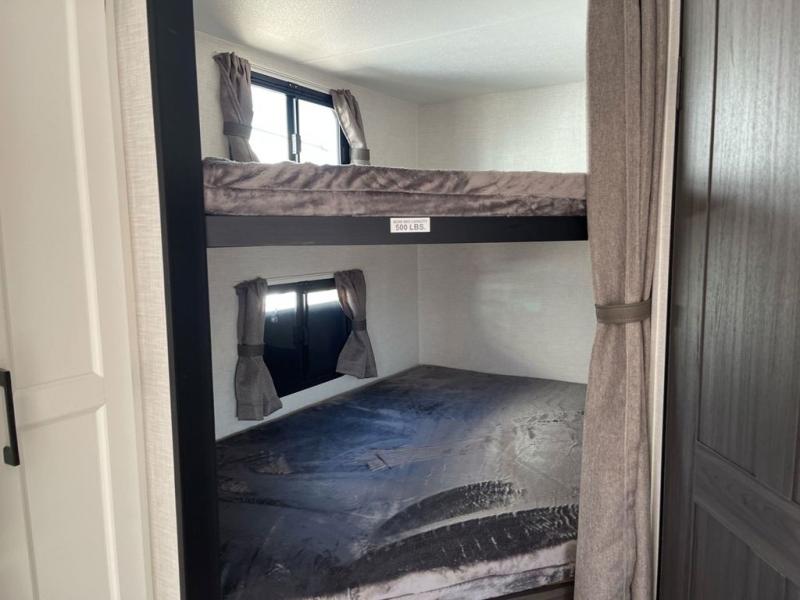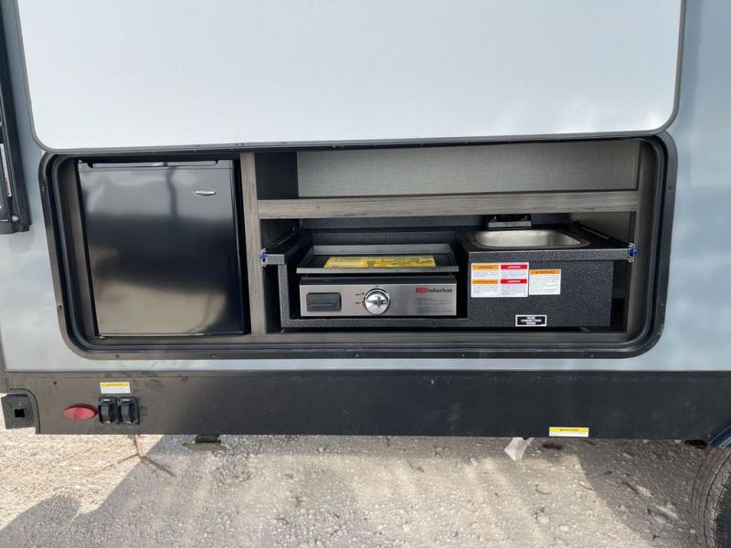 Sleep tight with your family on the road! This travel trailer is special for the whole family since it has plenty of space for sleep. First we have the 60" x 80" queen bed, the 51" x 75" double size bunk bed, and you can also sleep two people on the 88" x 42" U shaped dinette. Cook delicious dinner in the incredible kitchen. The L-shape counter includes stainless steel sink with cover and dish drying racks, three cooktop burner, refrigerator, pantry and an overhead cabinet. However, you can also have an amazing cooking time outside thanks to the outdoor kitchen, ideal to share a meal with your family while enjoying nature and its surroundings. Store your belongings in the dual wardrobes beside the bed and also in the pass thru storage. Finally, take a relaxing bath in the full bathroom furnished with a 30" x 36" shower.