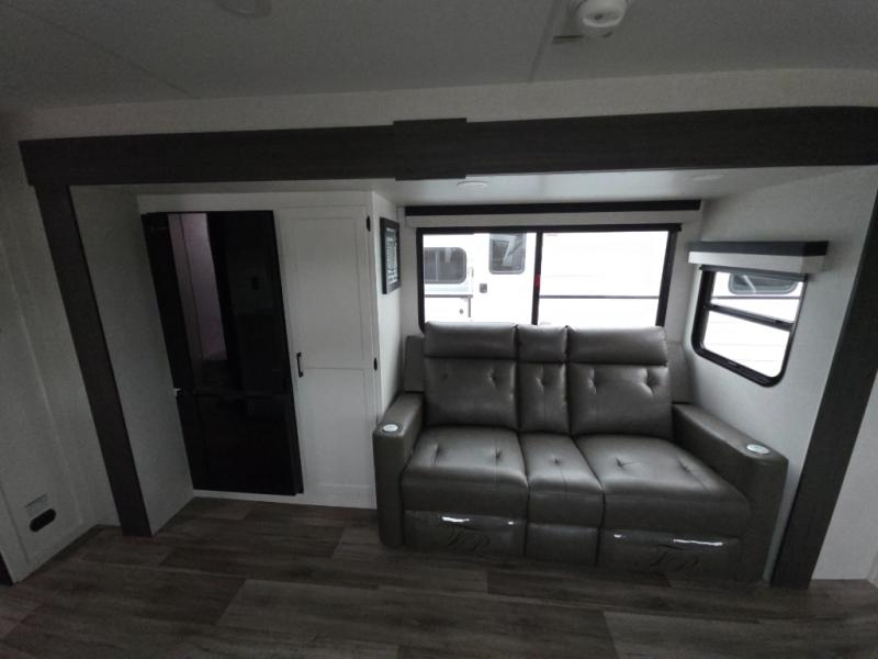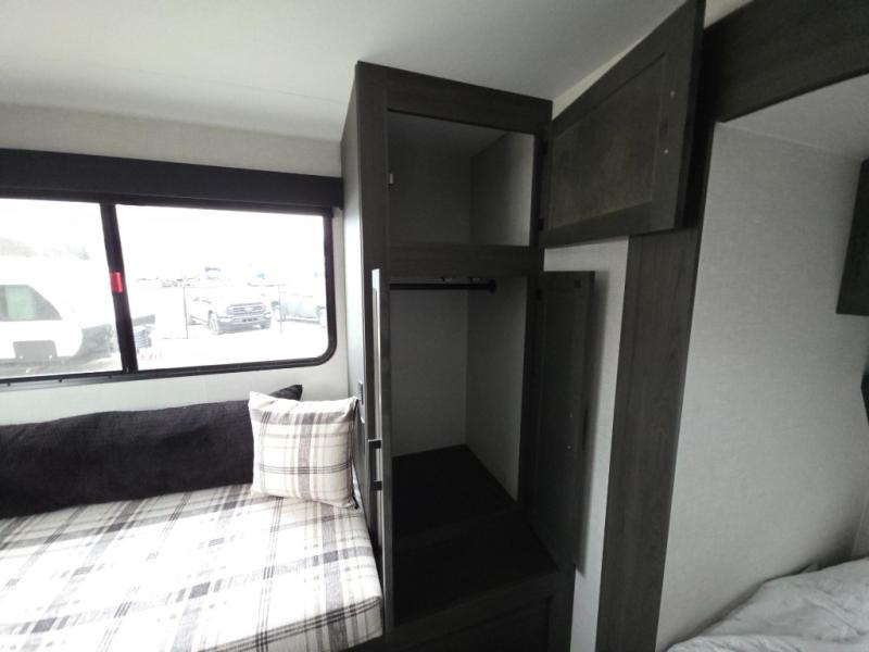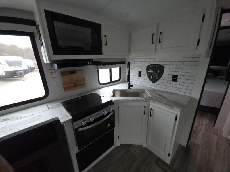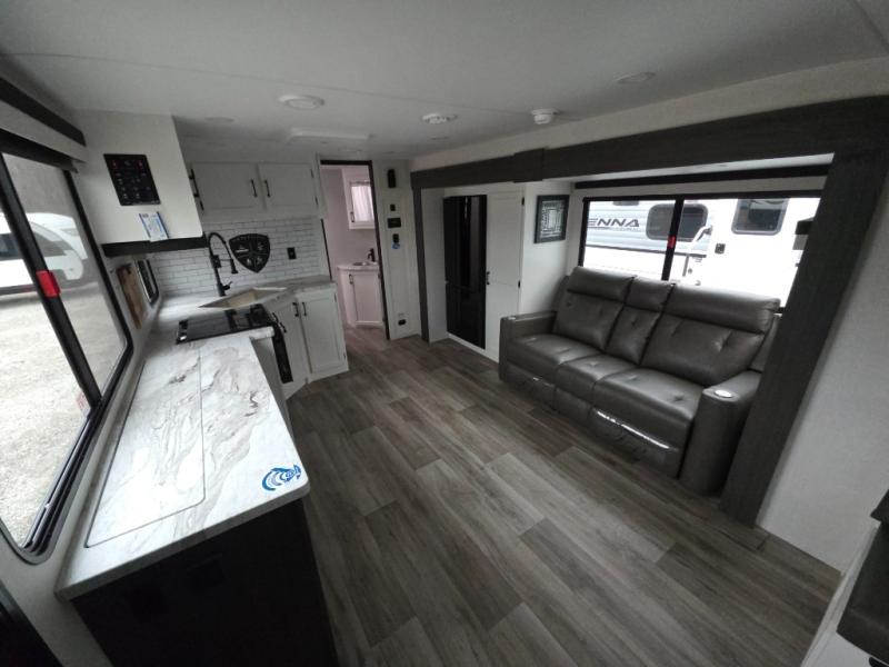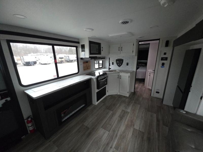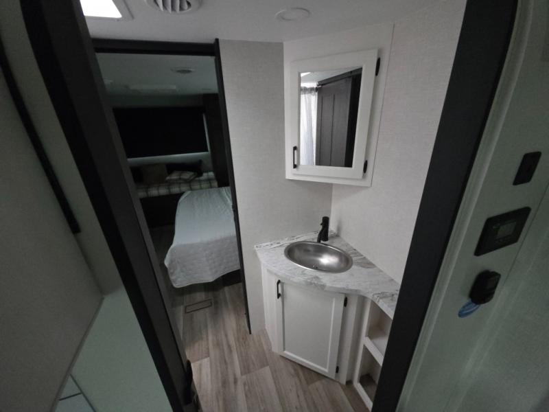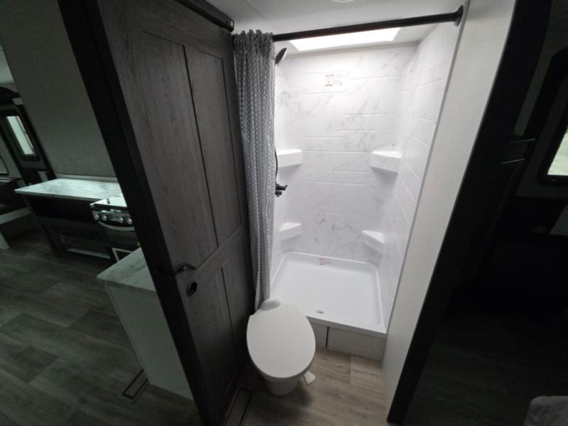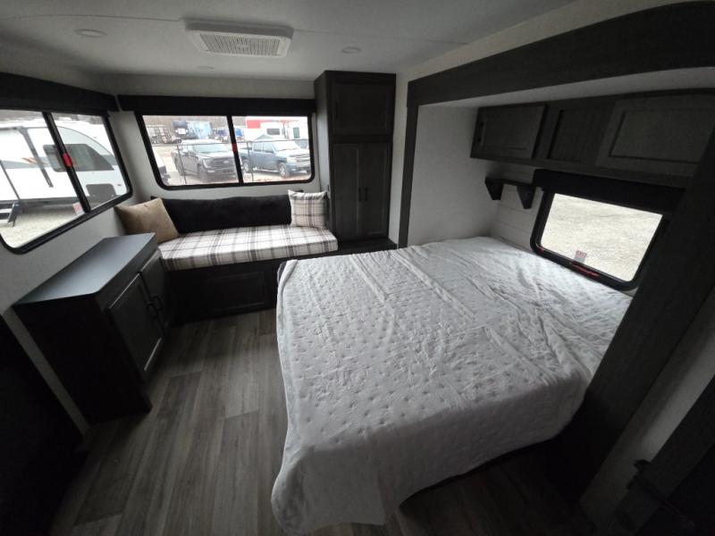 Sleep tight in this travel trailer with a sleep tight queen bed in the rear private bedroom! Freshen up each morning in the full bathroom featuring a 30" x 36" shower, then head to the kitchen and fry some eggs using the three burner cooktop. You can enjoy your meals at the front 88" x 42" U-shaped dinette, as well as transform it into an extra sleeping space when needed. The 70" sofa offers a comfortable place for an afternoon nap and for watching a movie with the entertainment center opposite. Behind the entertainment center there is a walk-in pantry with coat hooks for double use. Don't leave behind any outdoor gear, simply store it in the exterior pass-through storage area!