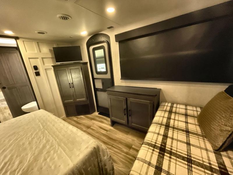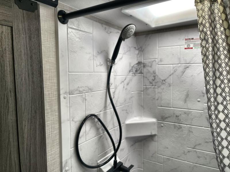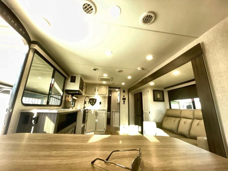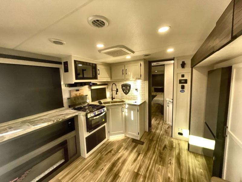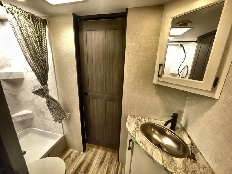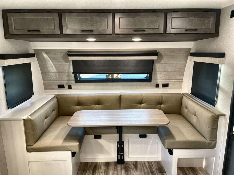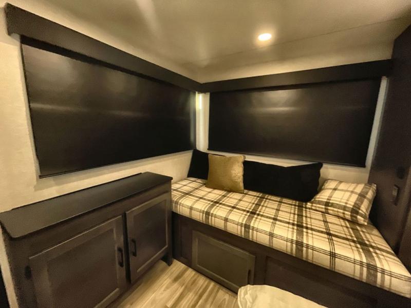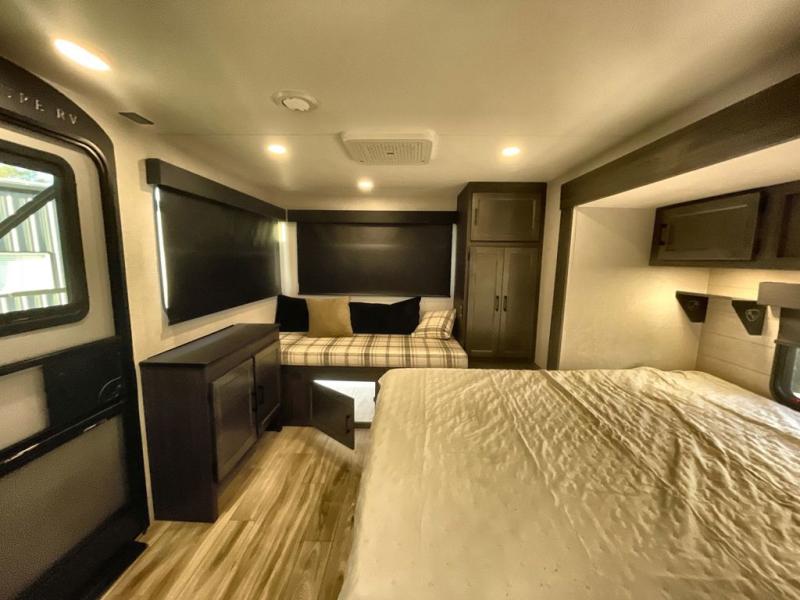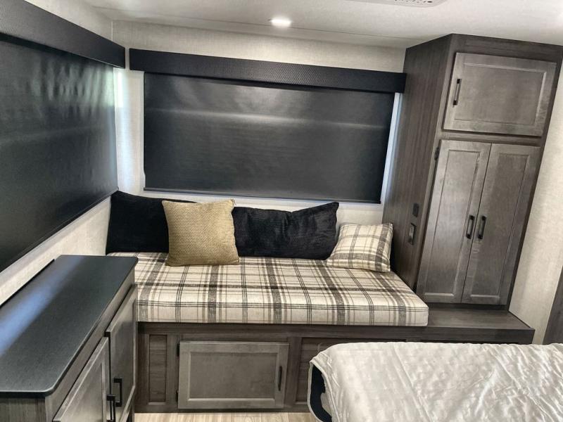 Step inside through one of the two entry doors and you’re welcomed into a thoughtfully designed living and dining area that blends comfort and functionality. At the front, a spacious 42" x 80" U-dinette with a swivel table offers plenty of room to enjoy meals, gather with friends, or play board games. In the slide-out, theater seating with built-in USB ports provides a cozy place to relax, it is next to the 10 cu. ft. refrigerator and pantry for easy access to groceries and dry goods. Across, the kitchen is equipped with essentials including a large stainless steel sink, three-burner cooktop, and ample overhead cabinetry for snacks and cookware. Unwind in the evening with the fireplace and 50" raise-and-lower TV, perfect for movie nights after a day of adventure. The walk-through bathroom features a 30" x 36" shower, making it easy to get ready for the day. At the rear, the bedroom offers a 60" x 80" Sleep Tight queen bed in a slide-out for extra walking space, along with a dresser and bench seat for added comfort. A second entry door in the bedroom provides convenient access for early mornings or quick trips outside.