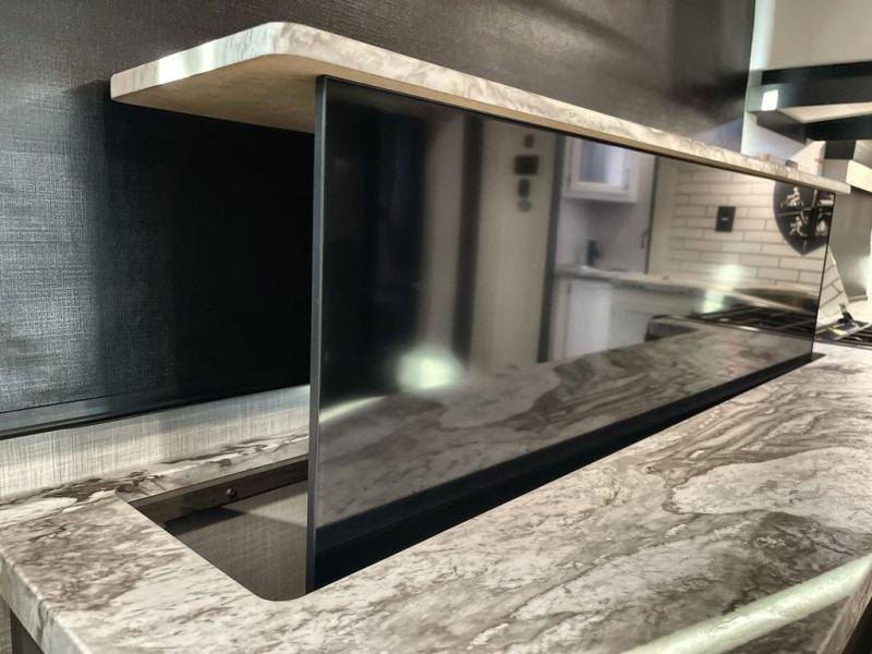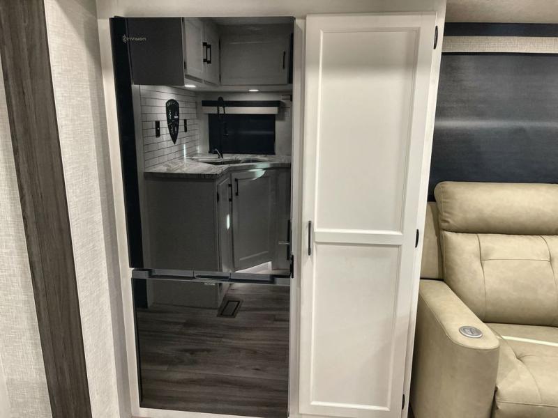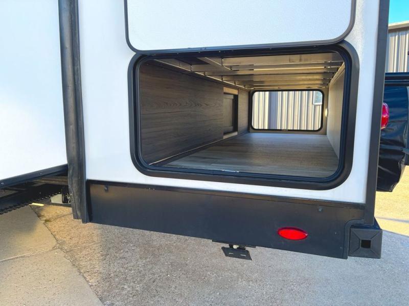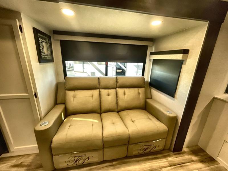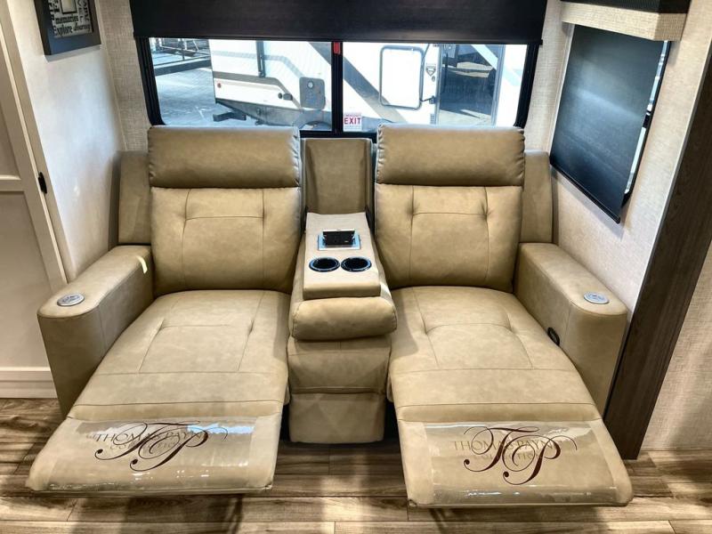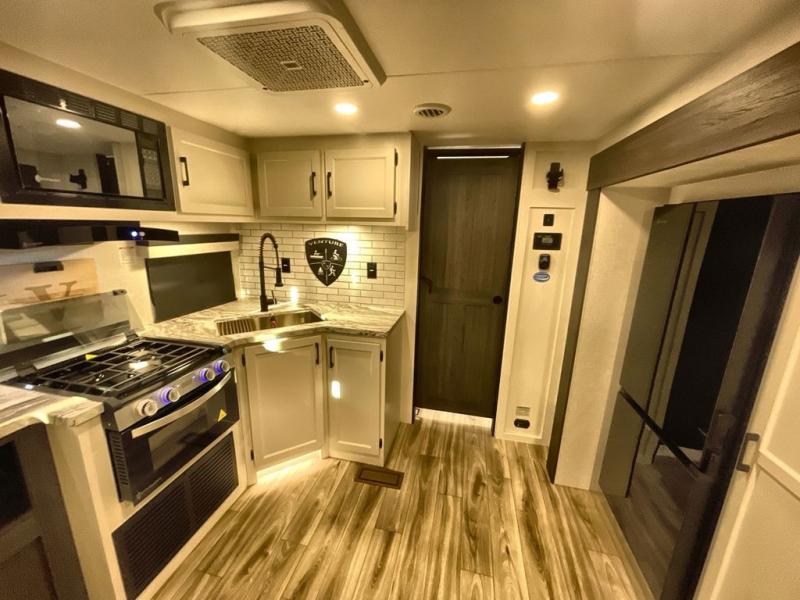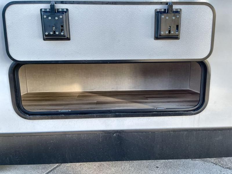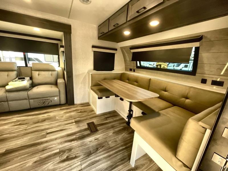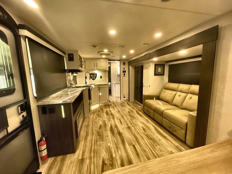Step inside through one of the two entry doors and you’re welcomed into a thoughtfully designed living and dining area that blends comfort and functionality. At the front, a spacious 42" x 80" U-dinette with a swivel table offers plenty of room to enjoy meals, gather with friends, or play board games. In the slide-out, theater seating with built-in USB ports provides a cozy place to relax, it is next to the 10 cu. ft. refrigerator and pantry for easy access to groceries and dry goods. Across, the kitchen is equipped with essentials including a large stainless steel sink, three-burner cooktop, and ample overhead cabinetry for snacks and cookware. Unwind in the evening with the fireplace and 50" raise-and-lower TV, perfect for movie nights after a day of adventure. The walk-through bathroom features a 30" x 36" shower, making it easy to get ready for the day. At the rear, the bedroom offers a 60" x 80" Sleep Tight queen bed in a slide-out for extra walking space, along with a dresser and bench seat for added comfort. A second entry door in the bedroom provides convenient access for early mornings or quick trips outside.